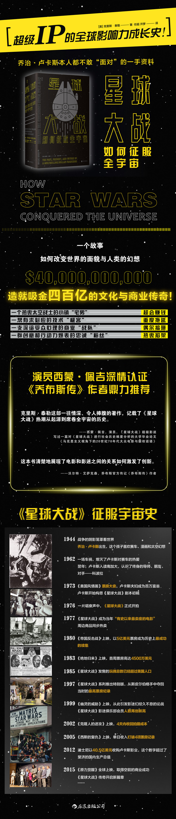 曾经被这部在过去两代人中最不朽的太空奇幻神话所触动的观众,无论他们是否像我一样,在电影公映之前就读过《星球大战》电影小说,或者因《西斯的复仇》而大喜过望,都将被泰勒充满激情地讲述的“传奇背后的传奇”所震撼:一个从穷乡僻壤走出来的孤独的小工匠,如何通过星际英雄主义改变了全世界。在此提醒《星球大战》的狂热影迷和那些想了解现代流行文化的读者,本书绝对就是你们正在寻找的东西。