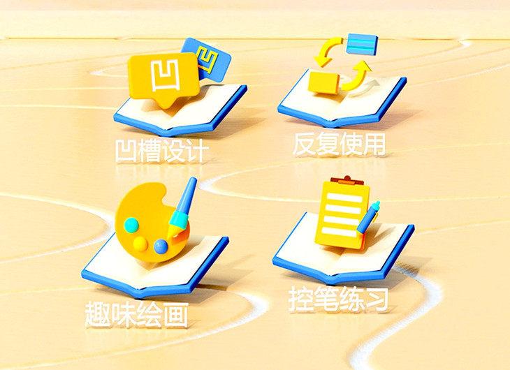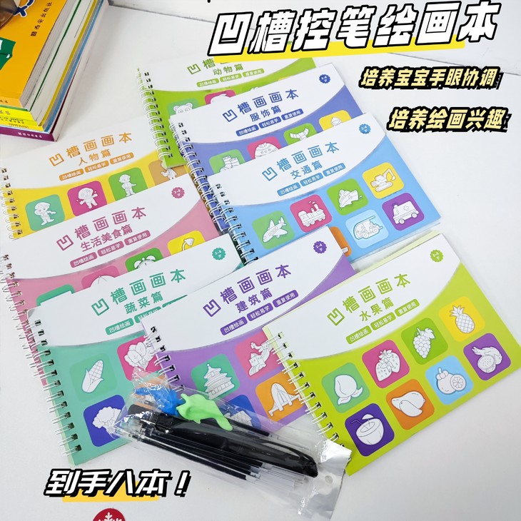 凹槽控笔绘画本8册 ✅送2个握笔器+1根笔杆+10根笔芯; ✅带凹槽控笔轻松! ✅消失墨水一本可以反复练