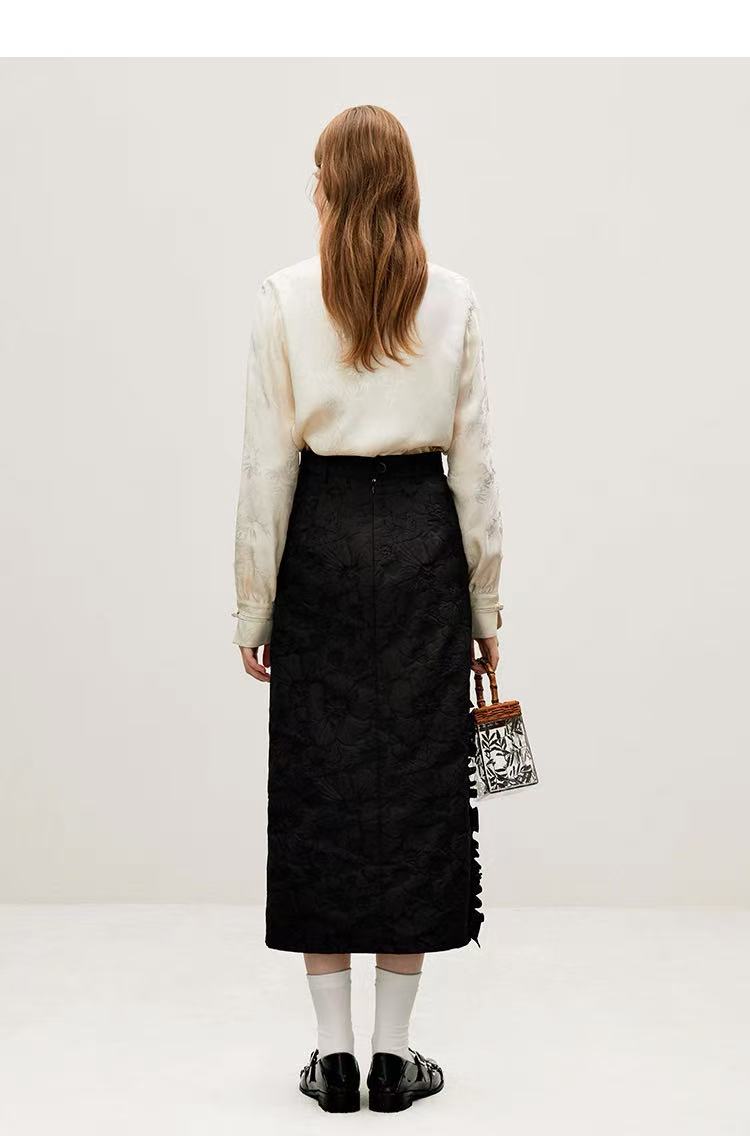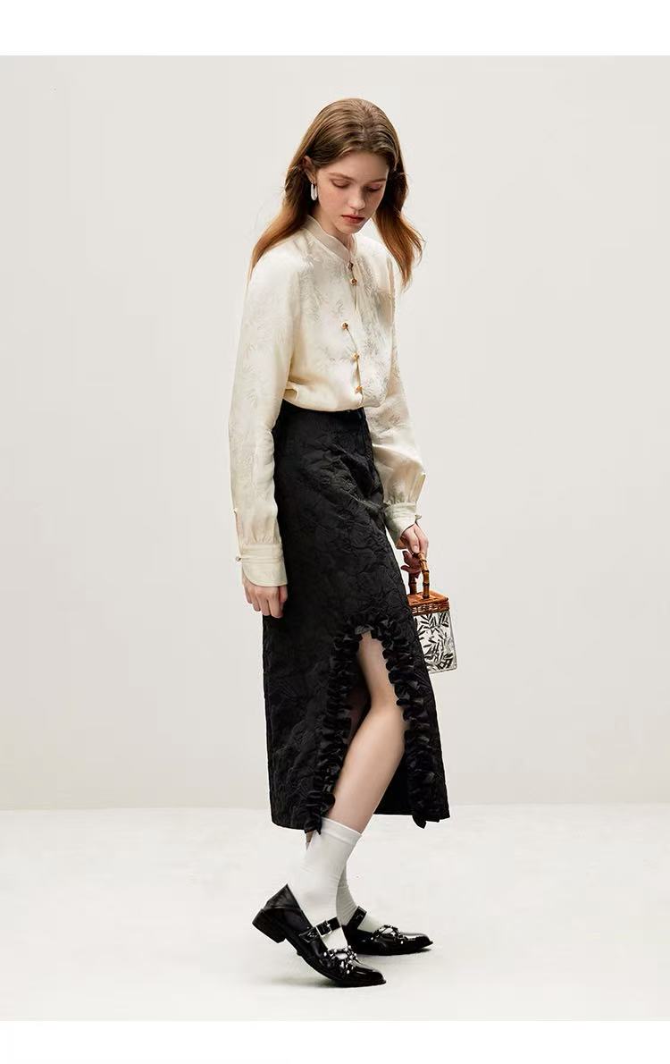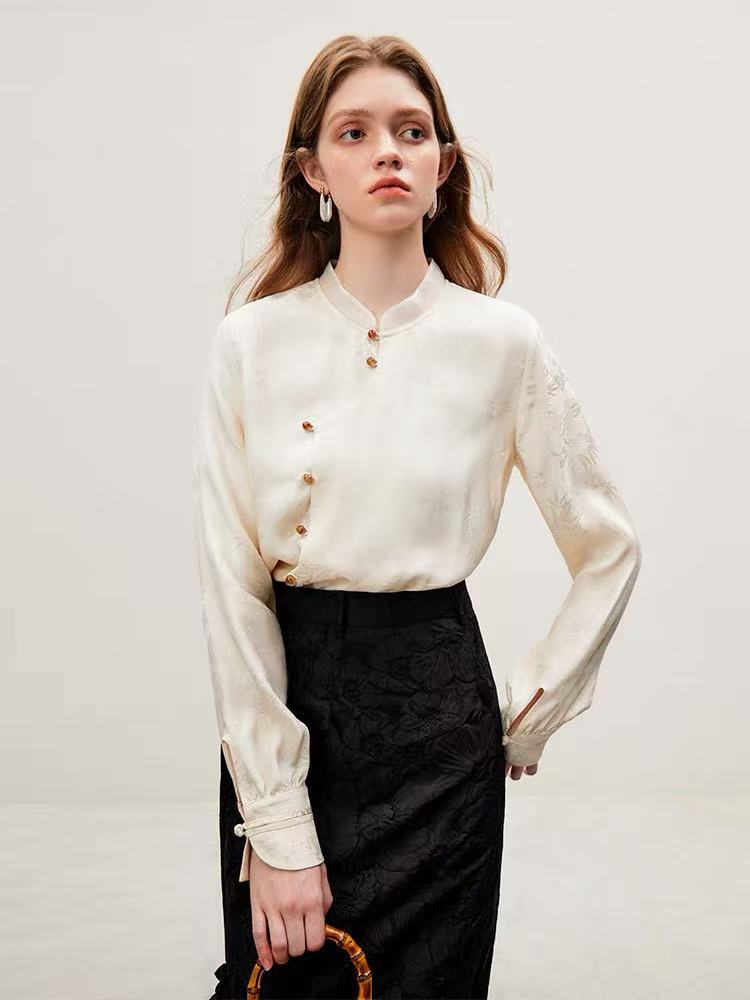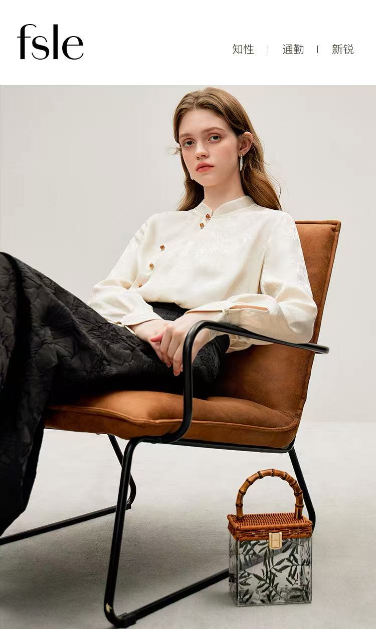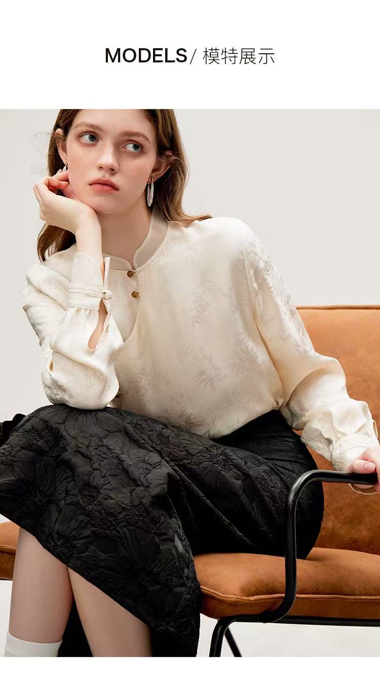 【新品推荐】瑟俪品牌-9902竹叶暗纹提花琥珀色扣长袖小衫-喜出