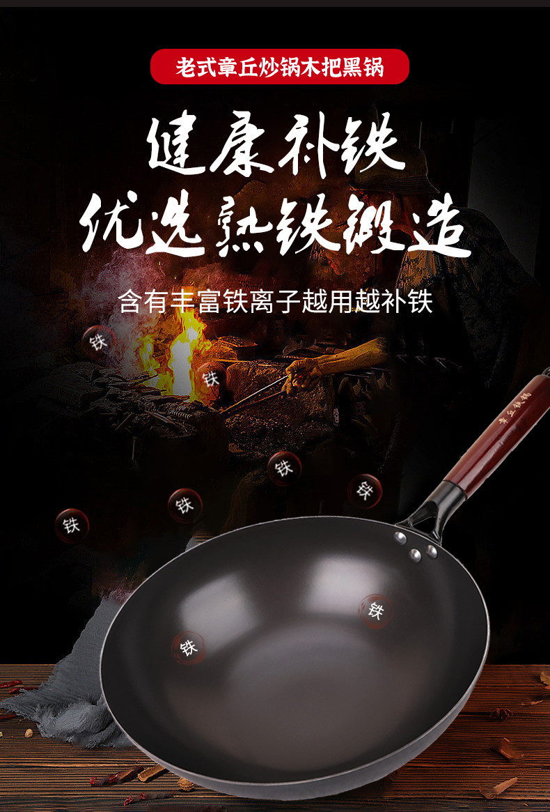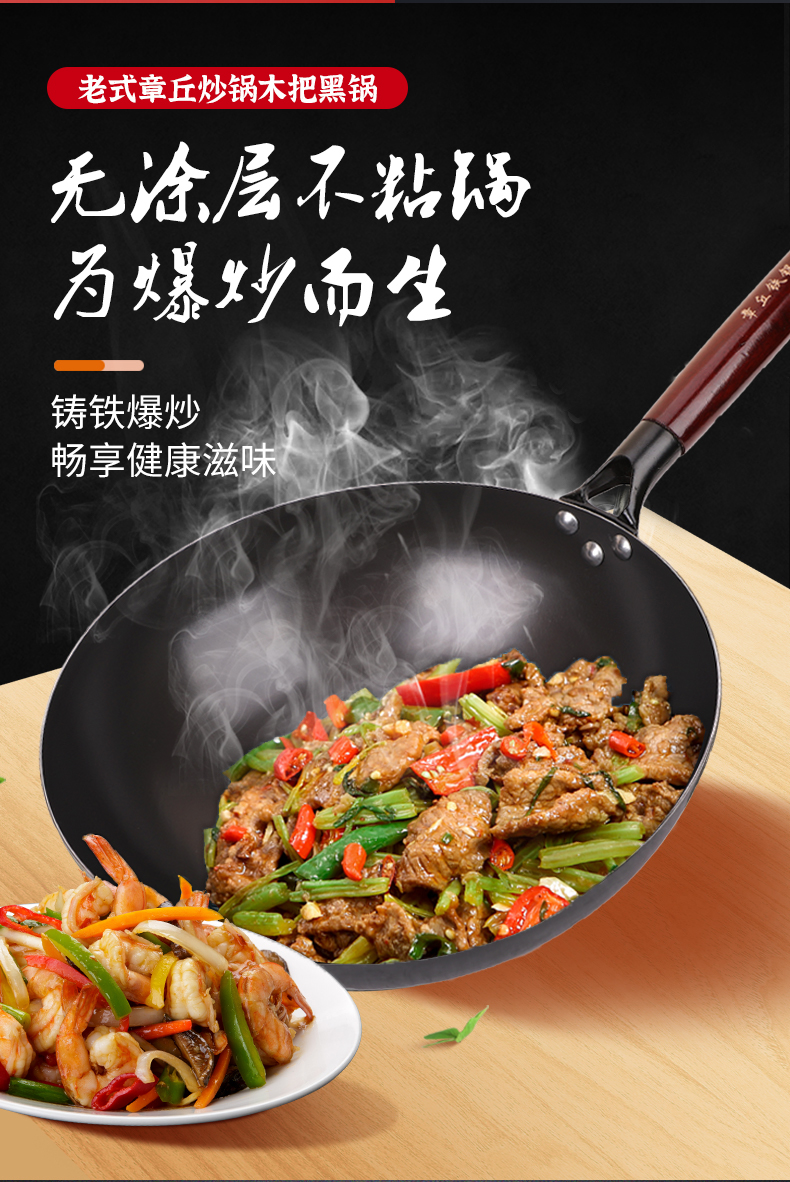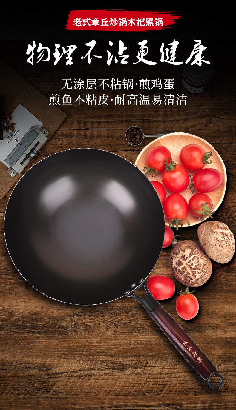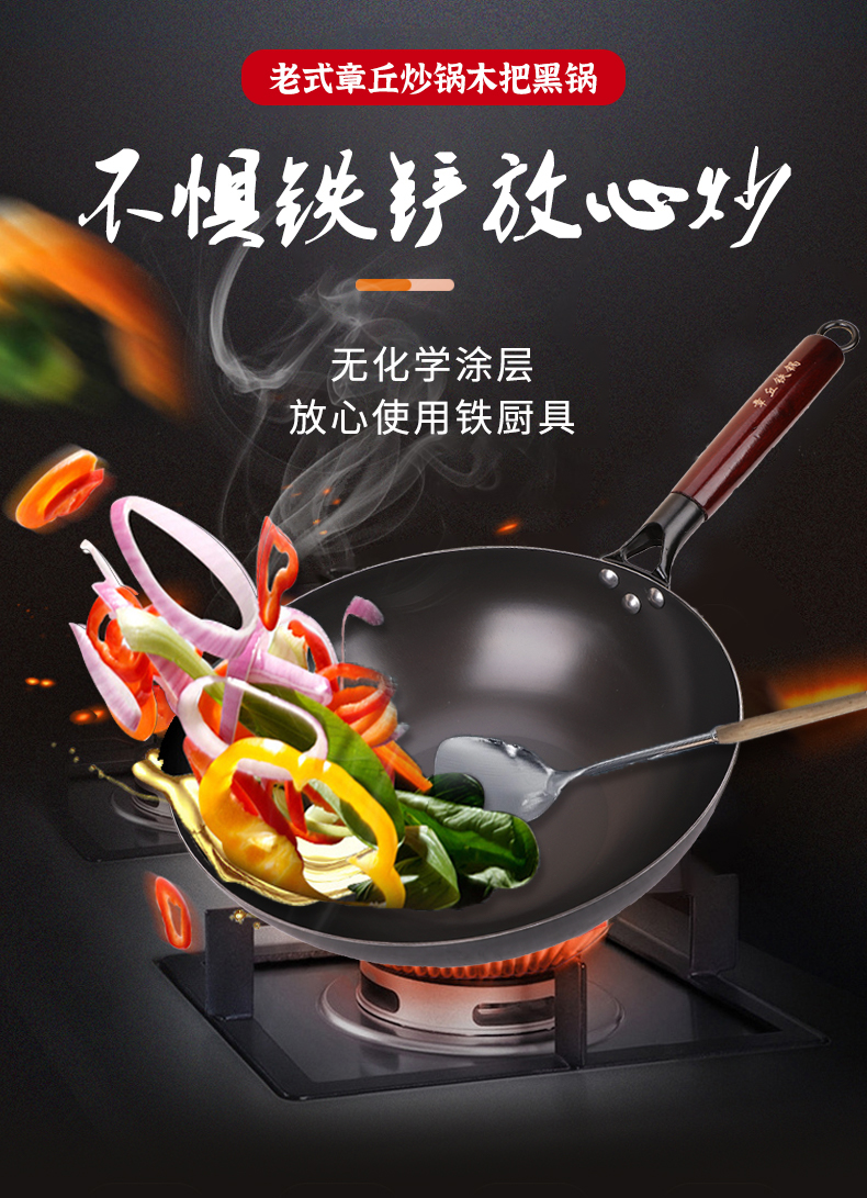 老式章丘炒锅,木把黑锅、无涂层炒菜