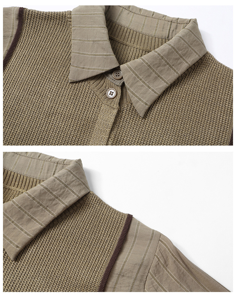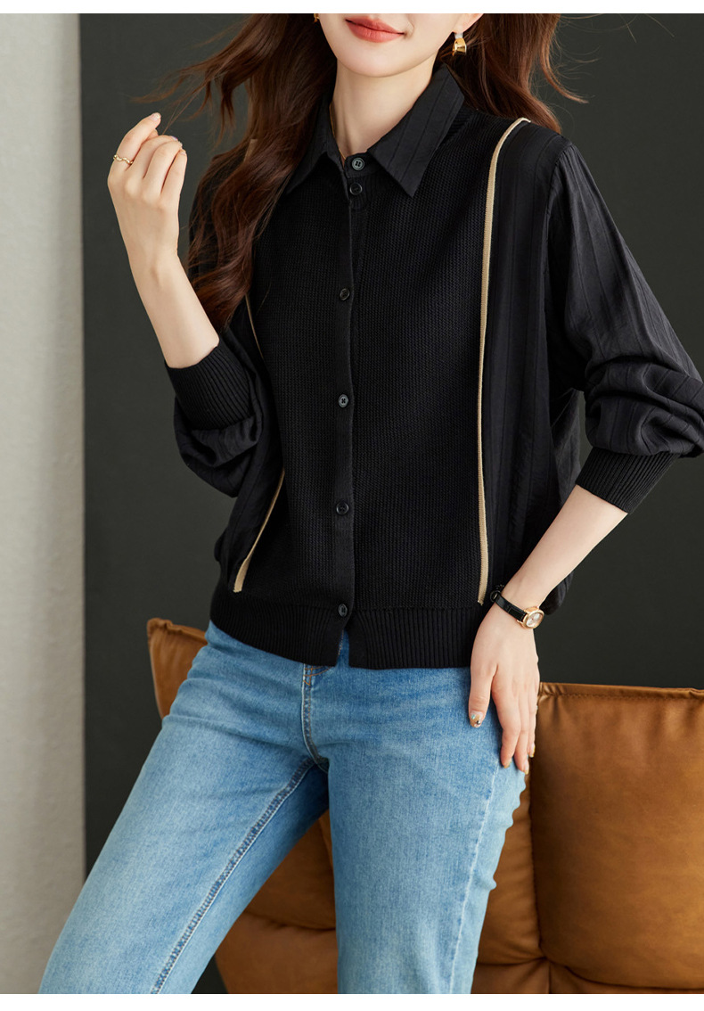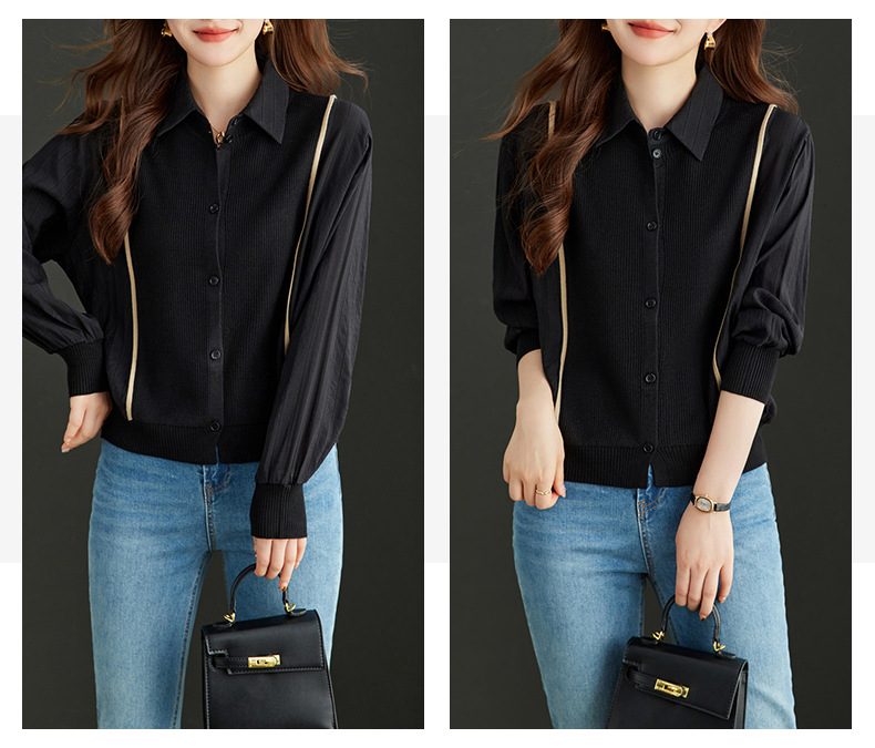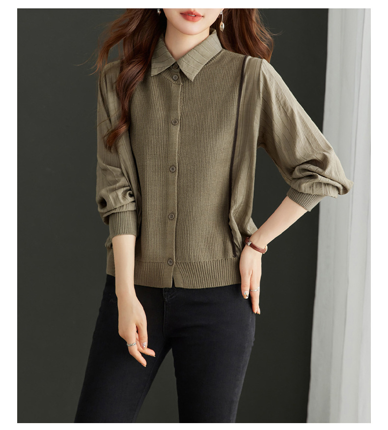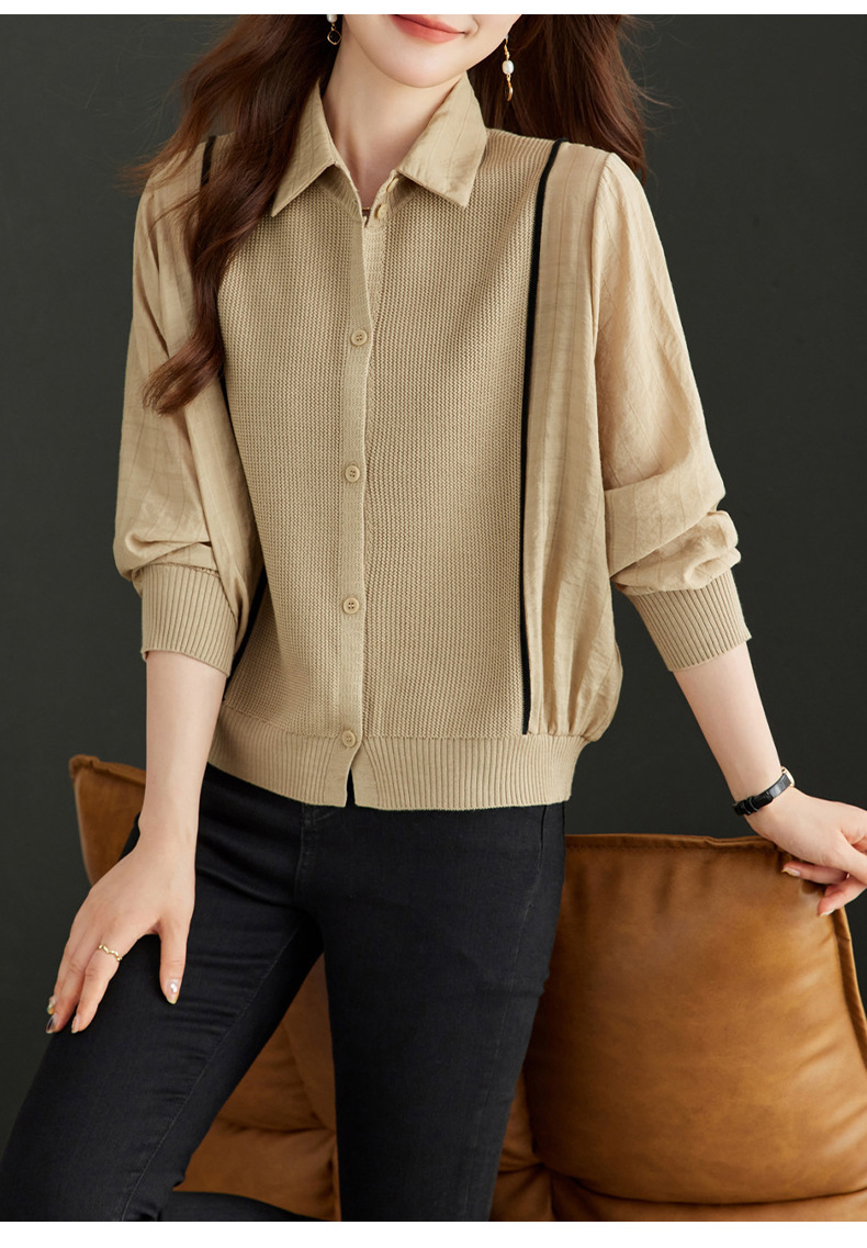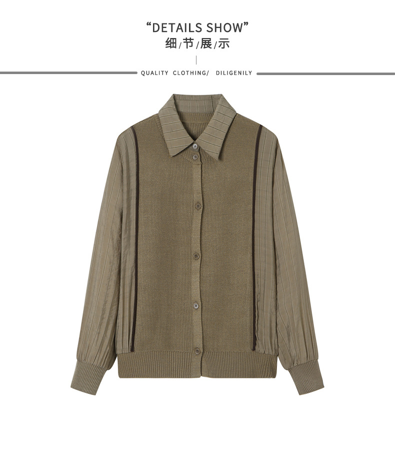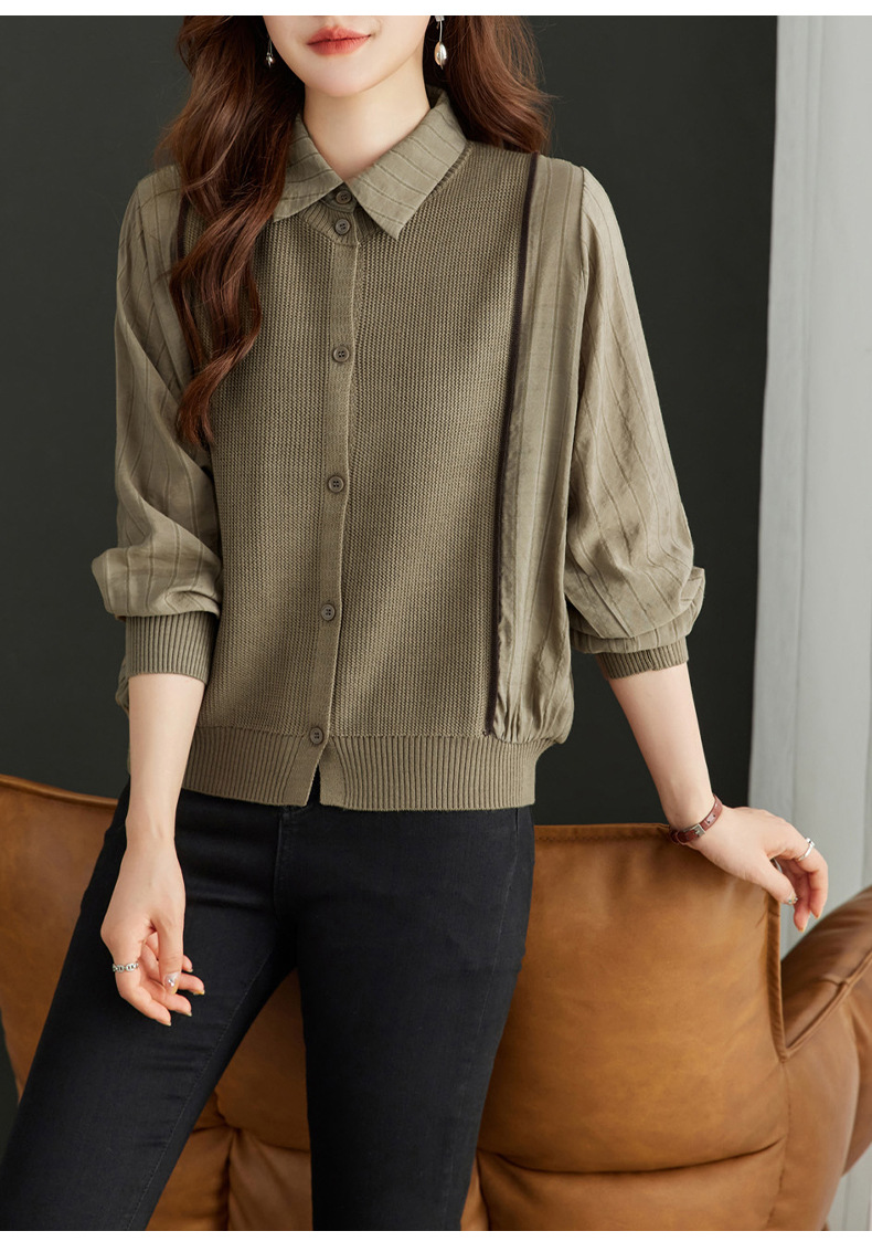 CC-16-9077长袖外穿条纹衬衫女2024春秋新款翻领拼接针织开衫短款宽松上衣服