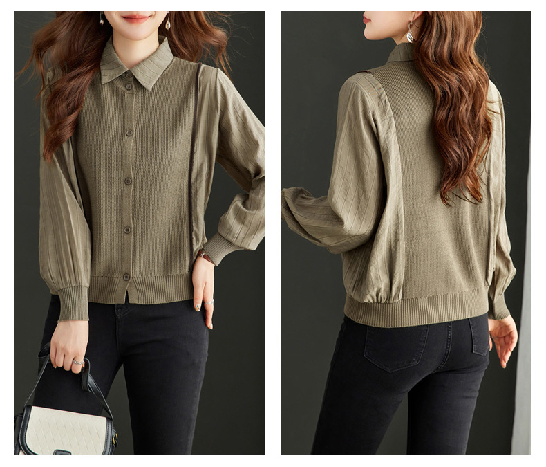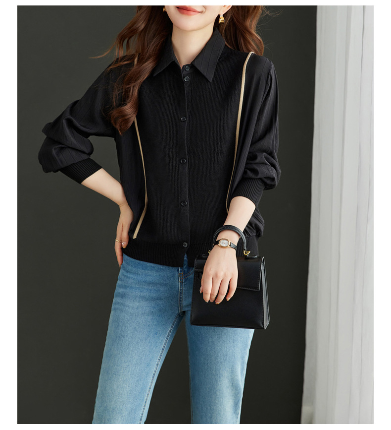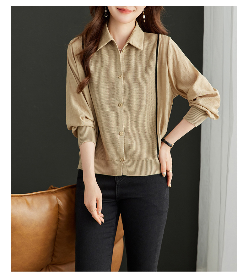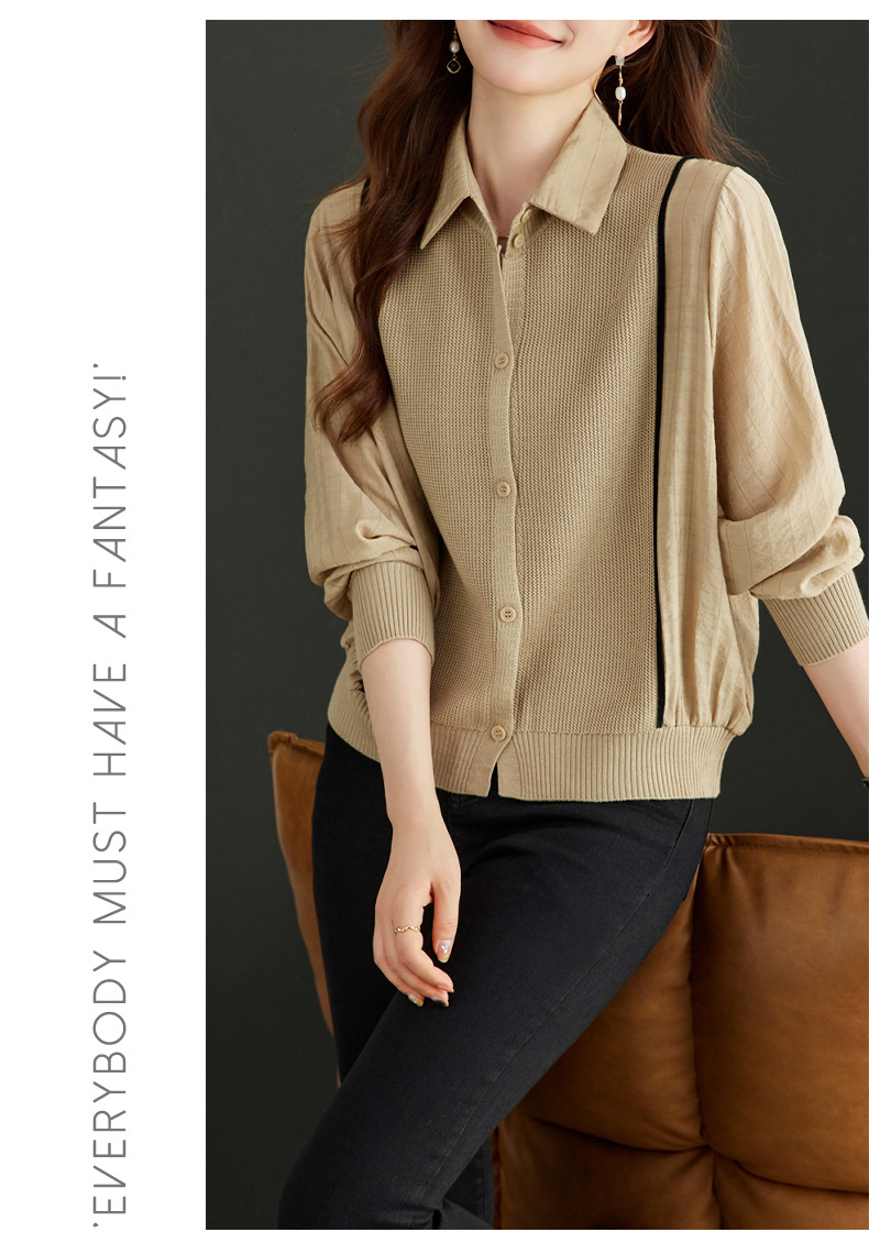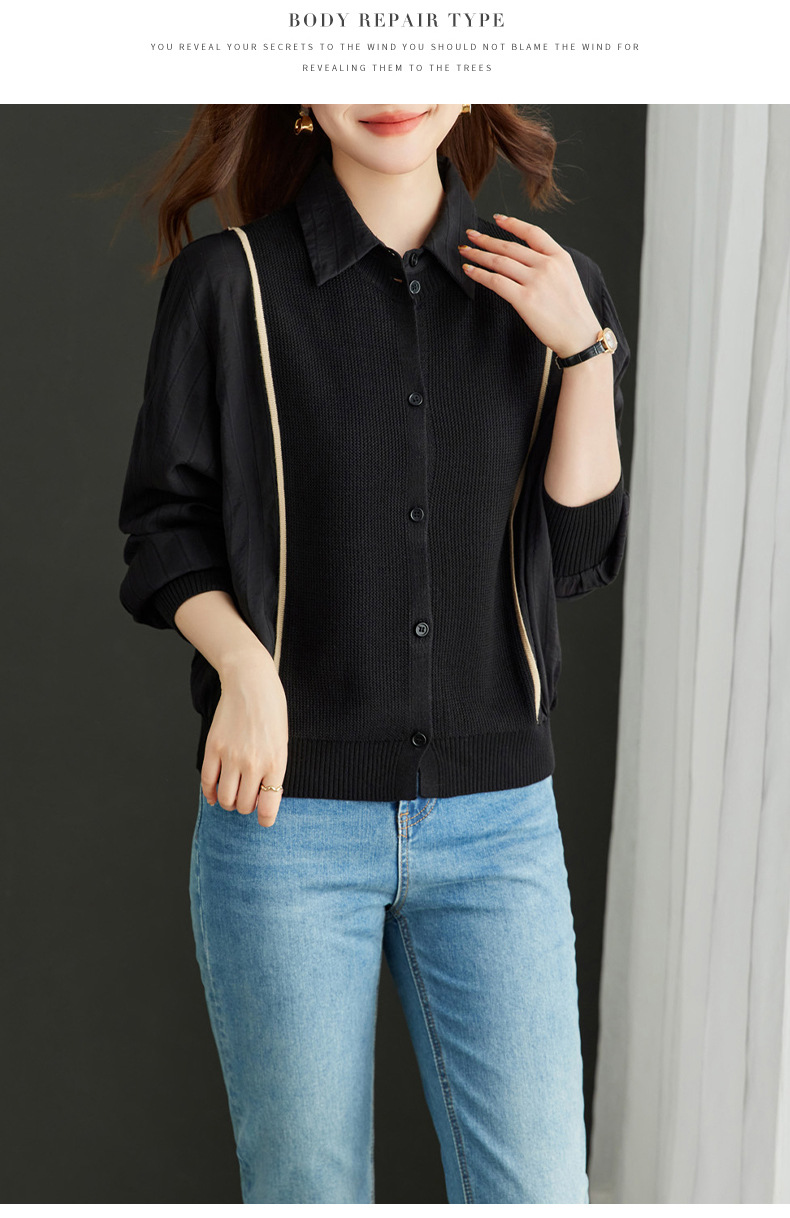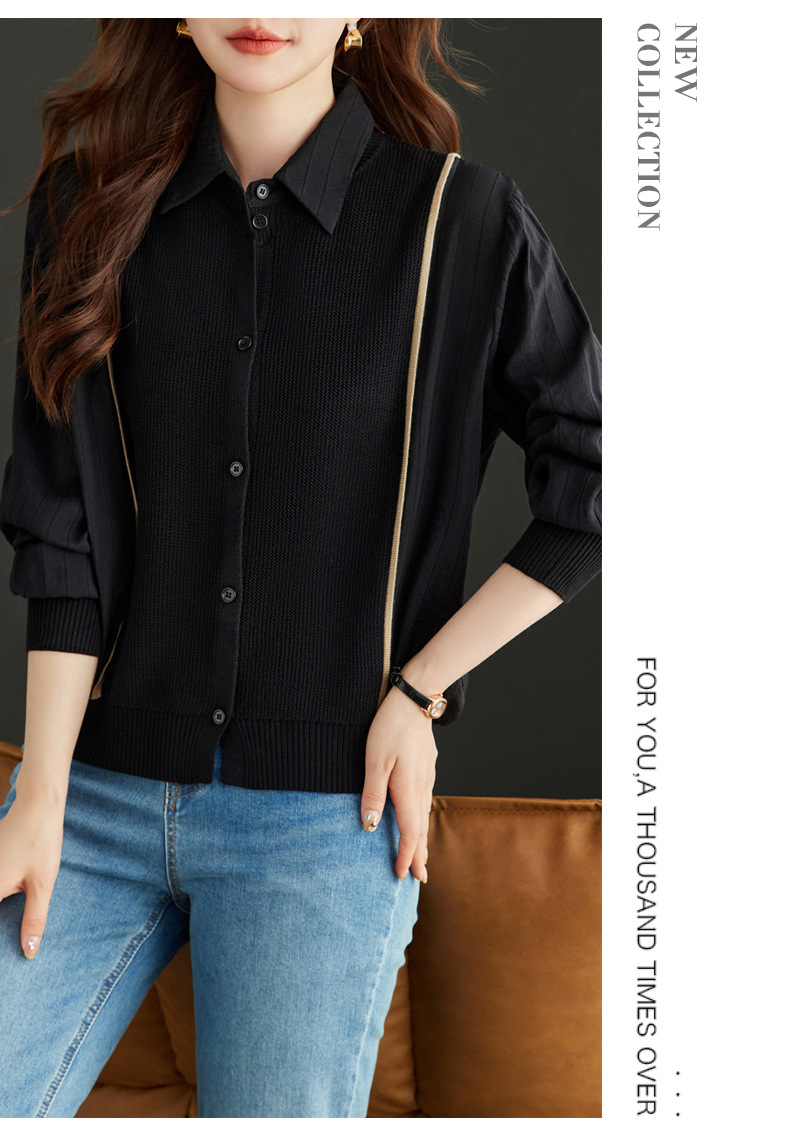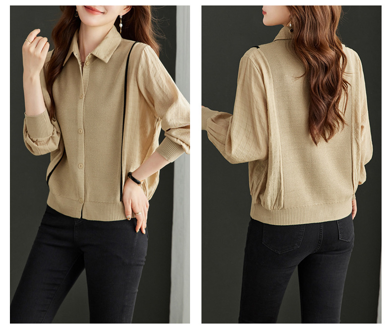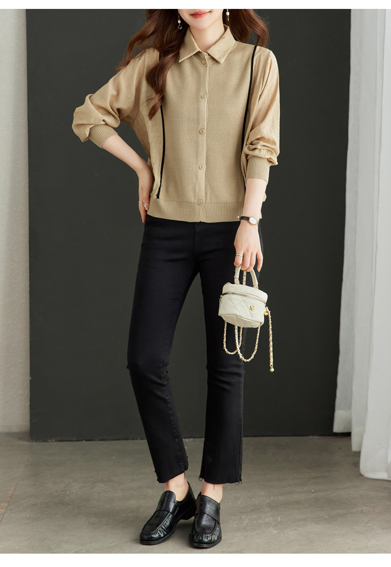 CC-16-9077长袖外穿条纹衬衫女2024春秋新款翻领拼接针织开衫短款宽松上衣服