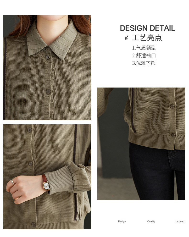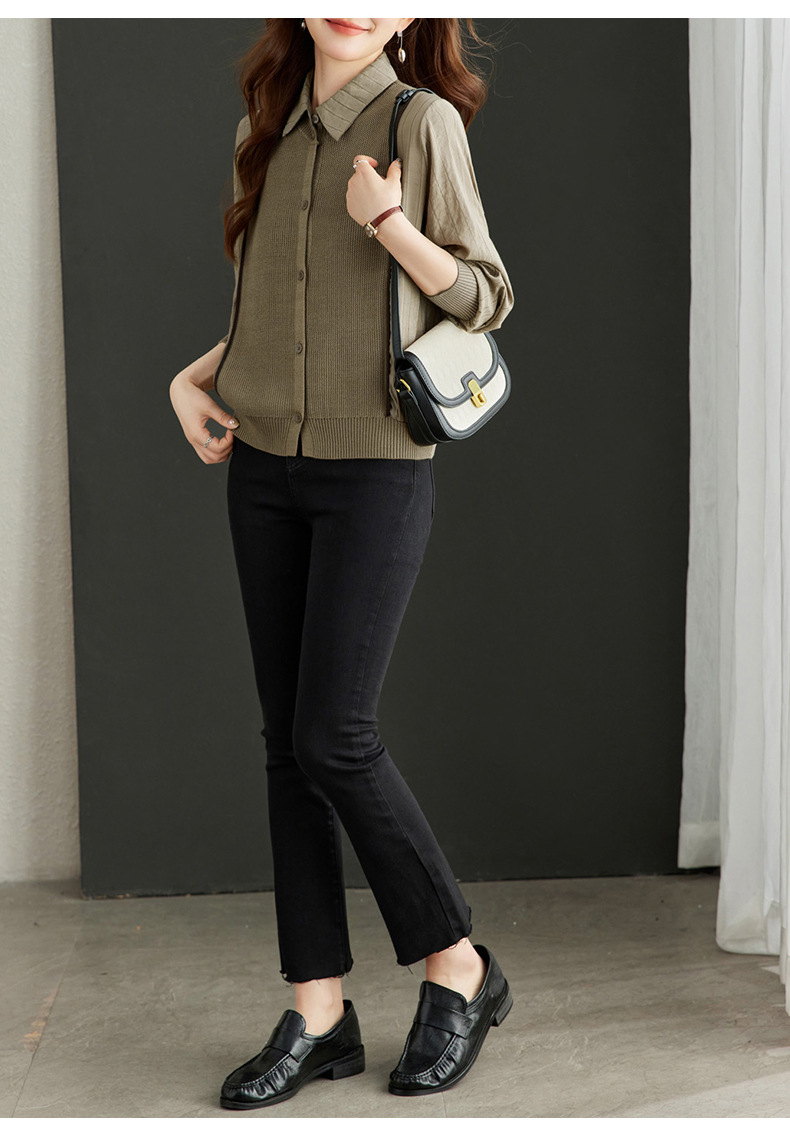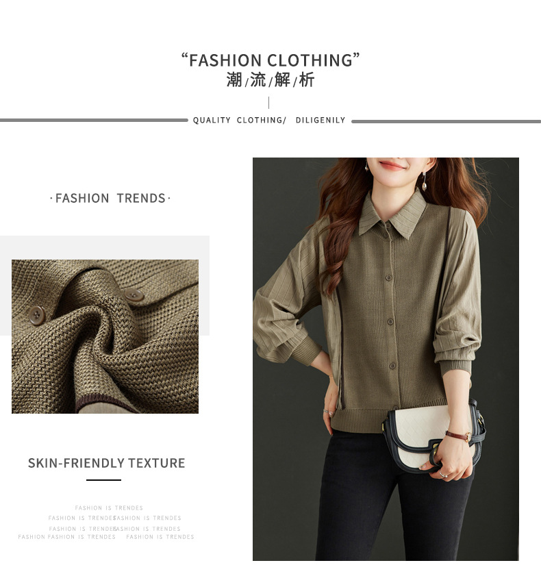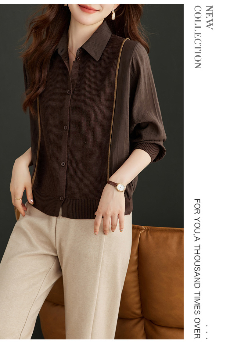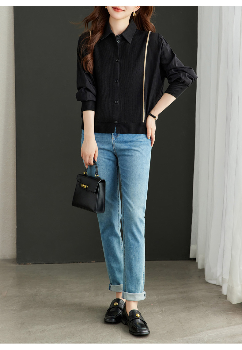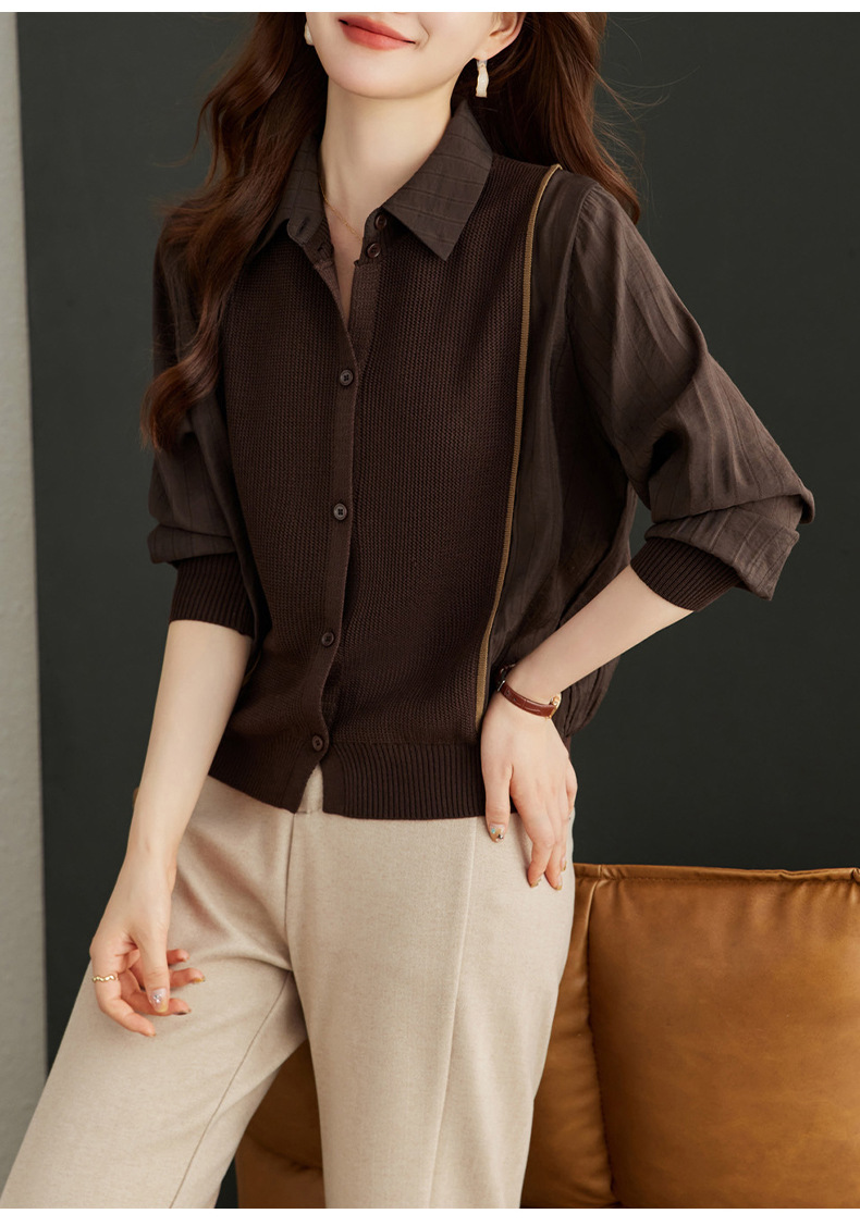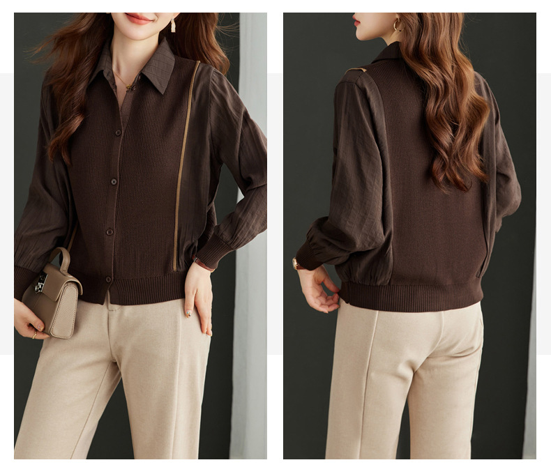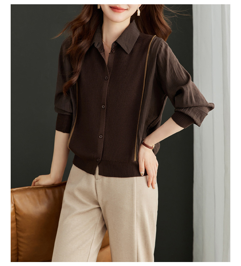 CC-16-9077长袖外穿条纹衬衫女2024春秋新款翻领拼接针织开衫短款宽松上衣服