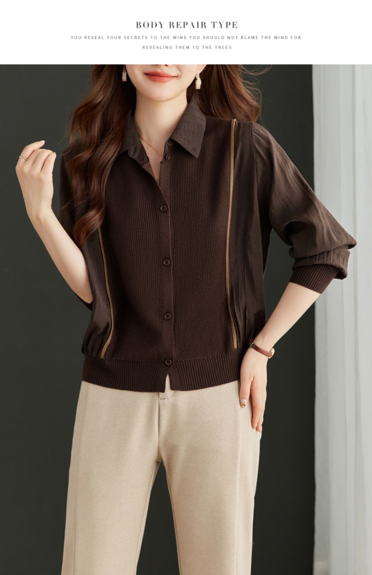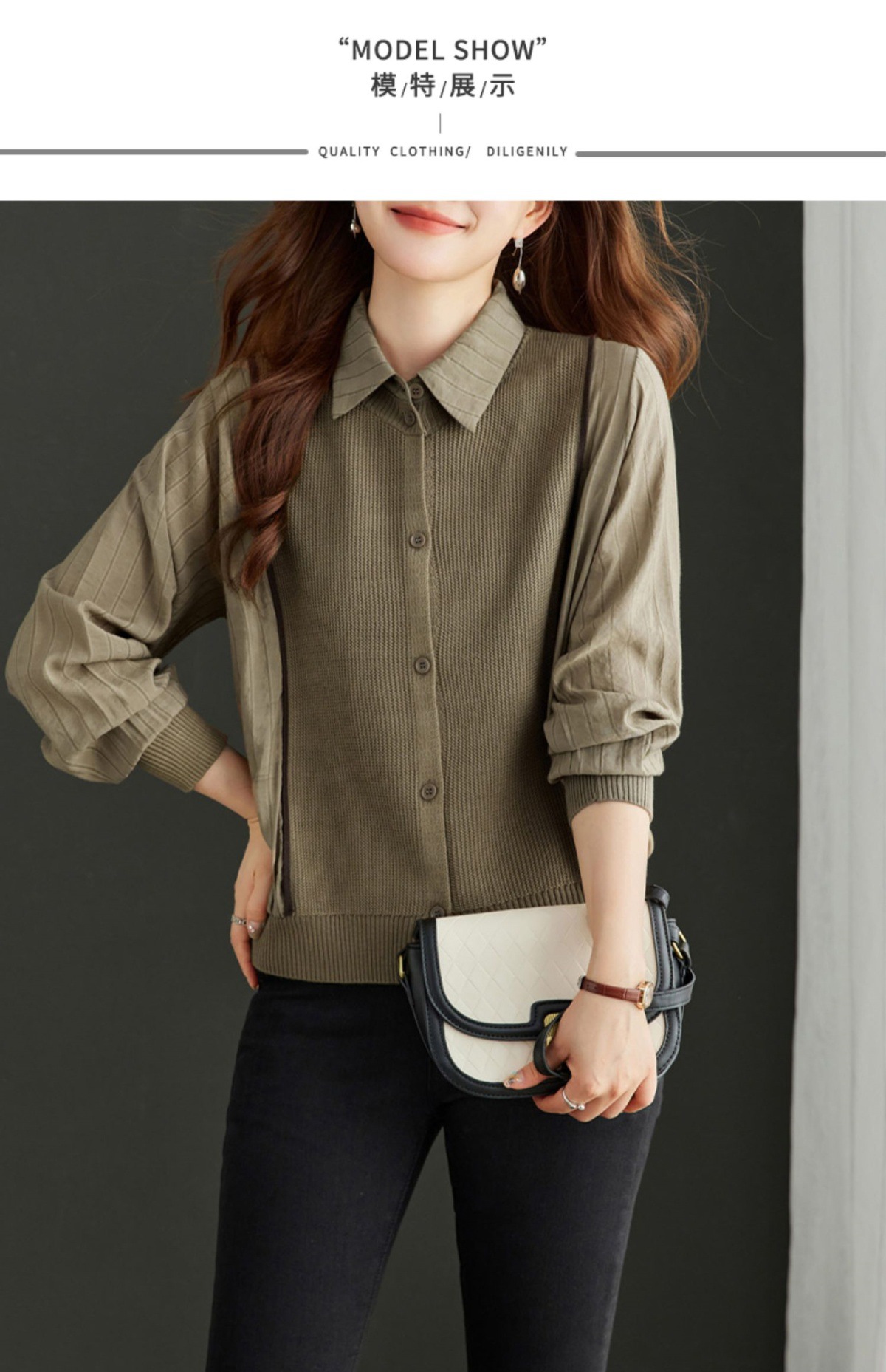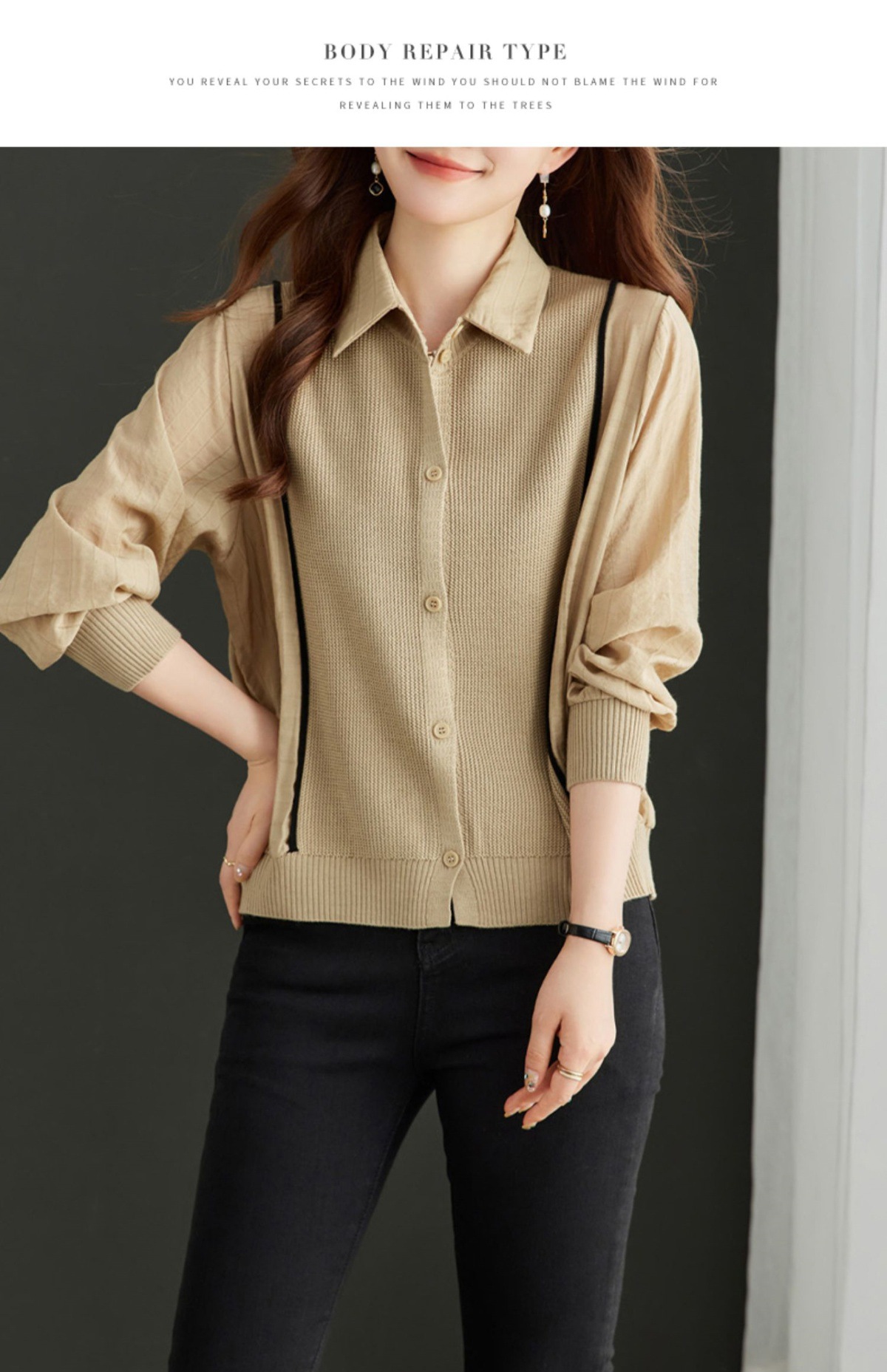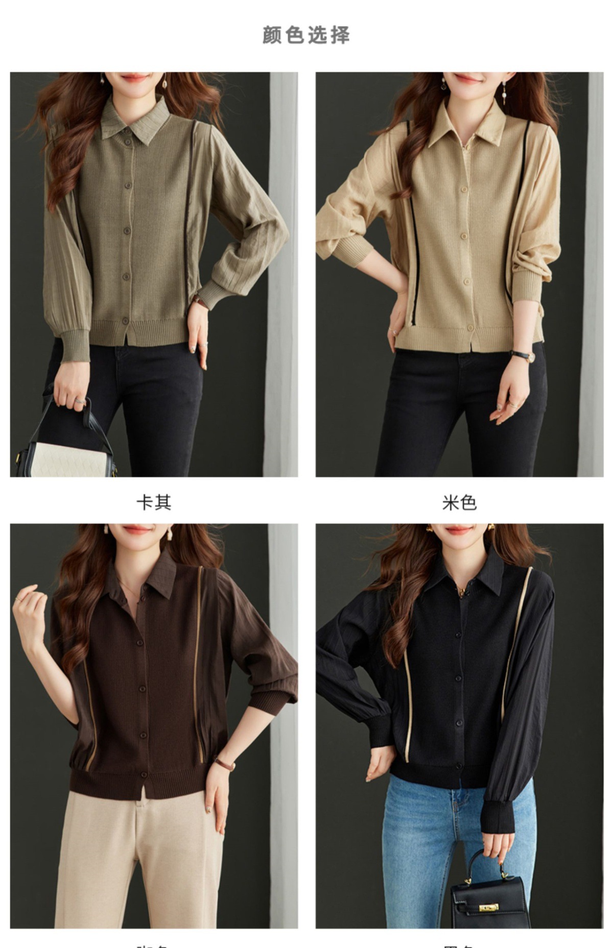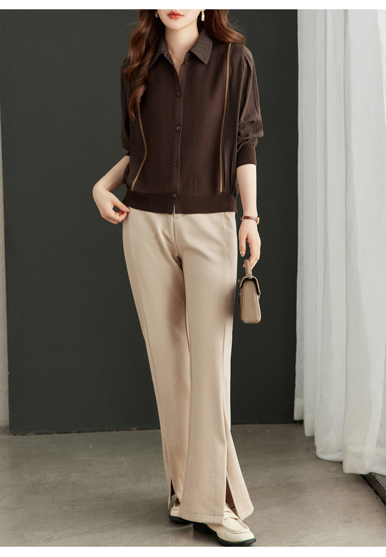 CC-16-9077长袖外穿条纹衬衫女2024春秋新款翻领拼接针织开衫短款宽松上衣服