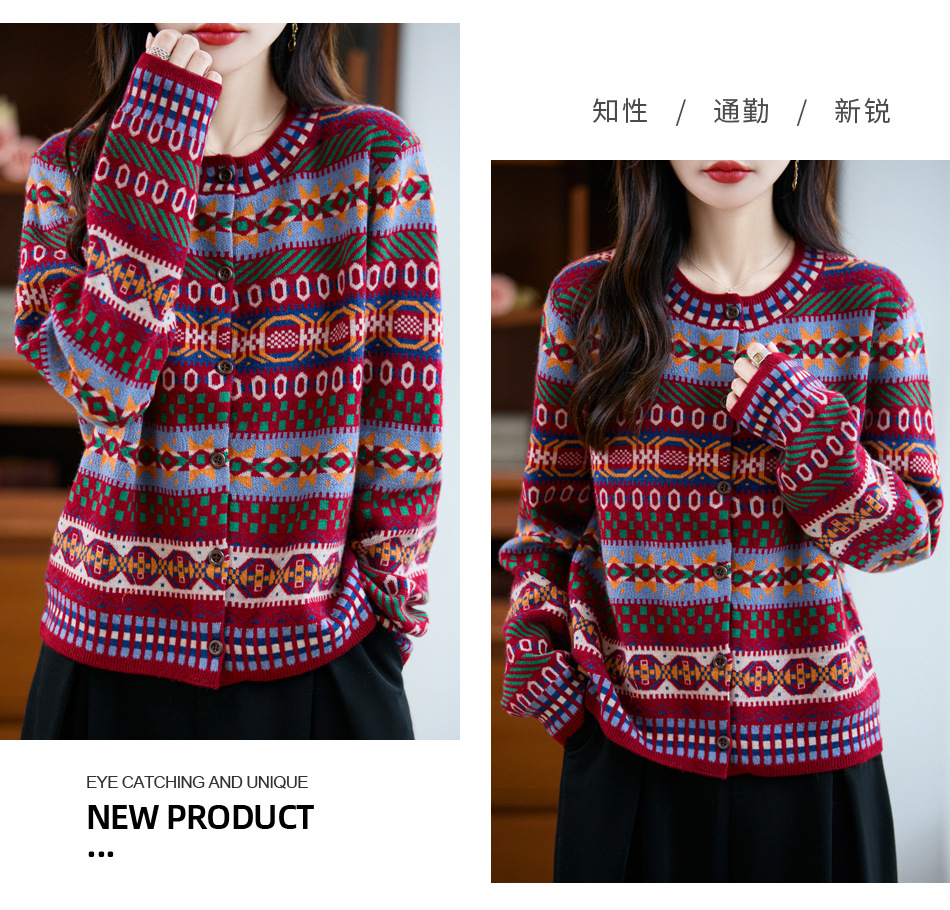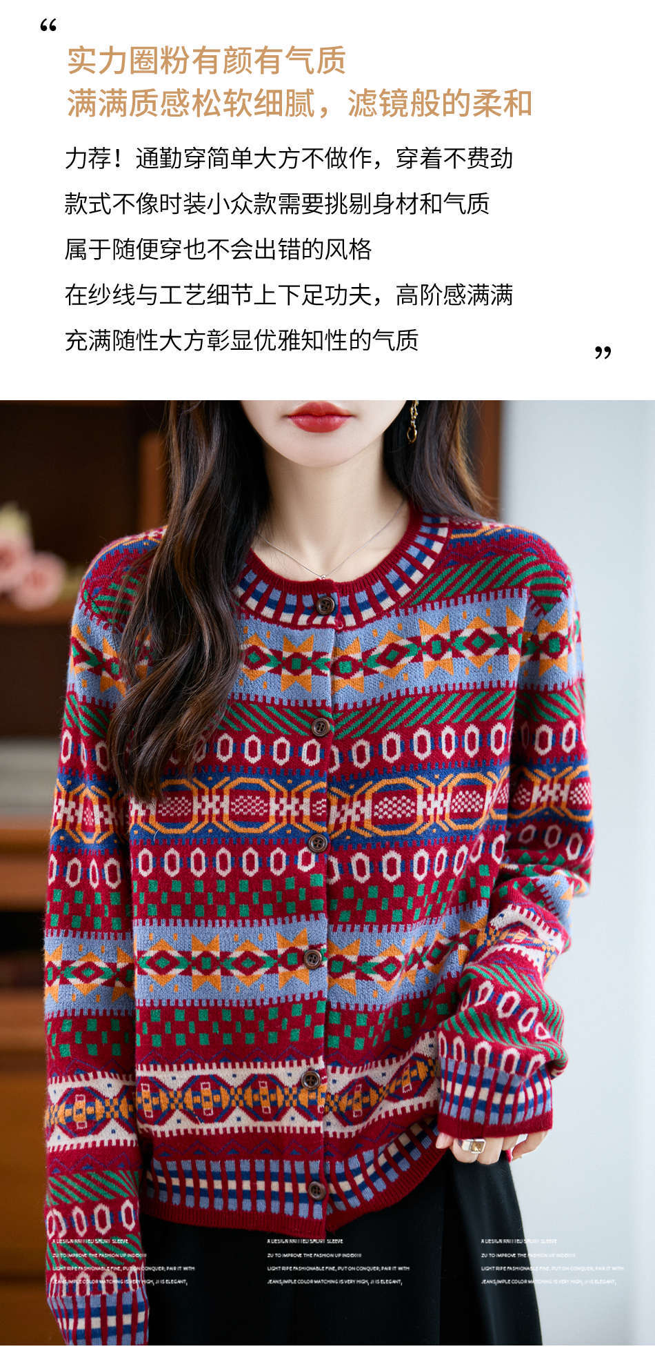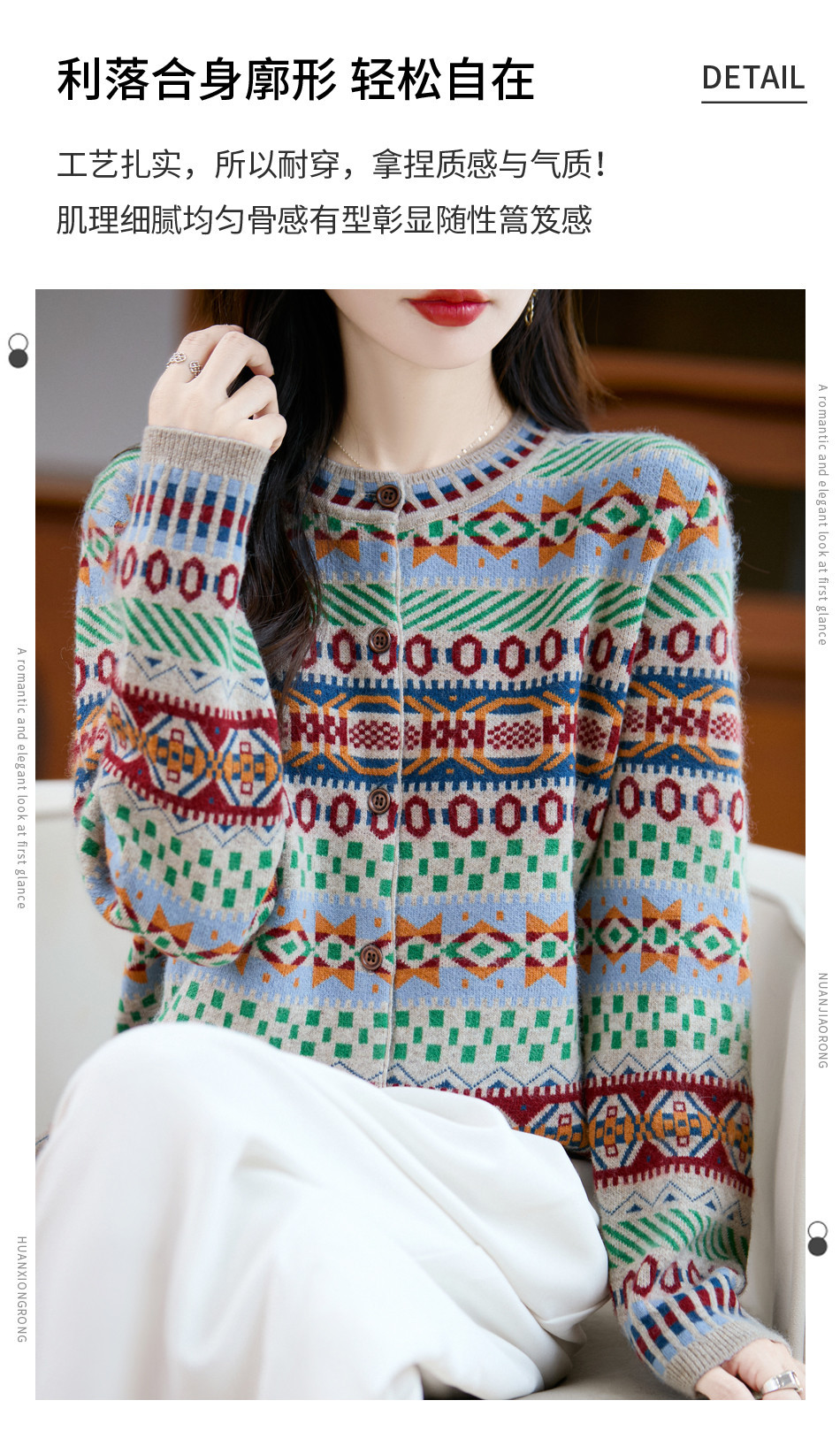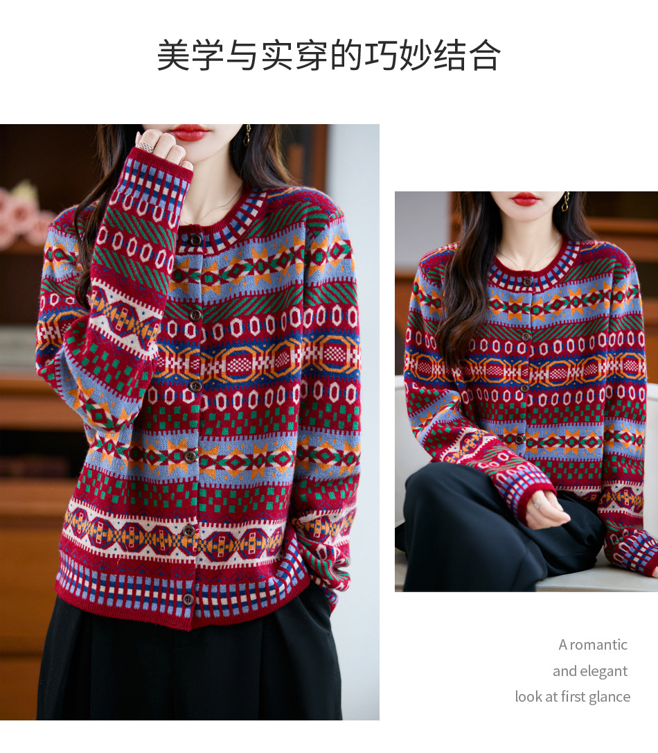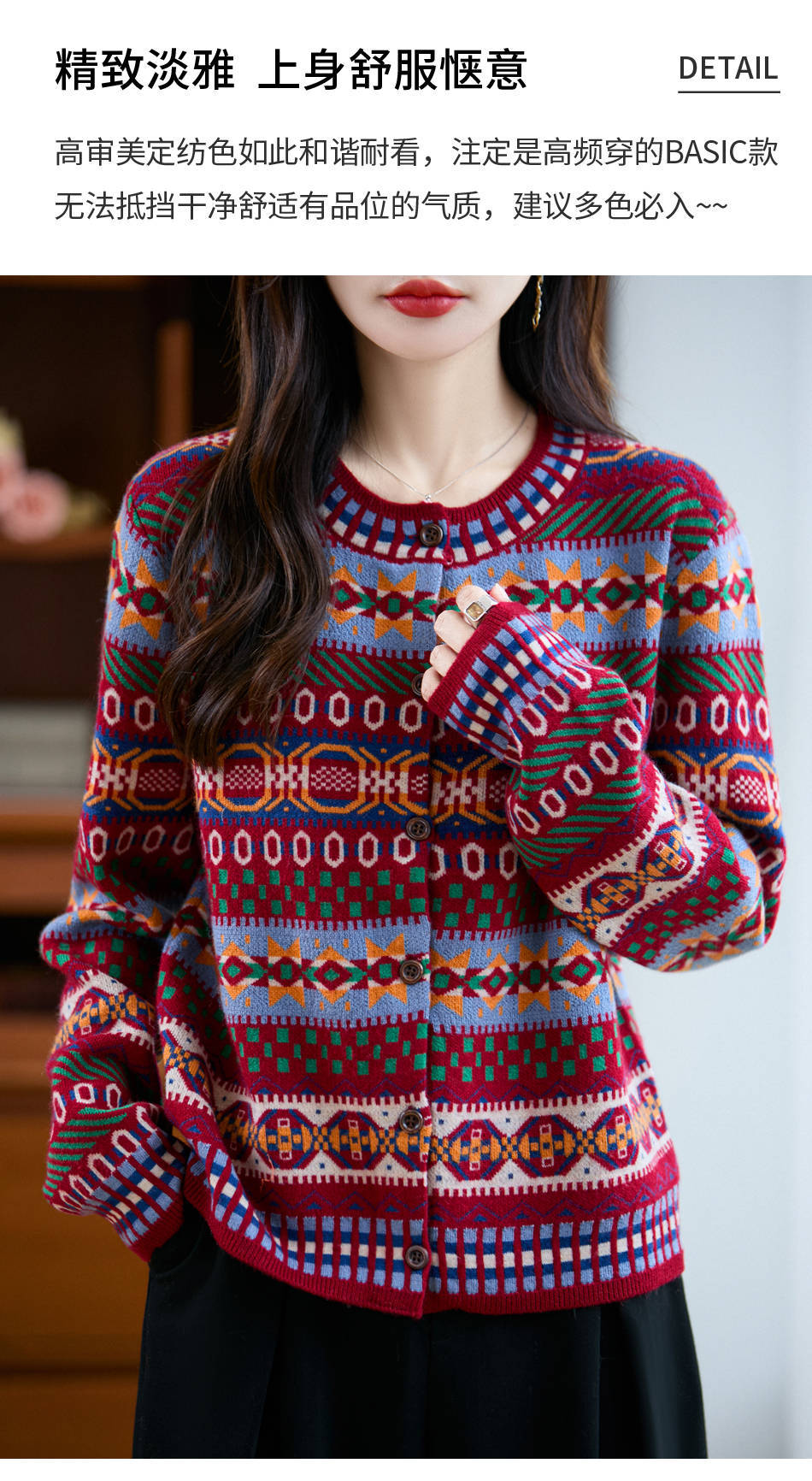 NJR---064-60休闲气质复古民族风正肩开衫外套女2025秋新款时尚提花针织毛衣