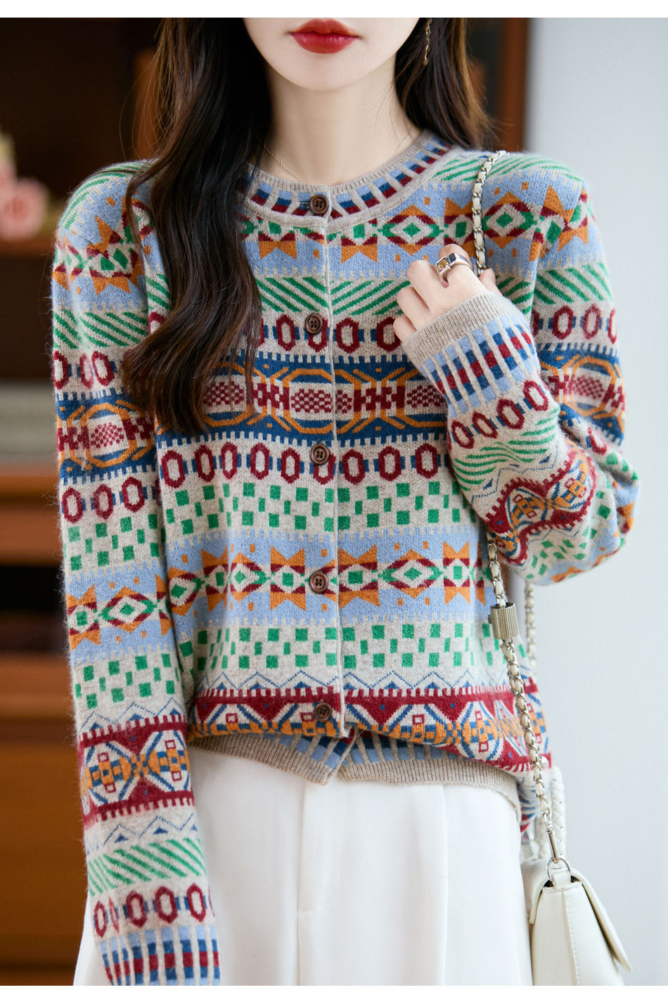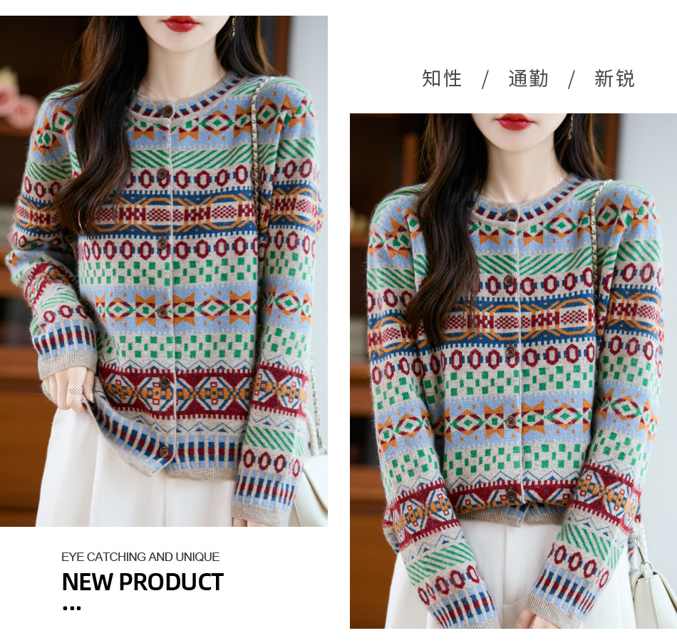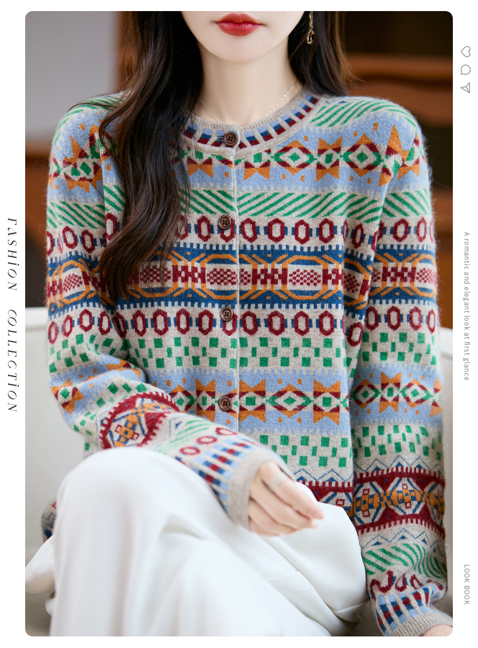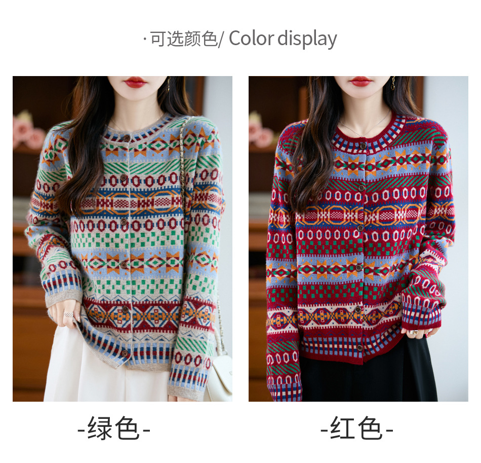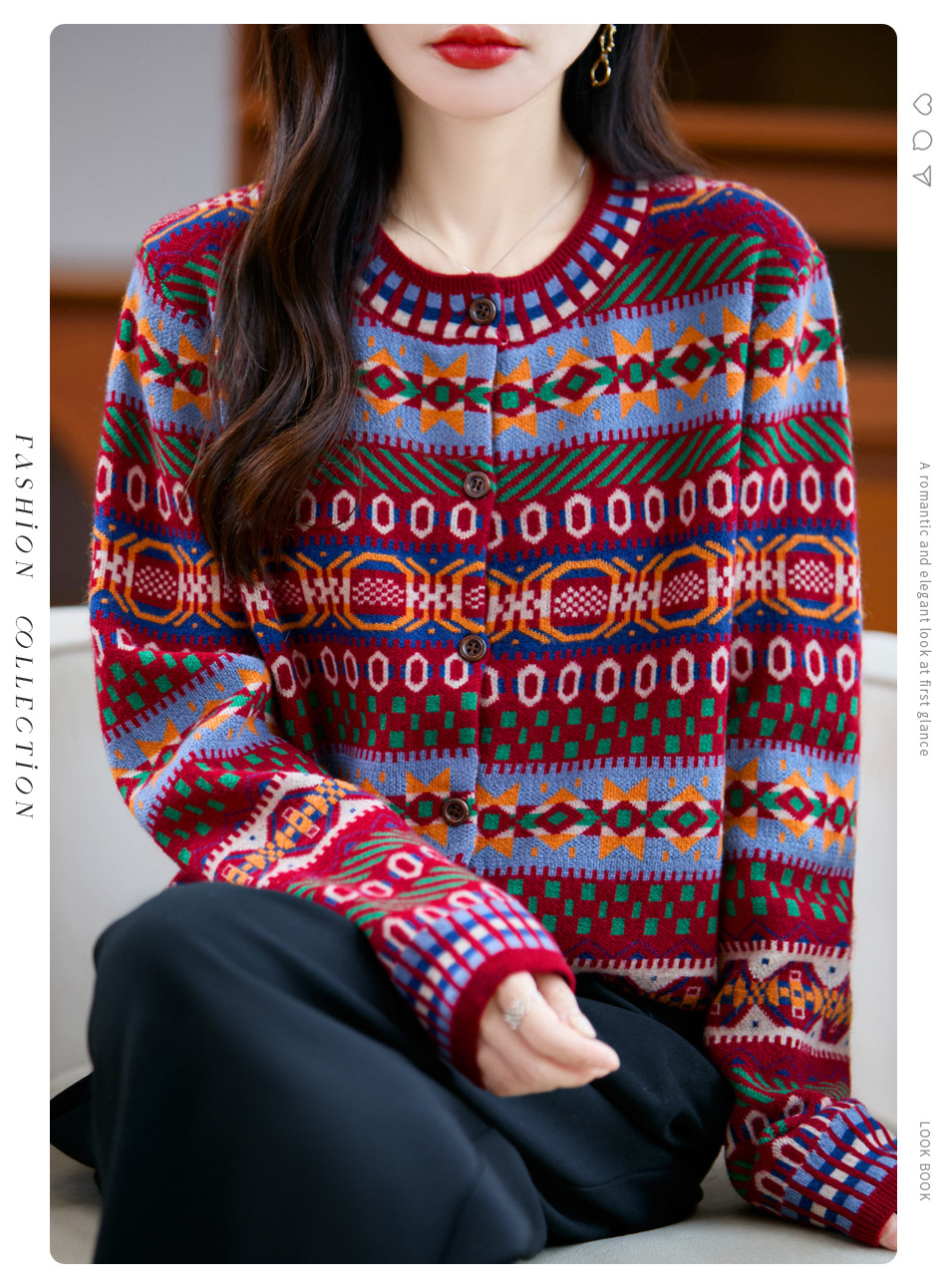 NJR---064-60休闲气质复古民族风正肩开衫外套女2025秋新款时尚提花针织毛衣