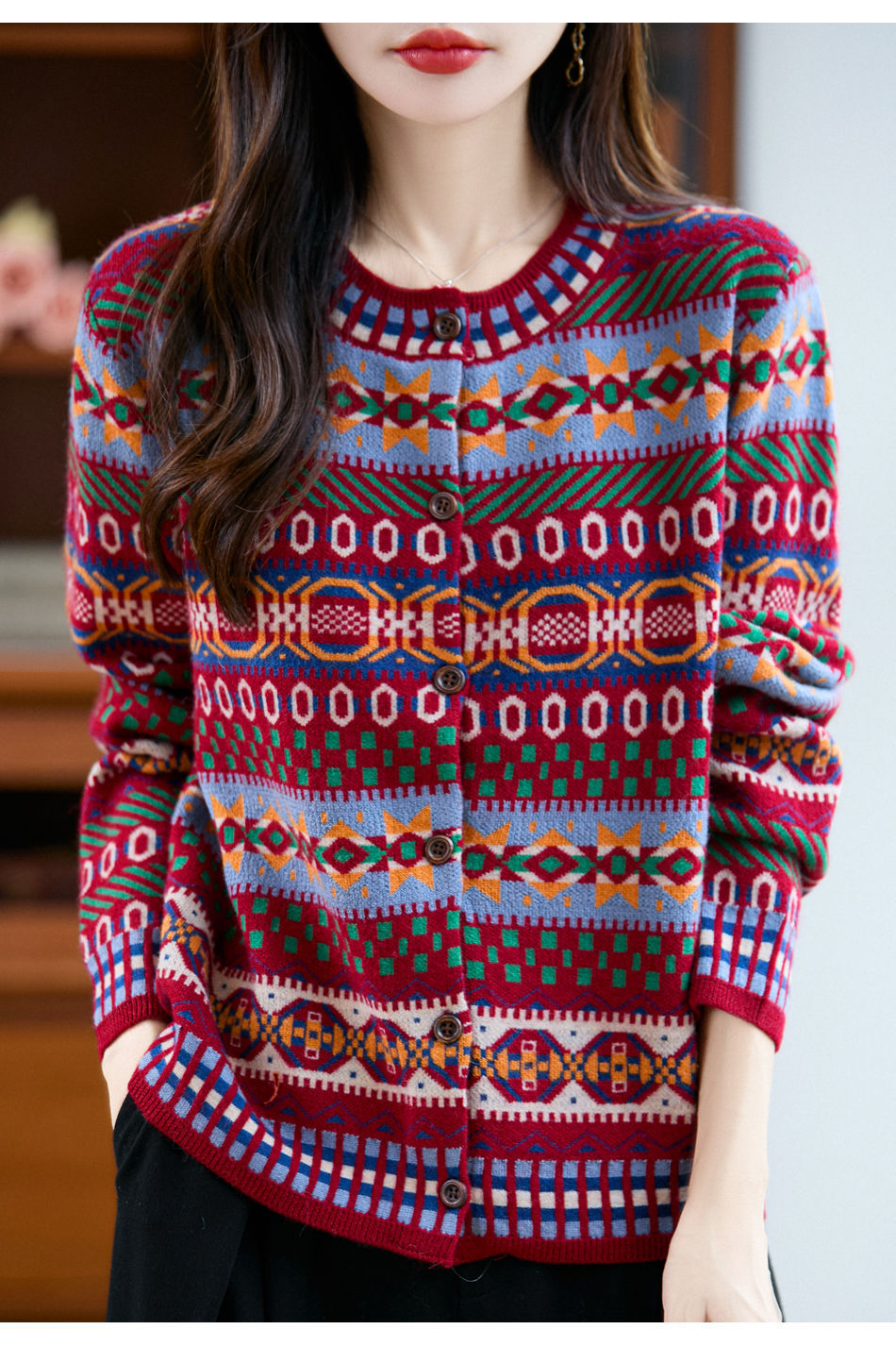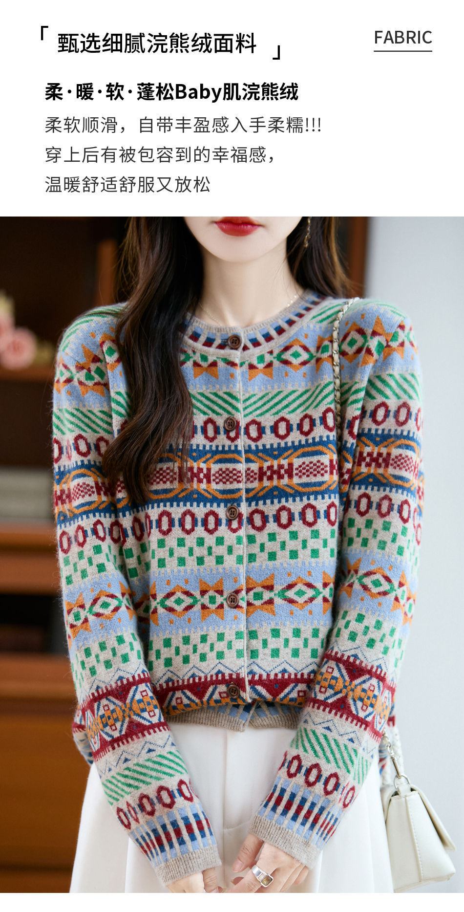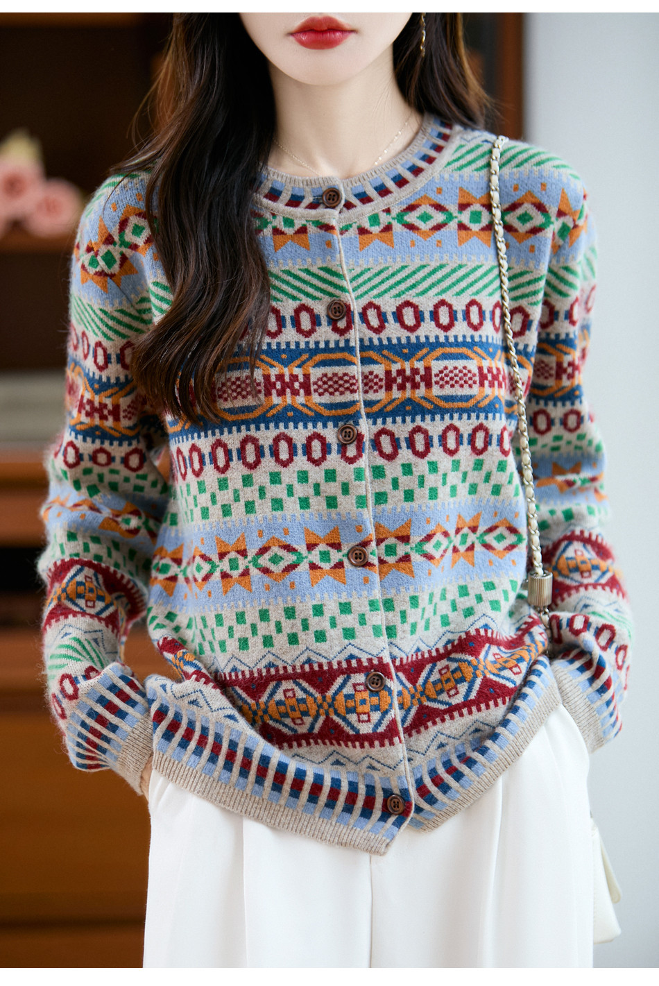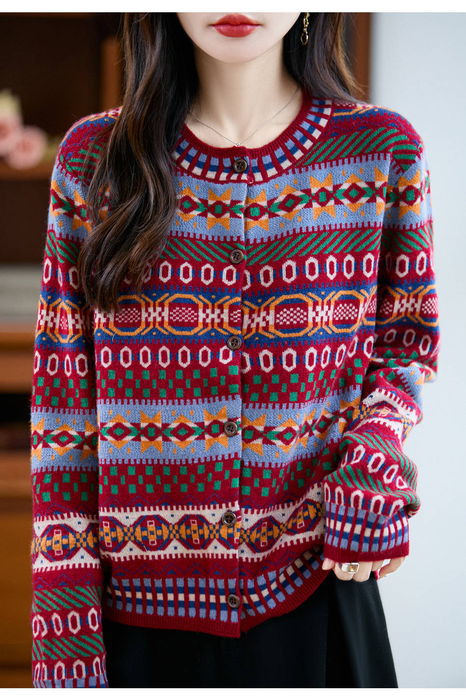 NJR---064-60休闲气质复古民族风正肩开衫外套女2025秋新款时尚提花针织毛衣