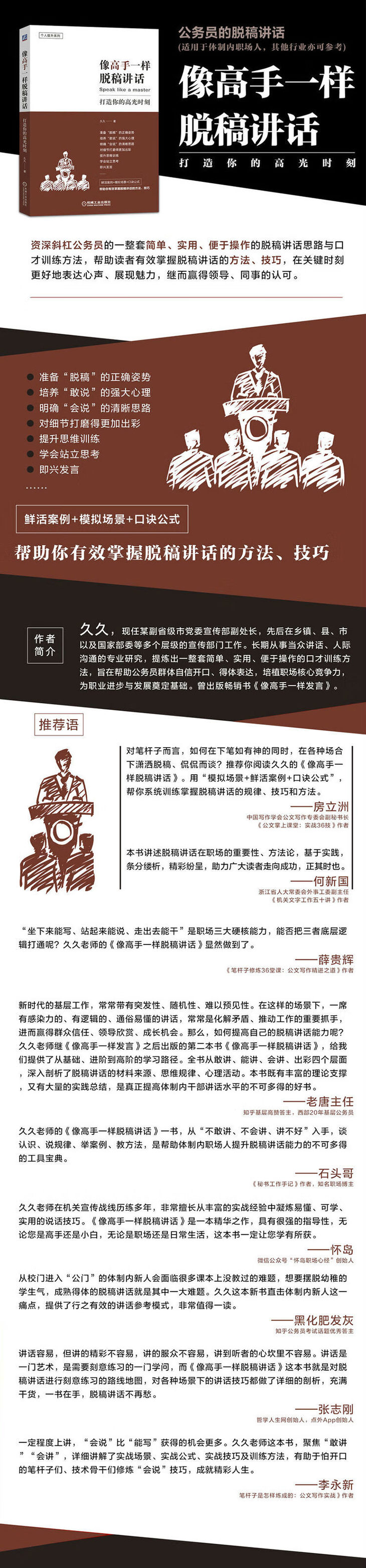 答:不是,本书同样适合非公务员。书中讲的是公务员如何脱稿讲话,案例基本都是我在实际工作中遇到的,公务员身份的读者读起来会更有感觉,因为讲的就是身边人、身边事,都是工作和生活中的真实场景和真实案例。当然,这并不妨碍非公务员身份的读者阅读。因为本书除了讲脱稿讲话的技巧方法之外,也讲了脱稿讲话背后的规律以及相应的思维方式,而这些适合于任何群体。通过这本书,我希望读者都能去认识、掌握并实践语言背后的规律,由此拓展自身的思维和格局。比如说“准备”的话题,这是每个职场人都需要仔细考虑、严肃对待的。帮助读者通过脱稿讲话来提升个人思维认知和视野格局,这是我更大的心愿。