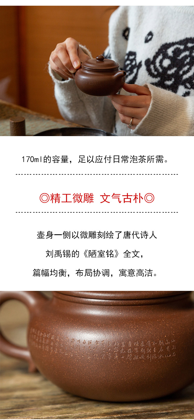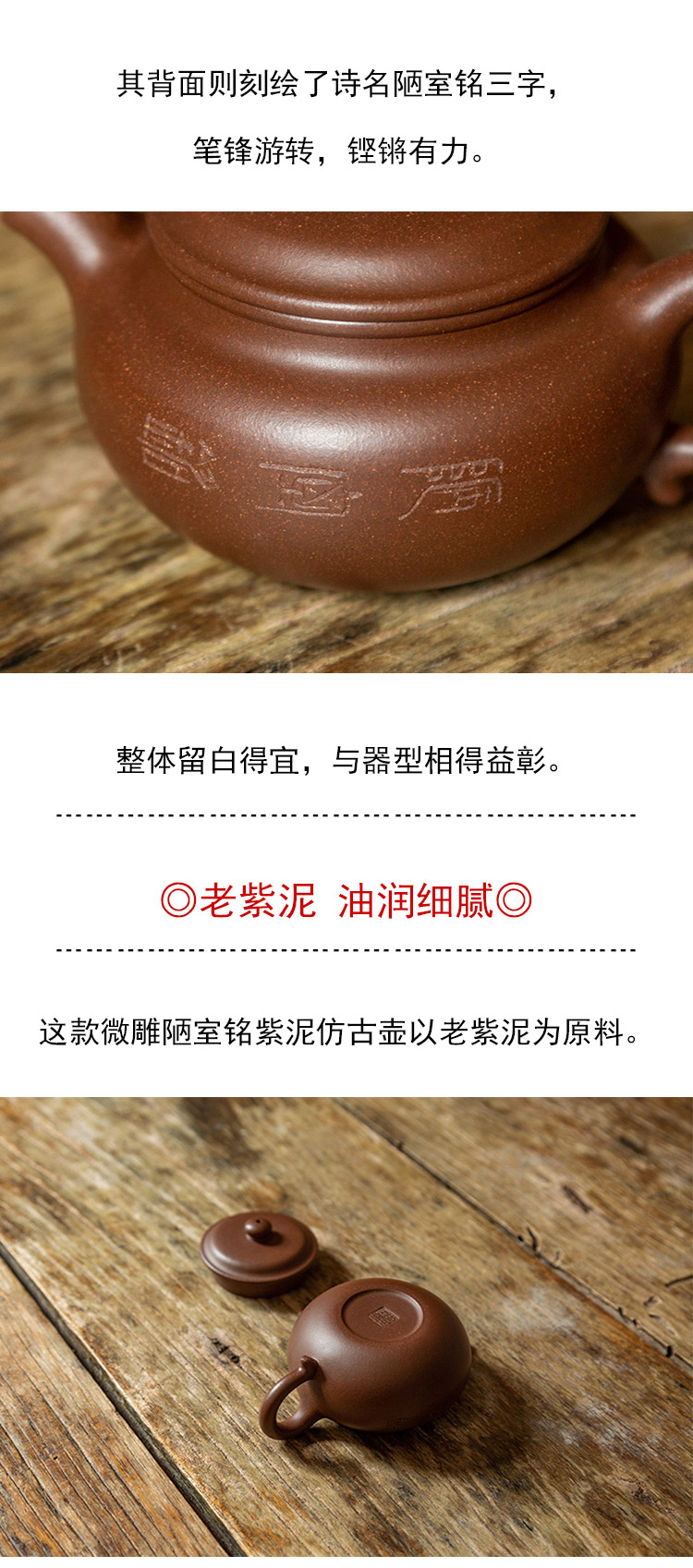 茶香记 紫砂壶 微雕陋室铭紫泥仿古壶 范平和微雕大师一成联袂制作 经典器型 油润细腻
