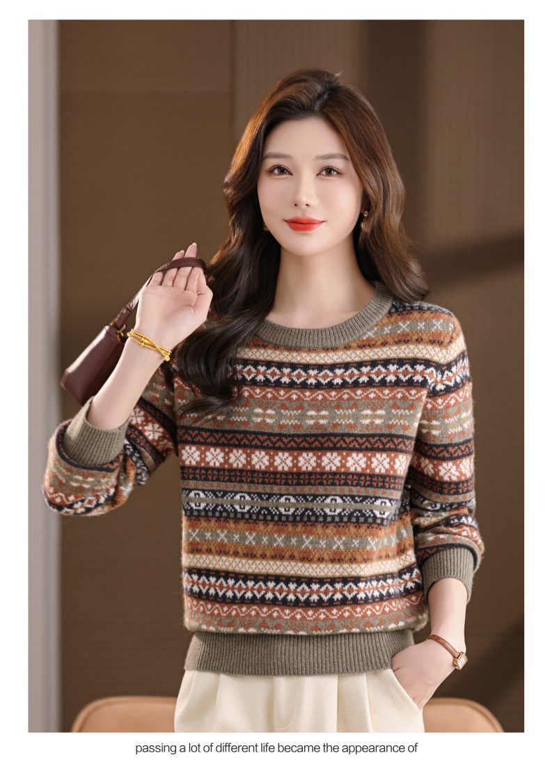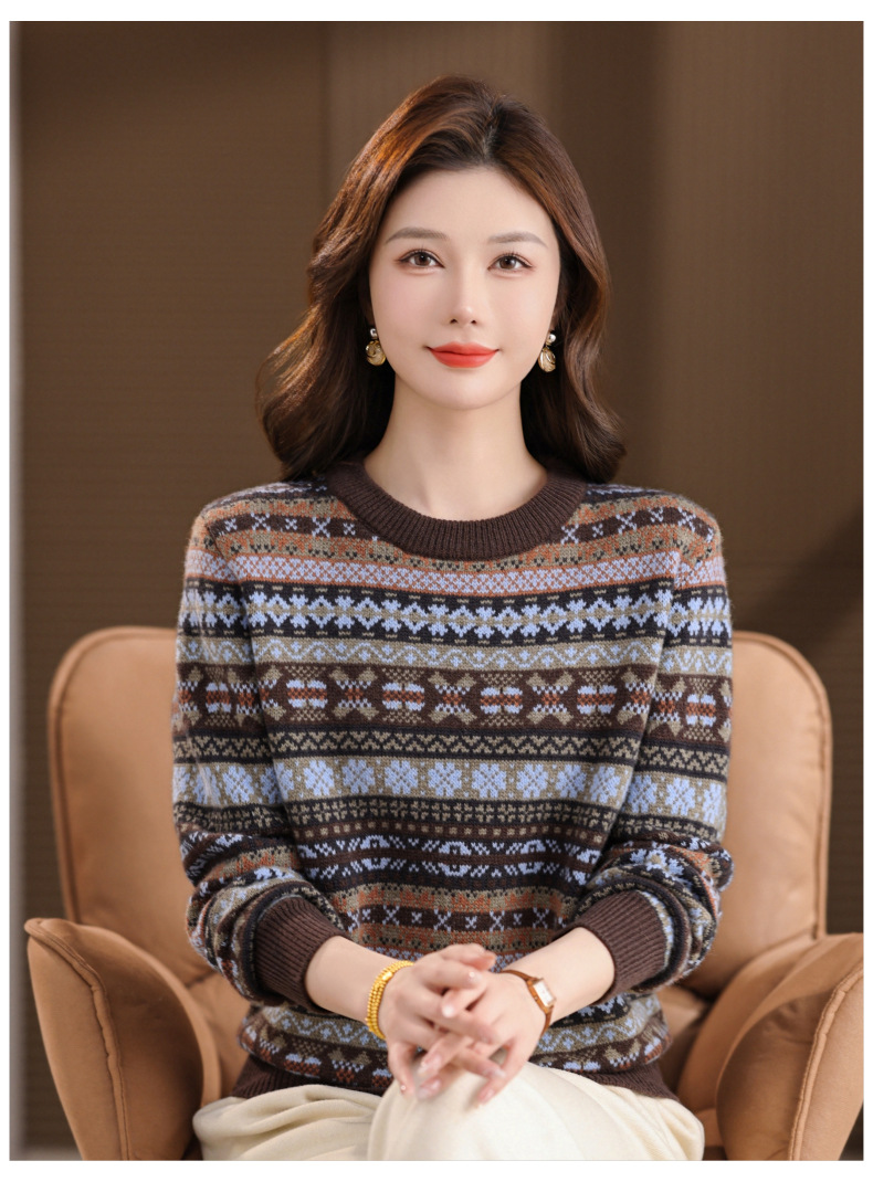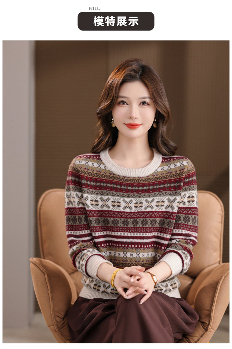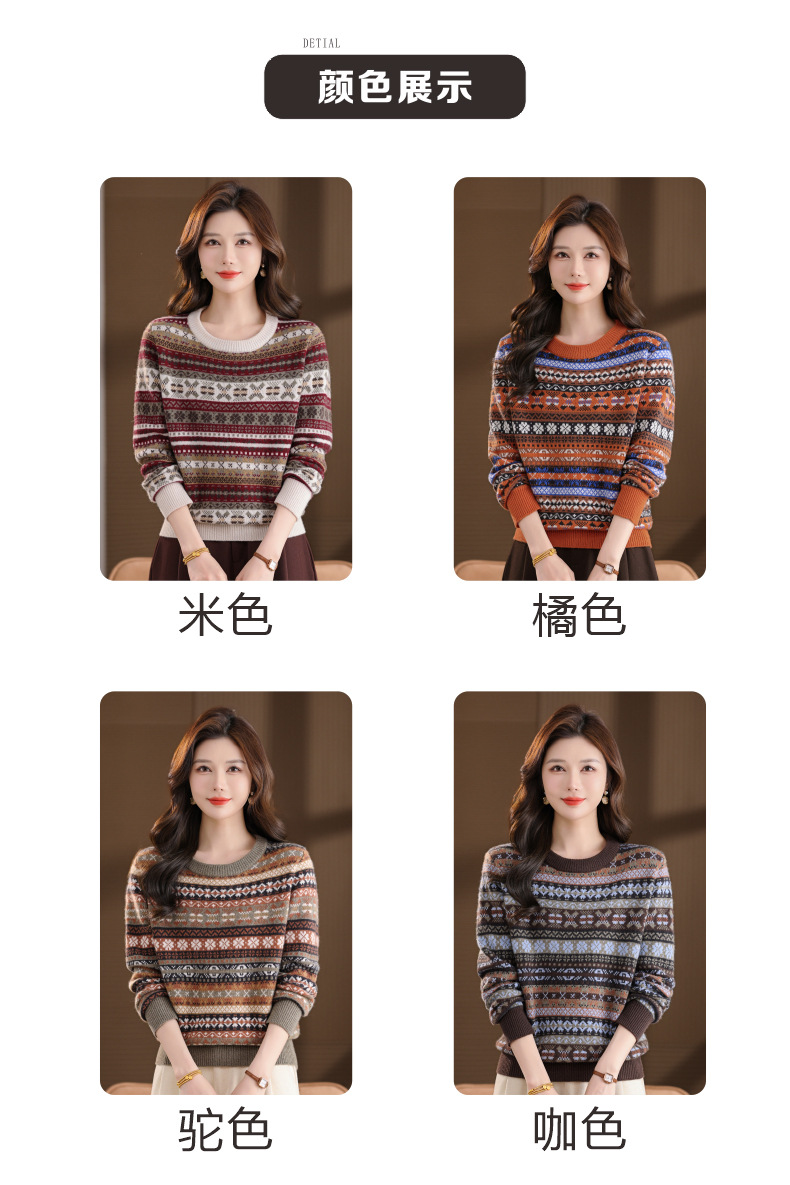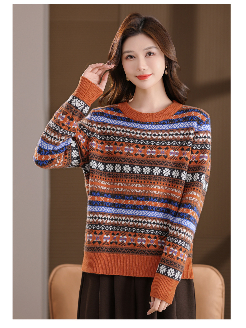 CC 101-88602羊毛圆领毛衣民族风条纹提花宽松针织打底衫