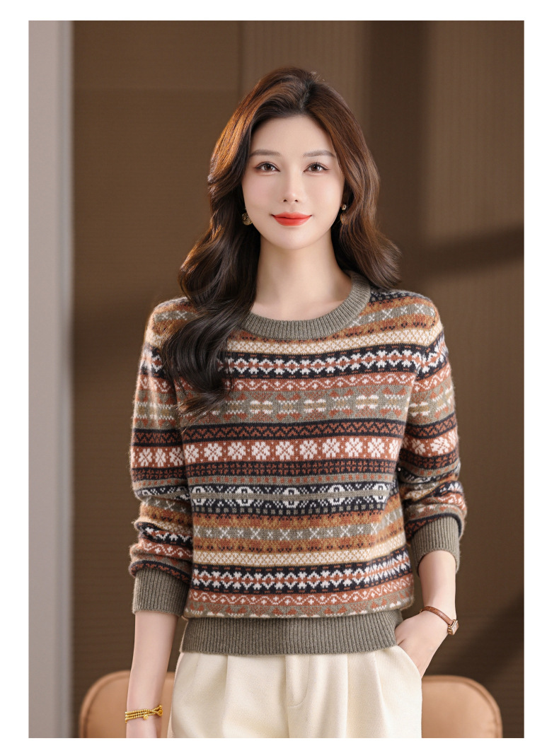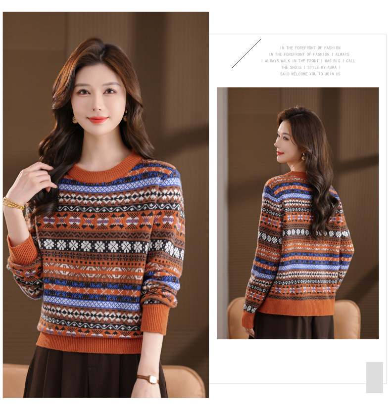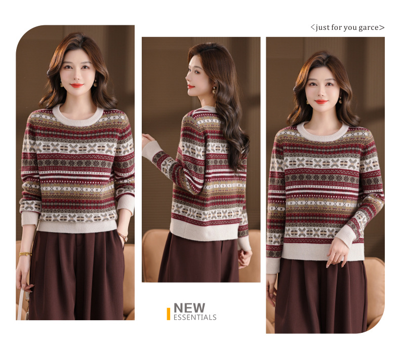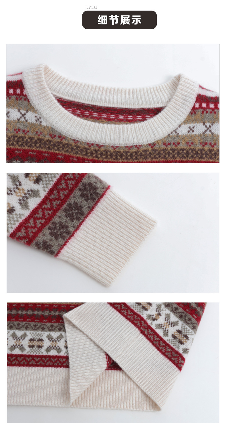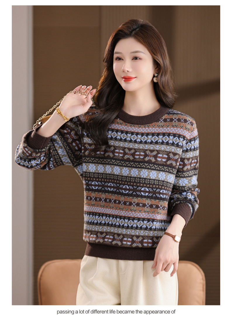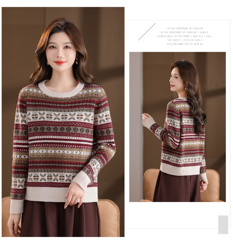 CC 101-88602羊毛圆领毛衣民族风条纹提花宽松针织打底衫