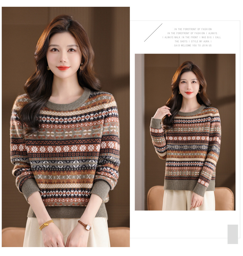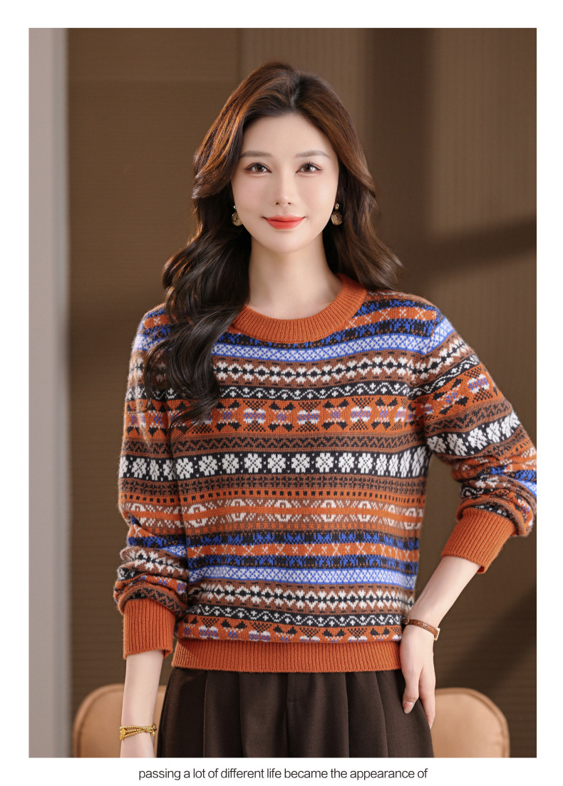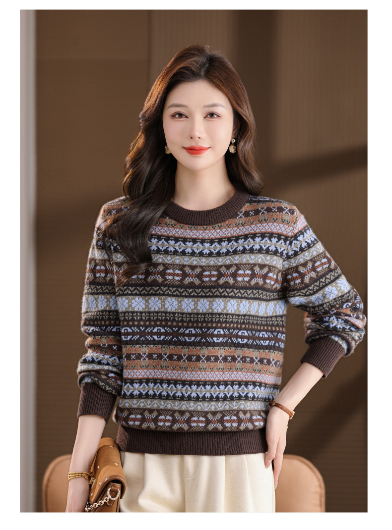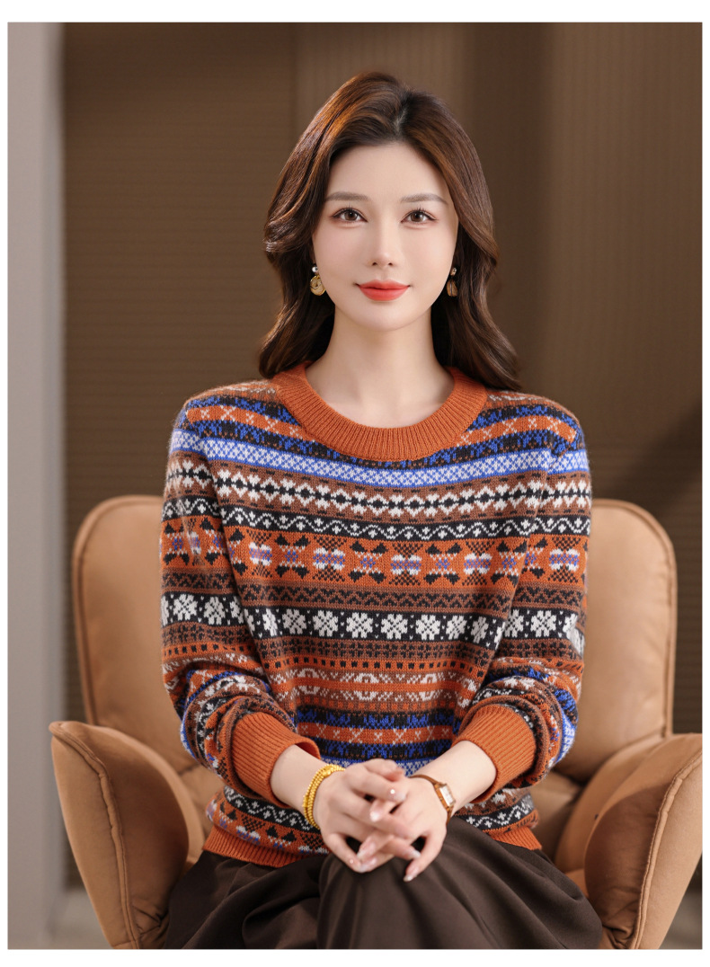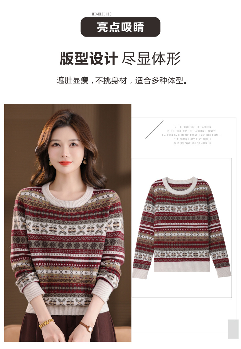 CC 101-88602羊毛圆领毛衣民族风条纹提花宽松针织打底衫