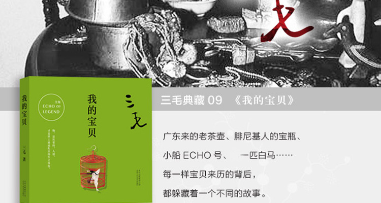 《我的宝贝》一书中,三毛向读者们展示了86件珍藏多年的宝贝,她并未刻意编排,而是抽到哪一张照片,就去写哪一个故事。广东来的老茶壶、腓尼基人的宝瓶、小船ECHO号、结婚礼物……每一样宝贝来历的背后,都躲藏着一个不同的故事,见证了三毛所拥有的爱情、亲情和友情,以及走遍世界各地的奇妙旅程。这些宝贝并价值连城,但因为有了人的缘故,才被接纳,成了三毛生命中的印记,反映了扎实的生之欢悦。