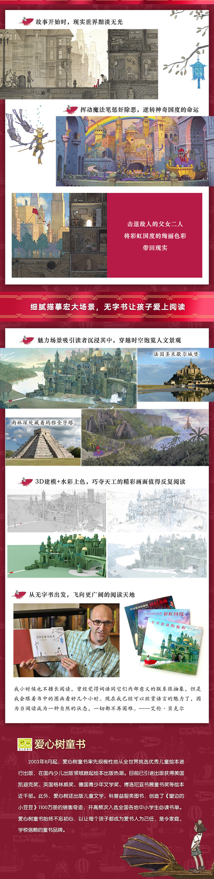 他的绘本处女作《不可思议的旅程》,构建了一个让想象力驰骋的魔法世界,出版后便荣登并长踞《纽约时报》畅销书榜,获得凯迪克大奖,在中国出版后,一举拿下年度桂冠童书、大众喜爱的50种图书等多项大奖,持续收获好评。之后两部毫不逊色的续篇《彩虹国度》与《回归之夜》,让《不可思议的旅程》成为真正的三部曲,三本书构成了一个宏大的故事,被盛赞“这场奇妙的阅读之旅,改变、拓展和丰富了儿童文学的疆域,还有很多孩子的人生”。