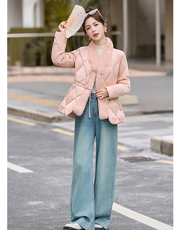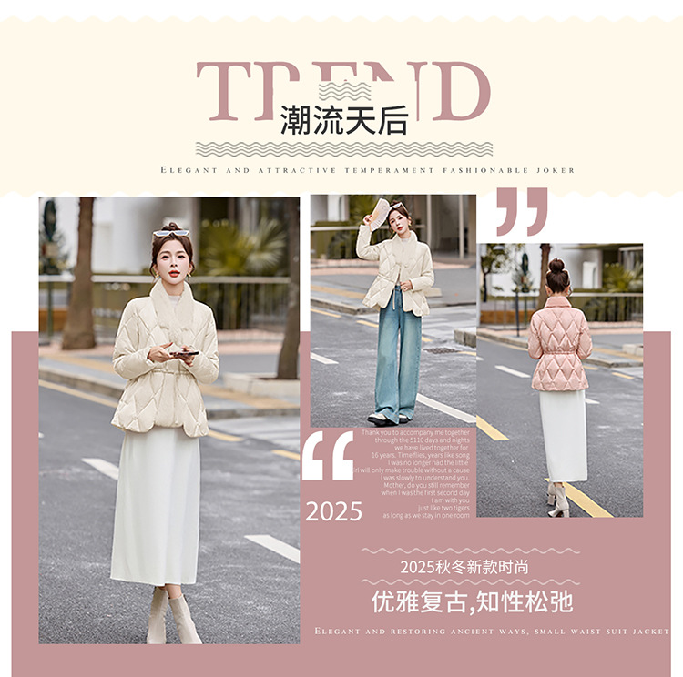 HR YJH99858新中式国风羽绒服V领提花修身白鸭绒羽绒外套