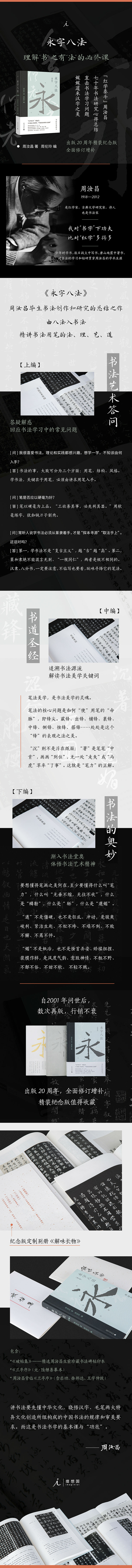 2. “永字八法”是学习书法的基本功,是理解“书”之有“法”的课。 “永字八法”是古人以“永”字为例,概括总结出的楷书八种基本笔画的书写要点,堪称书法学习的基本法则,也是学习书法的基本功,更是理解“书”之有“法”的课。本书上编《书法艺术答问》,即以对话的形式,细致解读“八法”诞生的来龙去脉,具体分析横竖撇点捺的书写规则,执笔、用笔、运笔的技巧,对实际书写中遇到的问题答疑解惑。中编《书道》,更是从宏观的书法史的层面,进一步阐释书法的源头、法度和美学趣味。