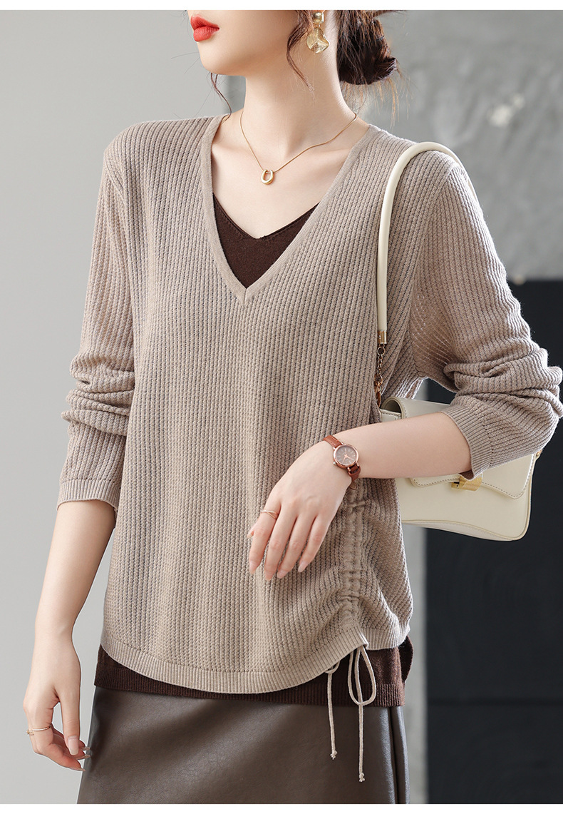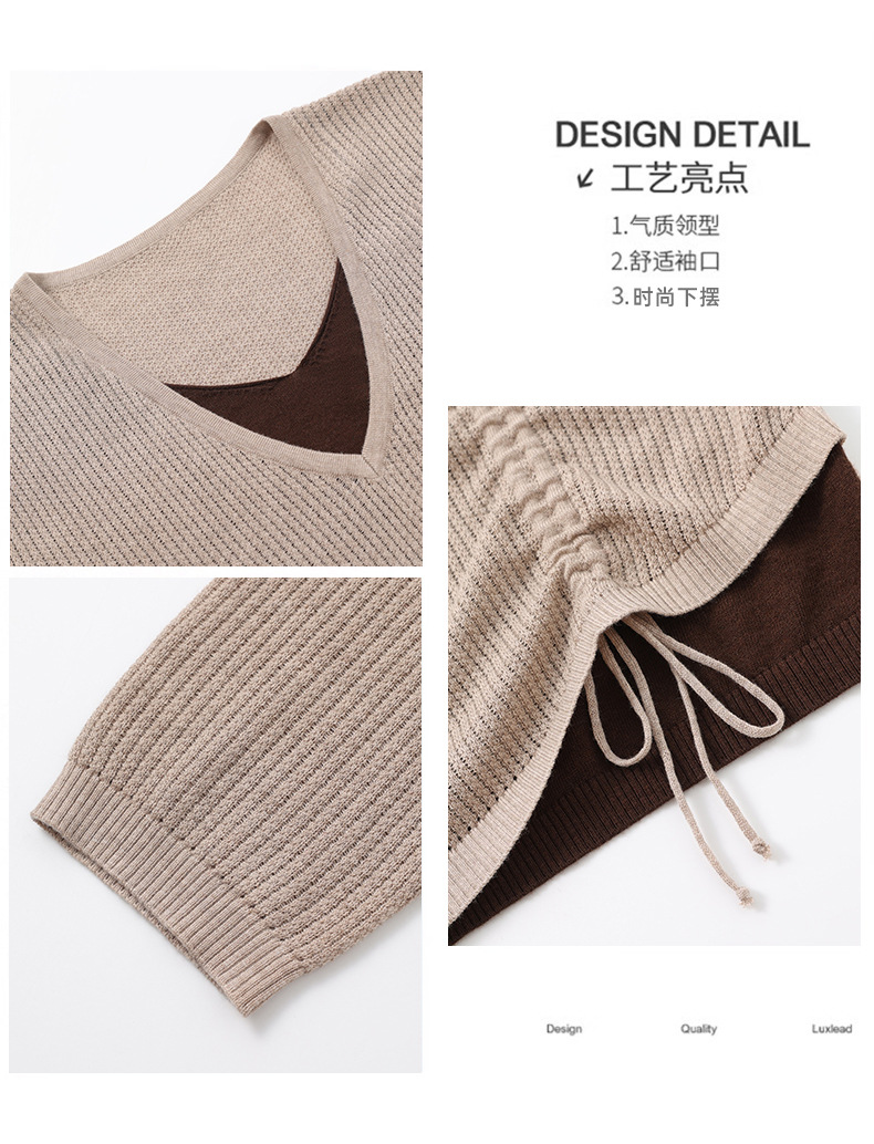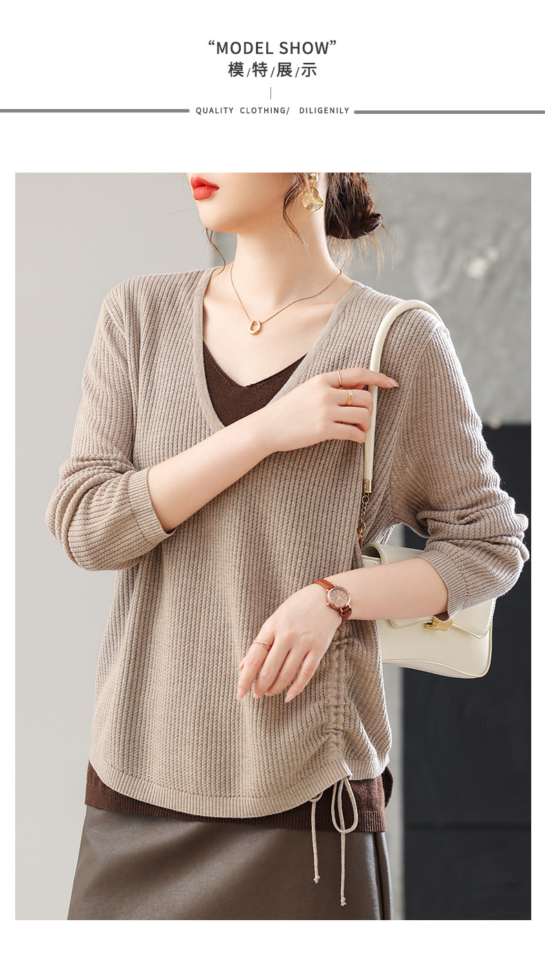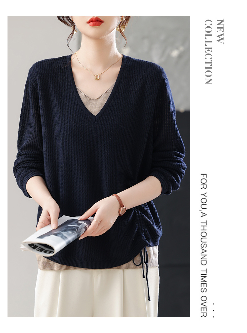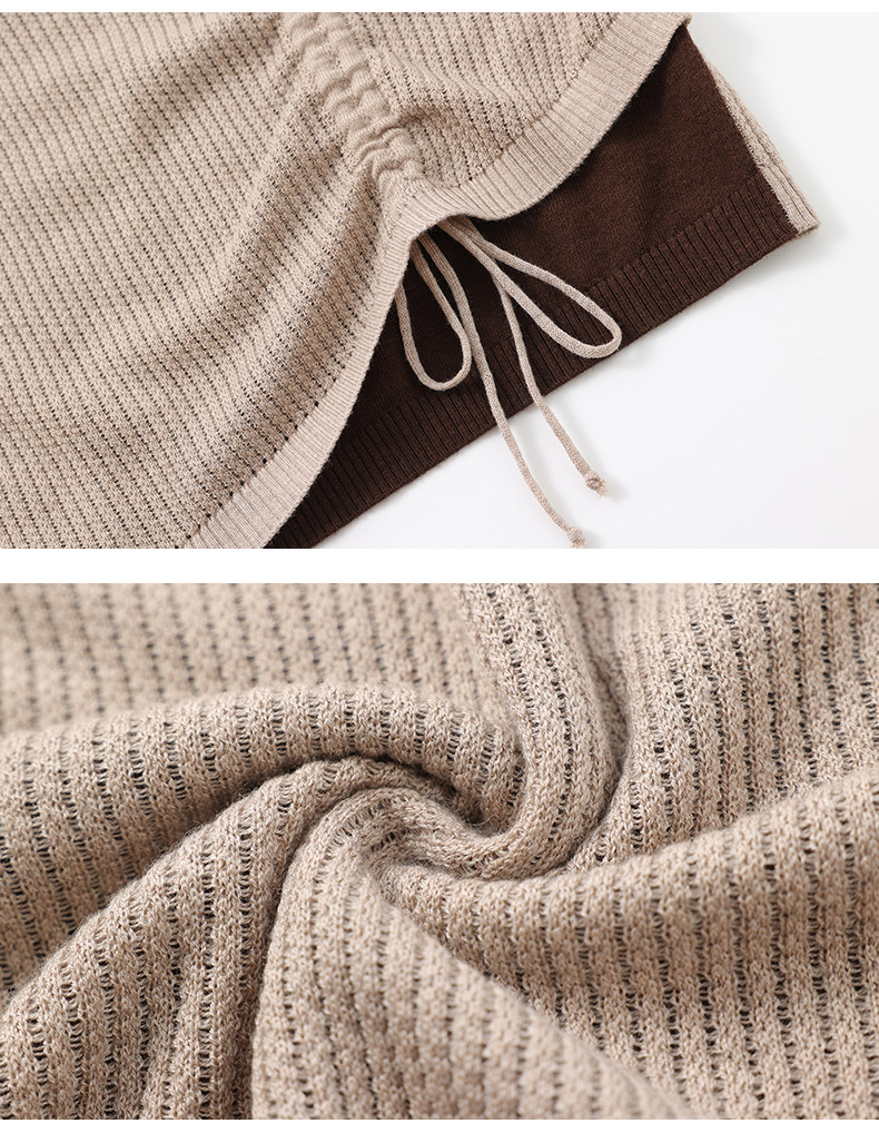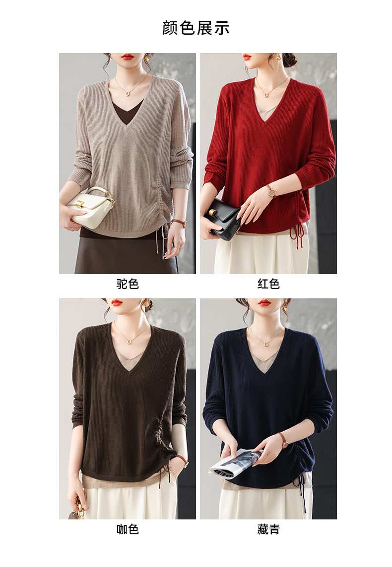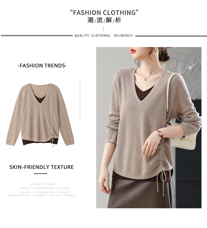 CC2025秋季新款女装美拉德撞色假两件针织衫宽松遮肚子显瘦抽绳上衣