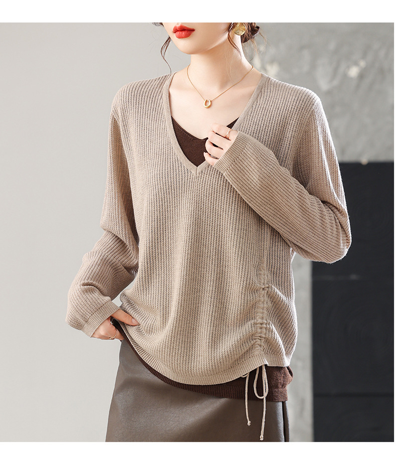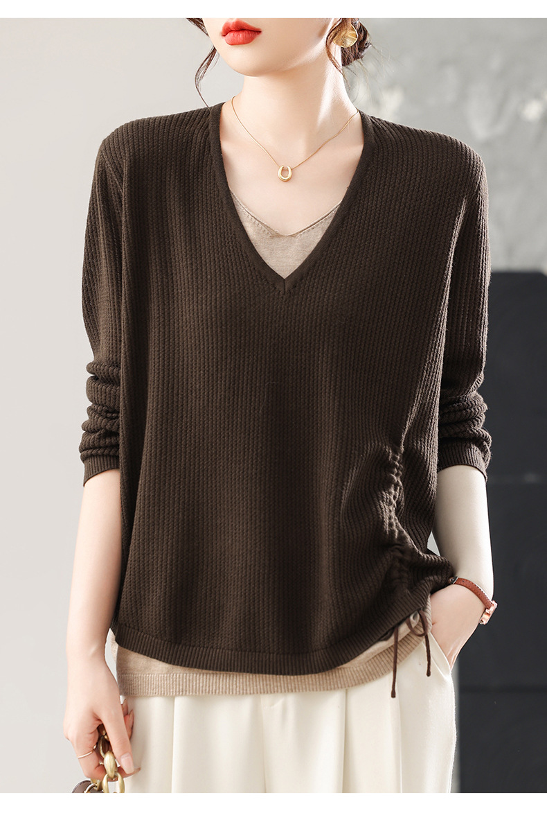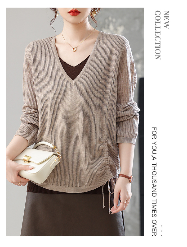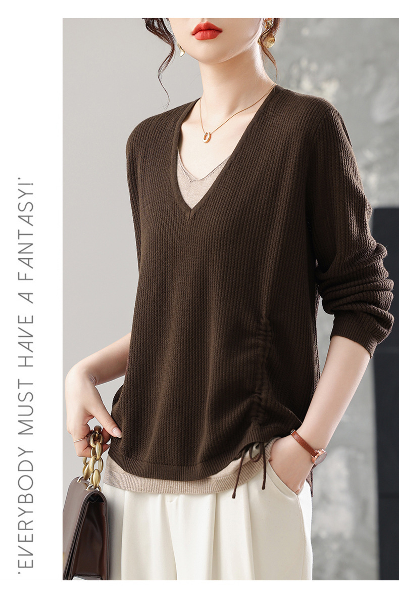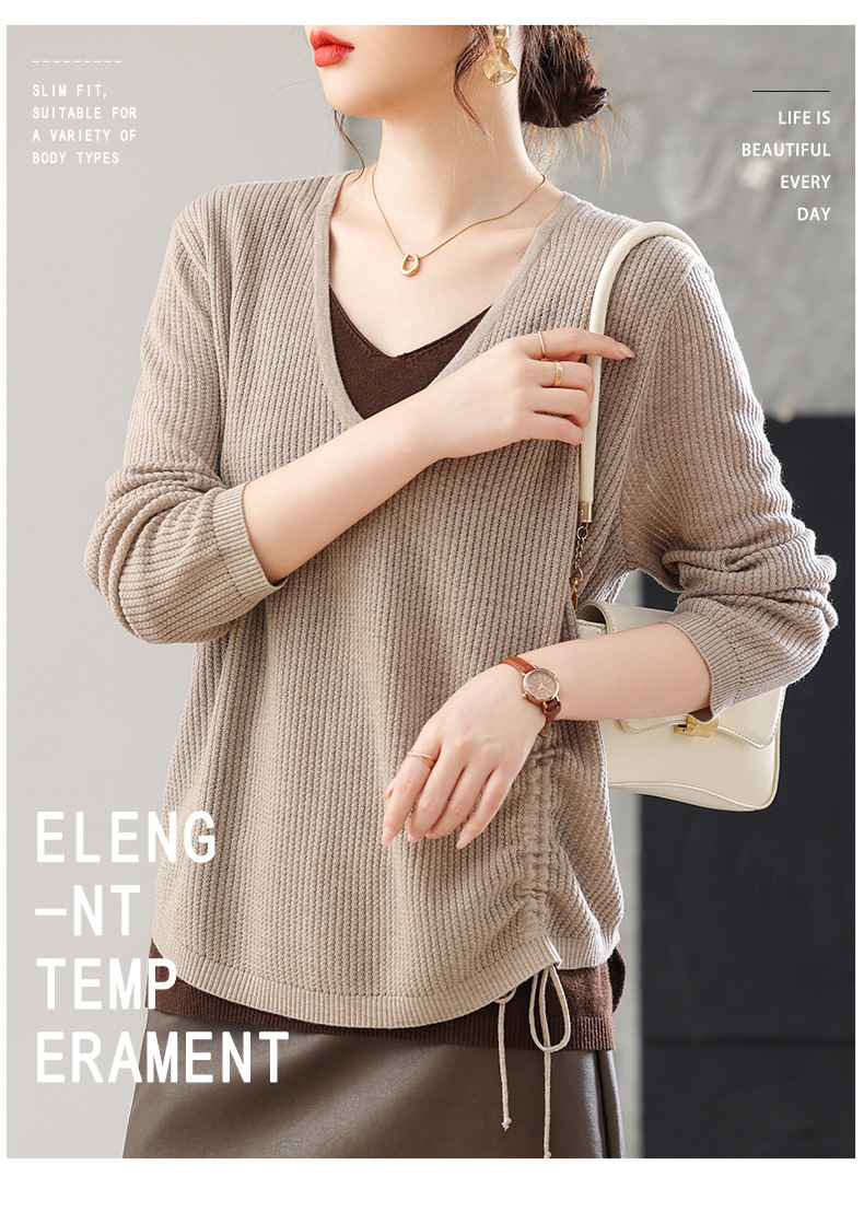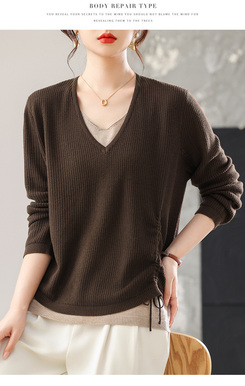 CC2025秋季新款女装美拉德撞色假两件针织衫宽松遮肚子显瘦抽绳上衣