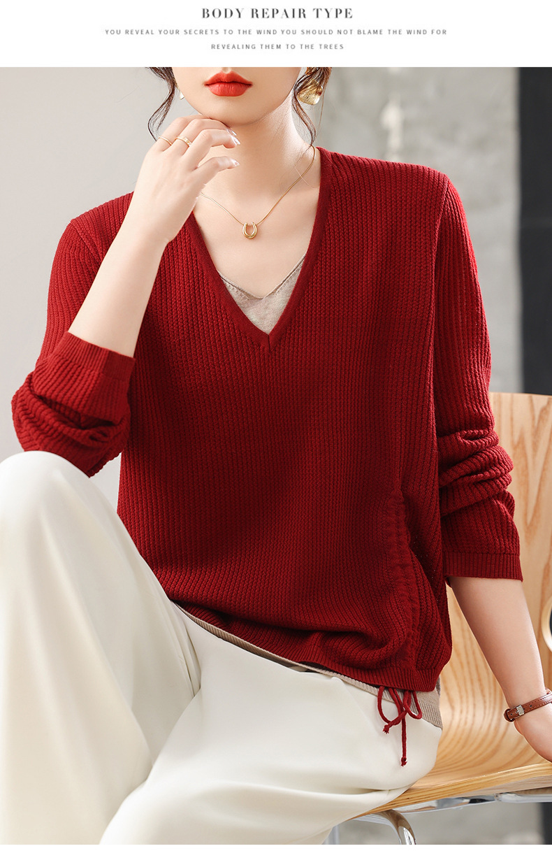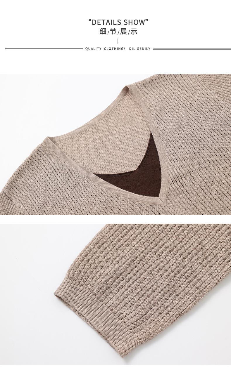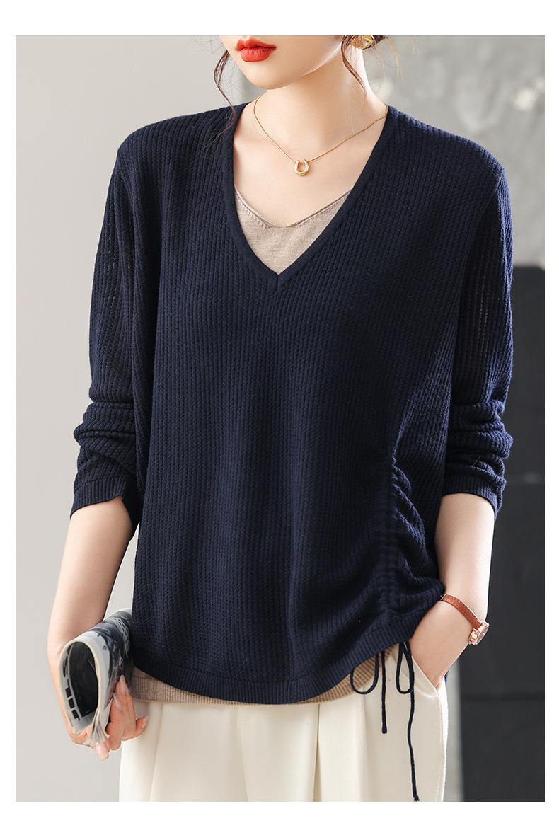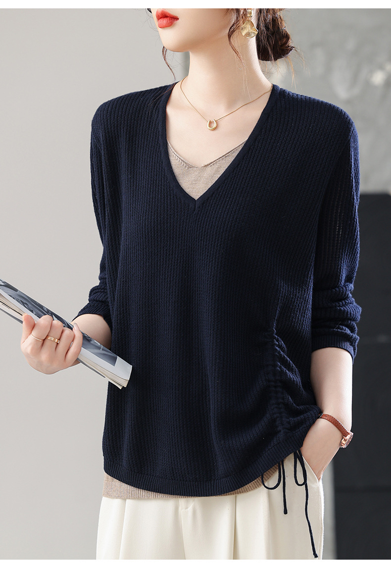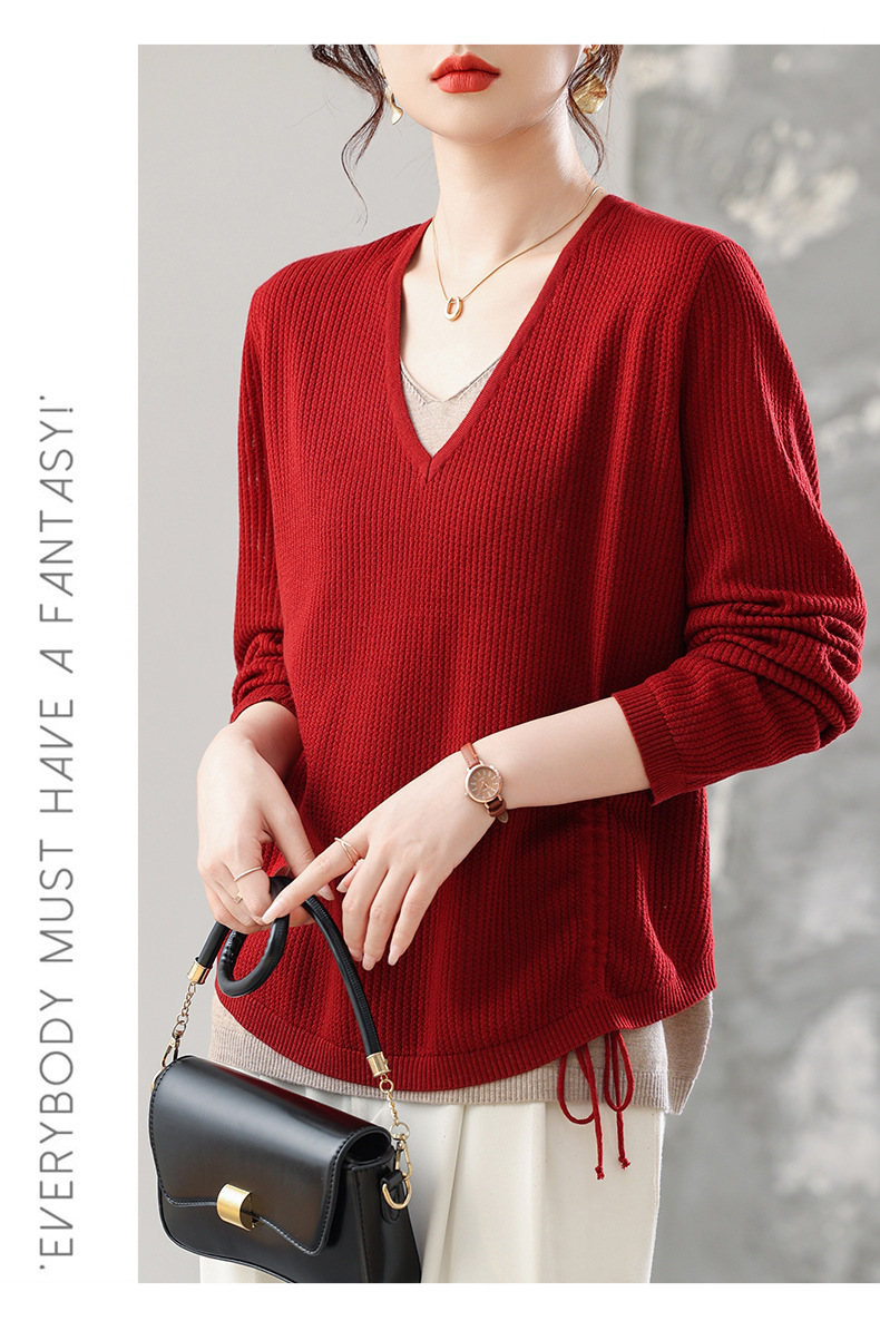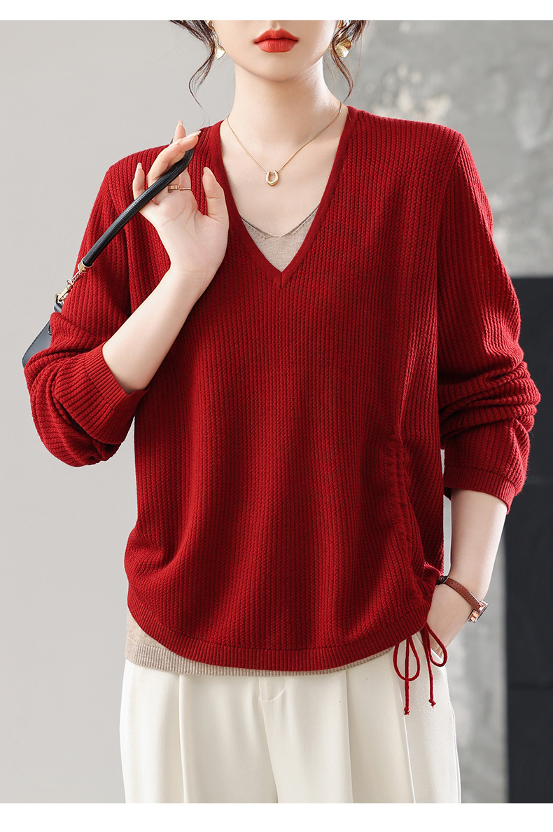 CC2025秋季新款女装美拉德撞色假两件针织衫宽松遮肚子显瘦抽绳上衣