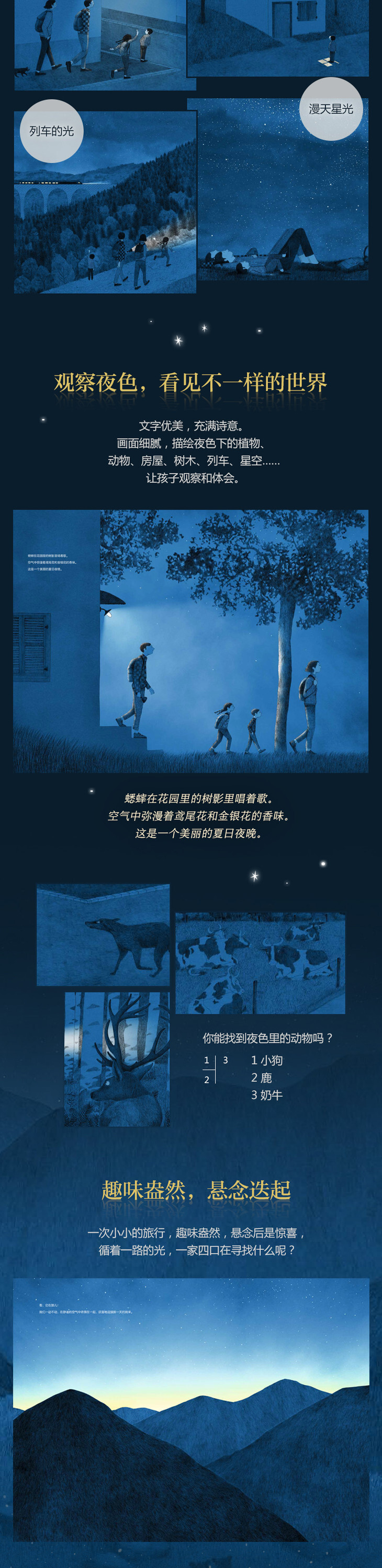 图画精美,夜晚层次丰富的蓝调和或明或暗的光,引导孩子感受静谧,观察植物、动物、房屋、树木、列车、星空……