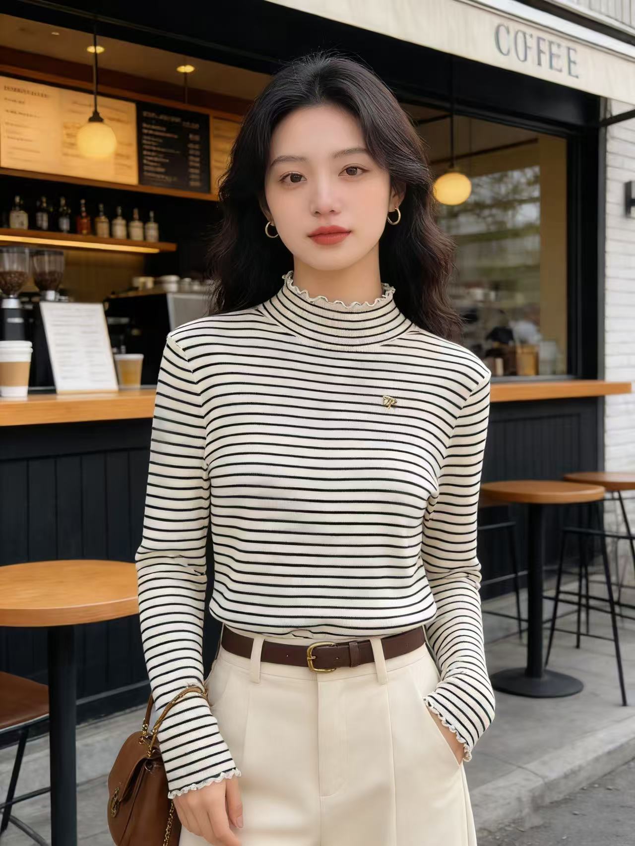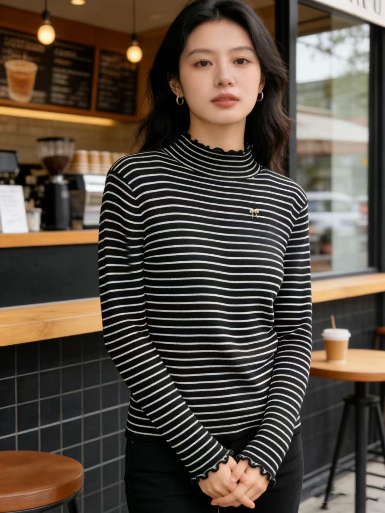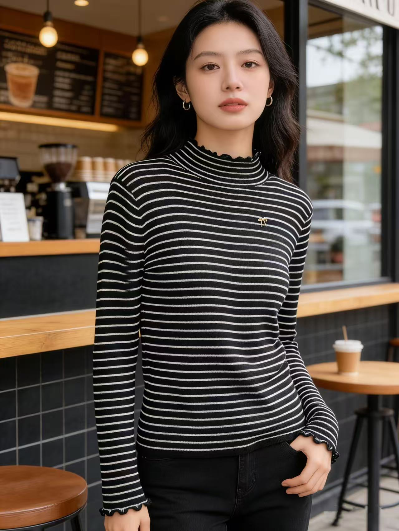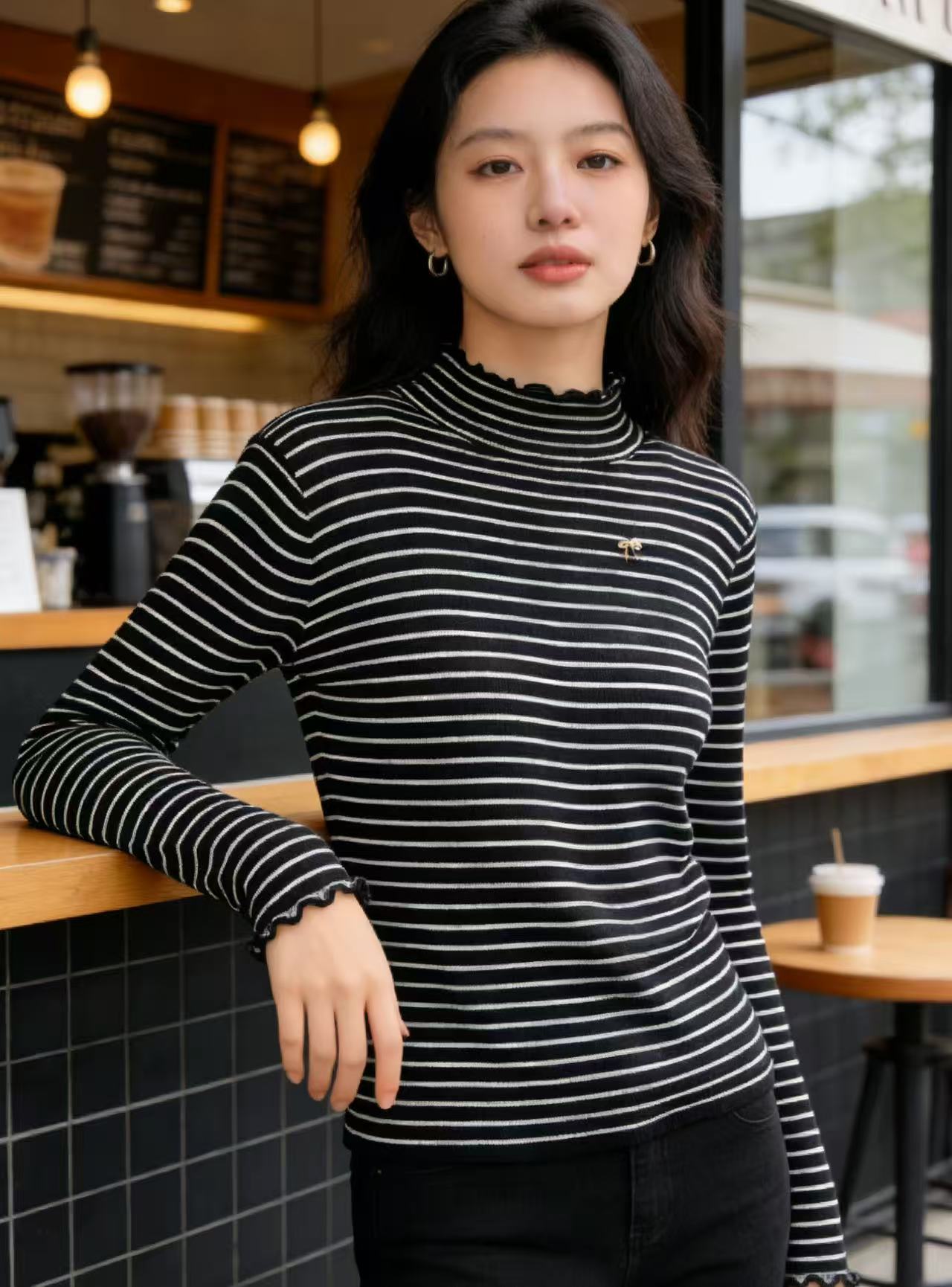 418良粉节|2026 活动爆款 羊毛衫!春薄款!品牌促➡️【自营】衣周期格亿(6%羊毛)9196木耳边半高领条纹百搭针织上衣-喜出