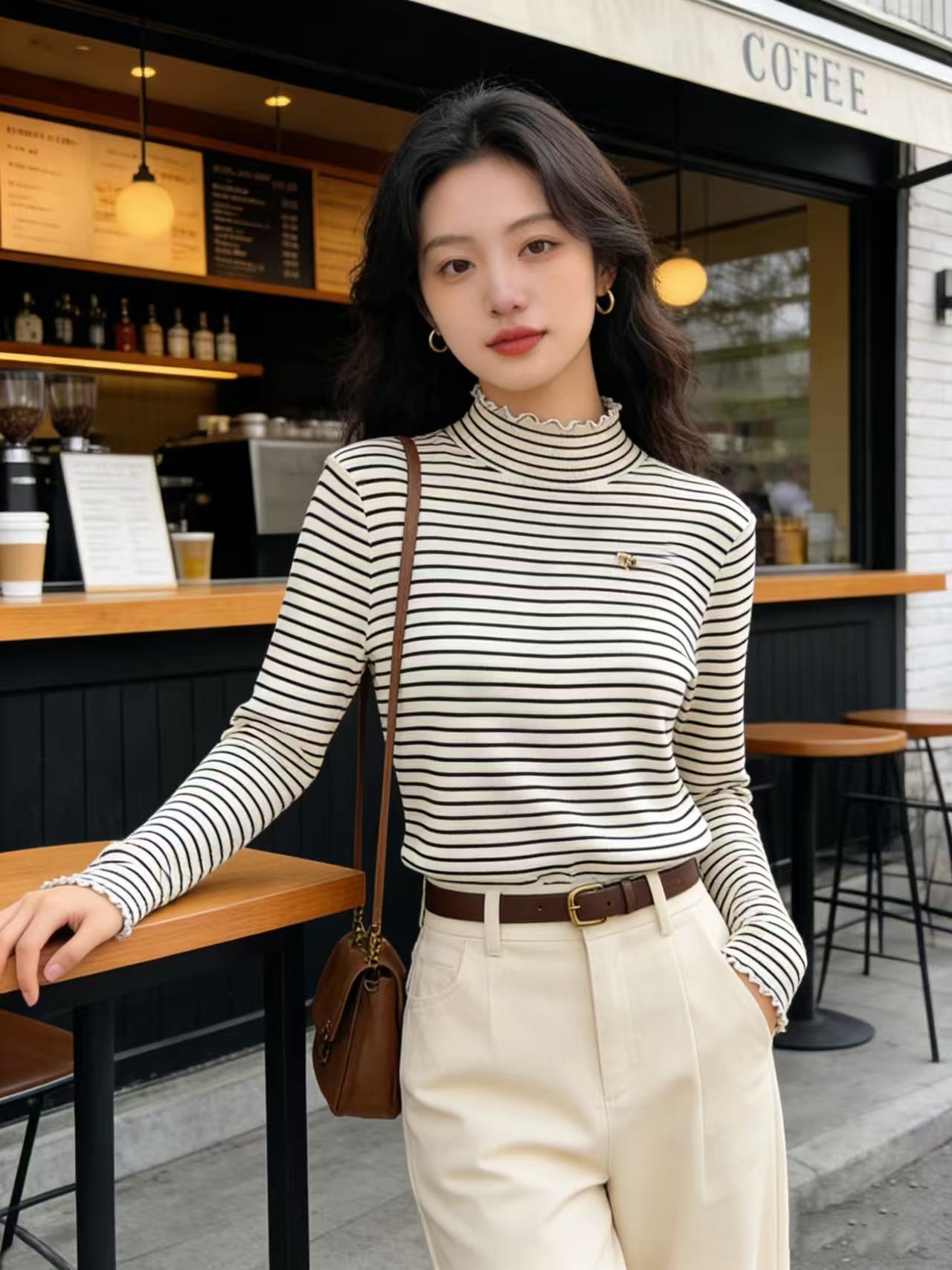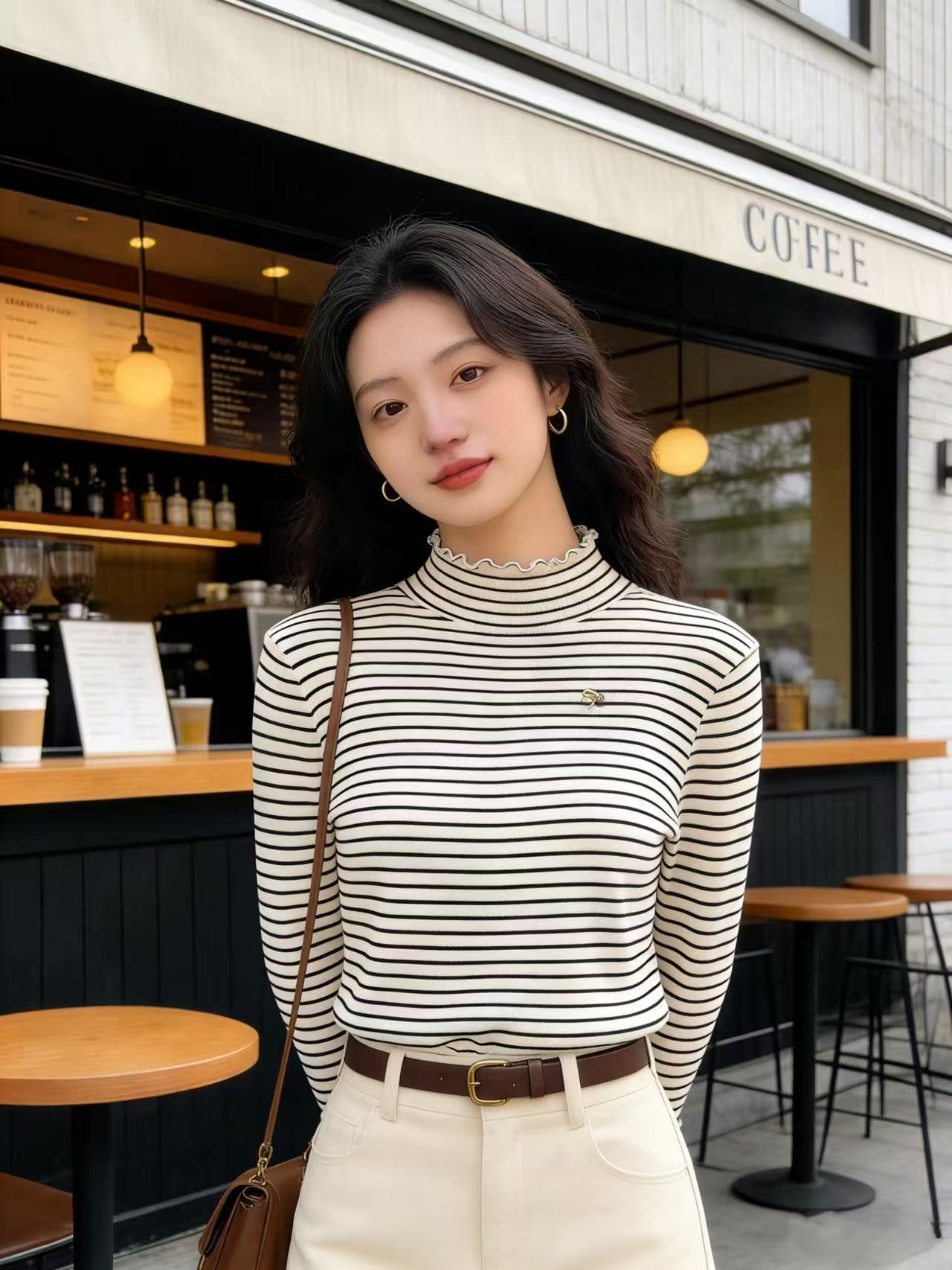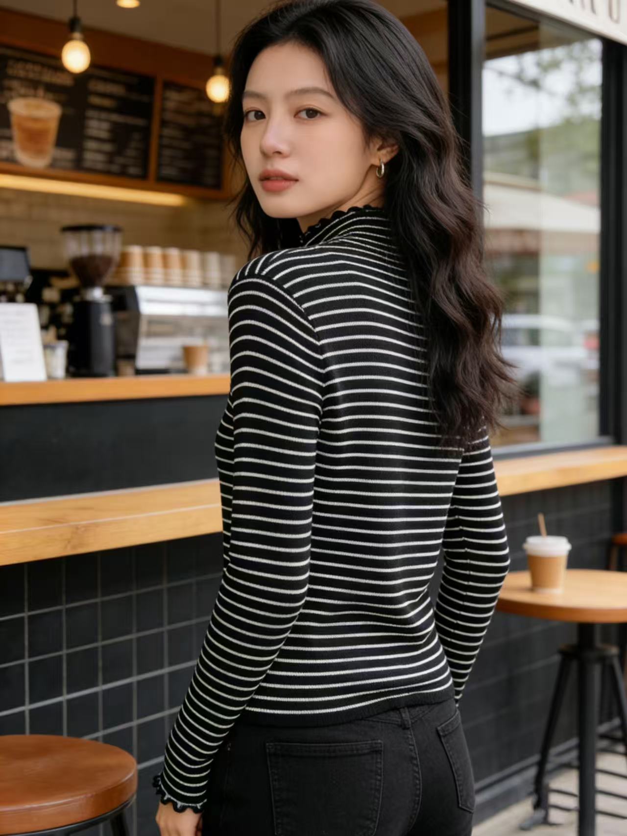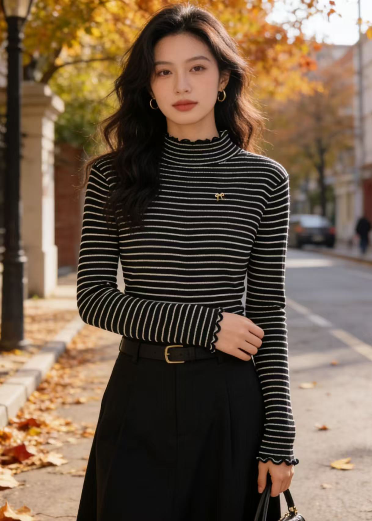 418良粉节|2026 活动爆款 羊毛衫!春薄款!品牌促➡️【自营】衣周期格亿(6%羊毛)9196木耳边半高领条纹百搭针织上衣-喜出