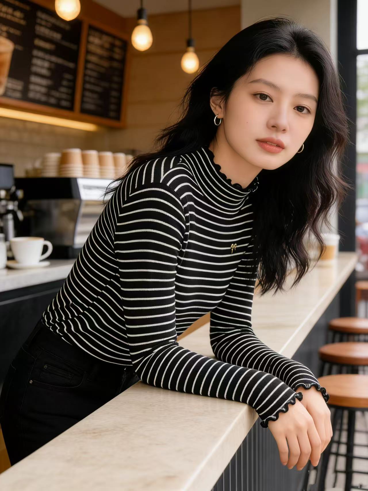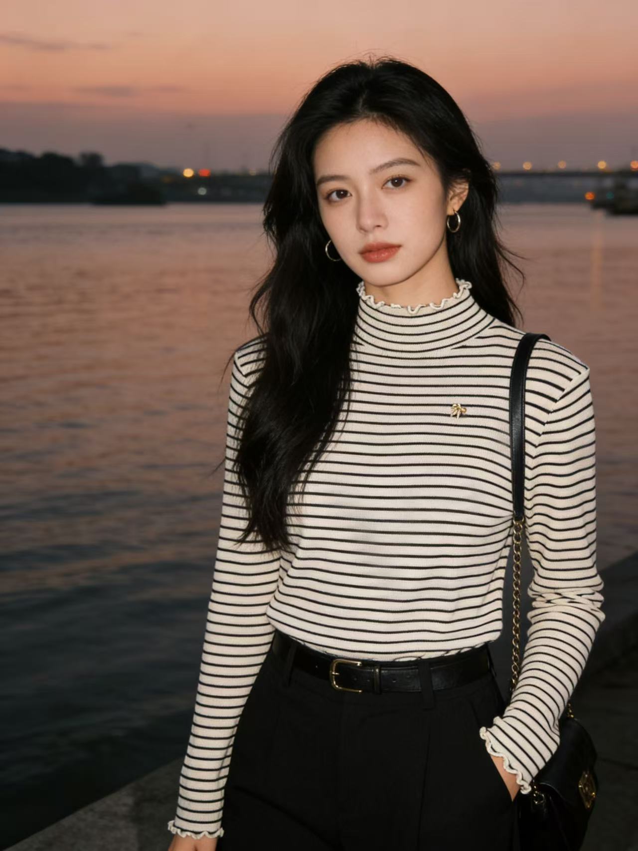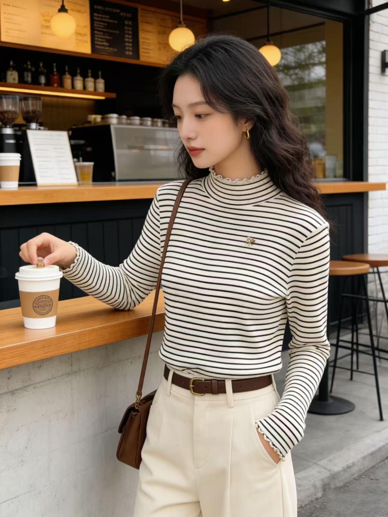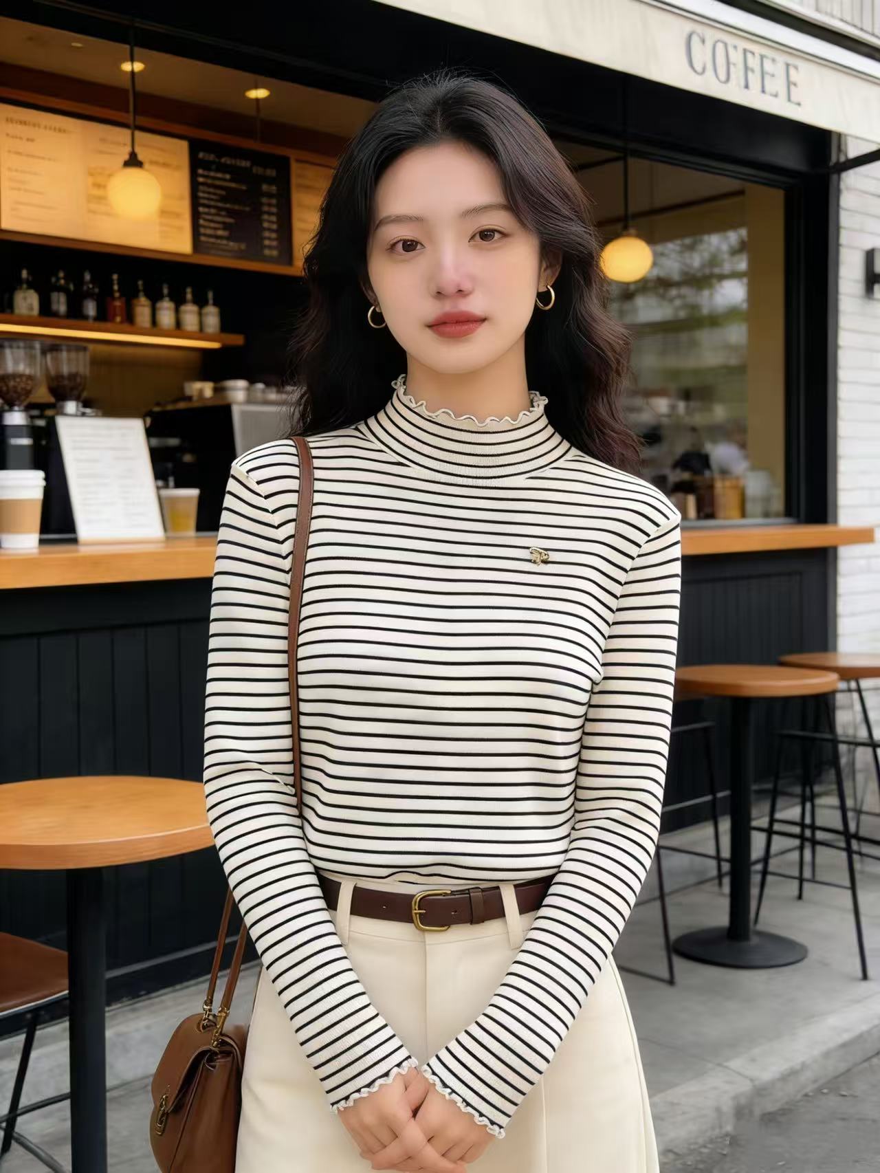 418良粉节|2026 活动爆款 羊毛衫!春薄款!品牌促➡️【自营】衣周期格亿(6%羊毛)9196木耳边半高领条纹百搭针织上衣-喜出