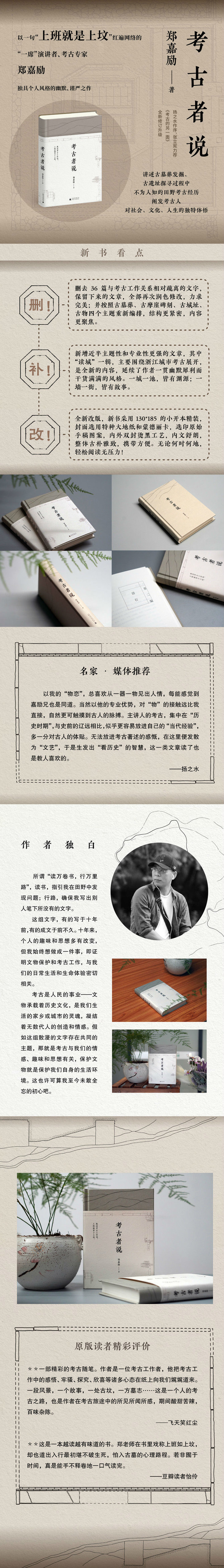 作为常年扎根田野的考古学家,郑嘉励老师对物的体贴总是较常人更为深入。无法装进考古报告、学术论文、和科普文章的感慨和体悟,便自成一格,成为一种全新的学者型散文。墓地背后的生死悲欢,城址深处的历史故事,考古行旅中的所思所感,均成为他的写作素材,时而让读者会心一笑,时而让读者拍案叫绝,并生发出对人生、历史的独特感悟和思考。