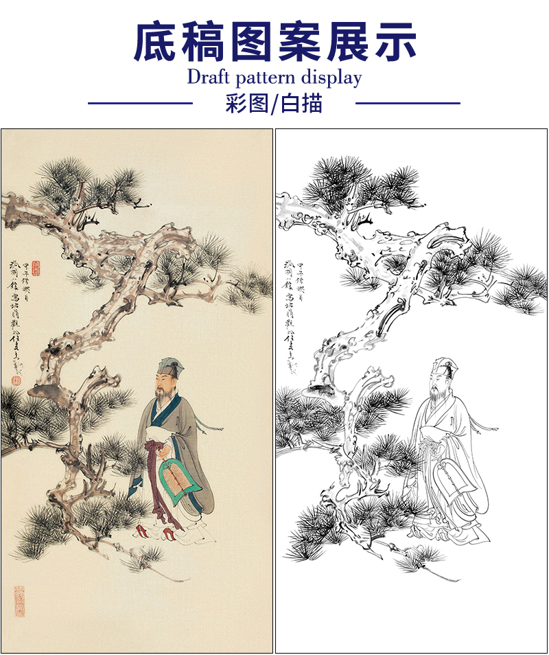 任重山水人物工笔画白描底稿《观松图》临摹勾线高清打印稿RD67