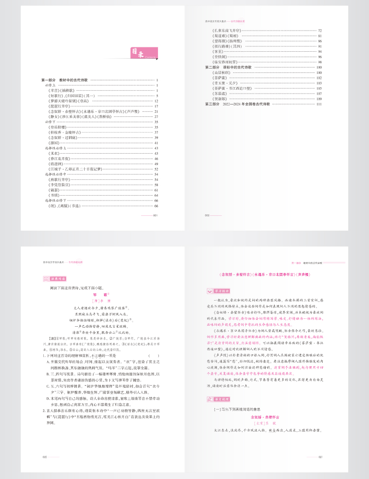 本书为“从课本到高考”高中语文系列图书。本系列图书立足高中语文教材,回应新高考教考衔接的考查趋势,将高中阶段的五本教材对接新高考题型,进行了分类梳理。按照信息类文本、文学类文本、古诗文、名篇名句默写四分册,将课文以习题的方式分别加以梳理。本册为古诗文专题。古文部分,提供断句技巧、重点词解释、重点句翻译等习题训练;古诗部分,提供重点词解释、艺术特色鉴赏、默写、课文拓展等习题训练。通过针对性的指导和练习,切实提高学生的答题技巧,补齐语文学习中可能存在的短板,更好地应对新高考。