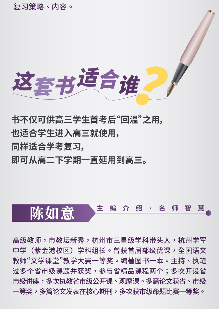 陈如意,高级教师,市教坛新秀,省网络名师工作室学科带头人,现任职于杭州学军中学。曾获教育部“优课”、全国语文教师“文学课堂”教学大赛一等奖;多次开设省市级讲座,多次执教省市级公开课、观摩课。多篇论文获省、市级一等奖,多篇论文发表在核心期刊,出版编著一本。主持、执笔过多个省市级课题并获奖,参与省精品课程两门,自主研发过选修课程;命题多次获得市级一等奖。