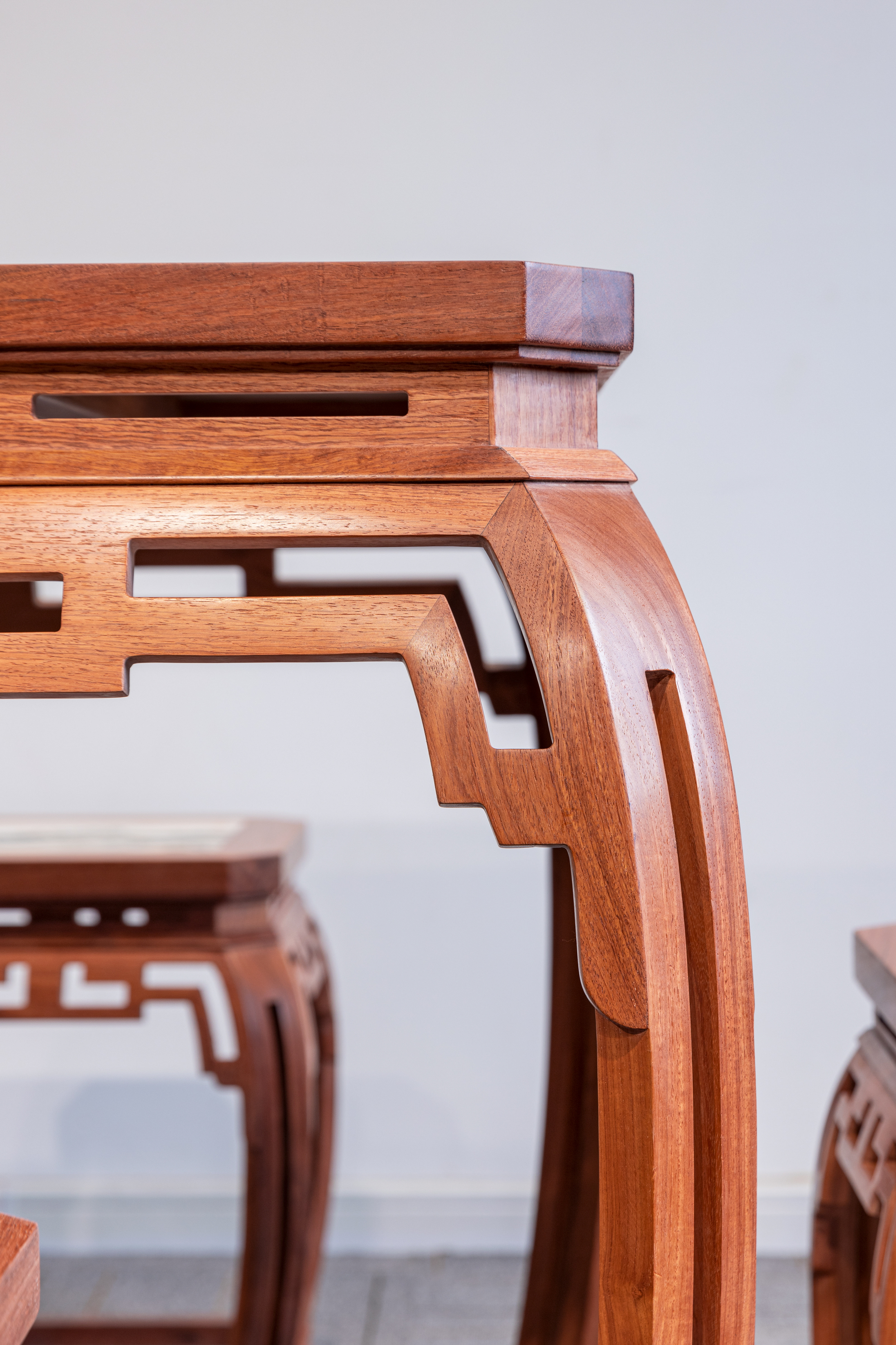 此款文竹方桌,原型来自北京故宫博物馆,是清代中期的家具,方形抹角桌面,攒框镶心有穿带,经典复刻,带束腰,细长矩形透孔,下落托腮,层次立体,透空曲尺牙子疏密有度,四腿作鼓腿彭牙状,顺弯开料一木一腿钧开长方形透孔,腿末延饰回纹,富贵不断,委角托泥,上下呼应,四矮足契木钉,其型灵秀可人,清新淡雅。凳制式相同。