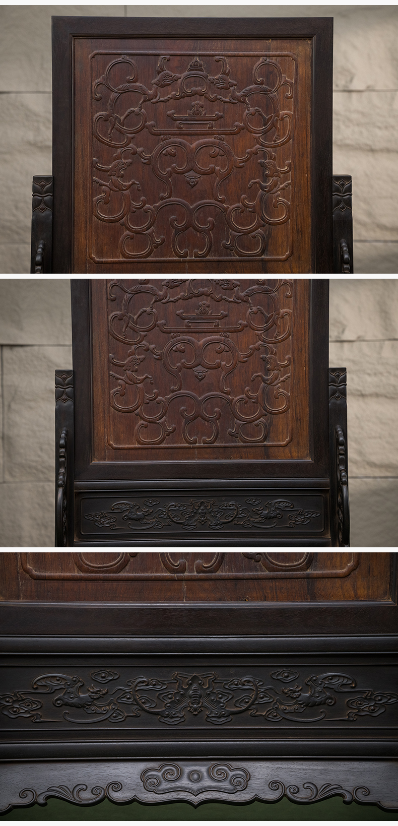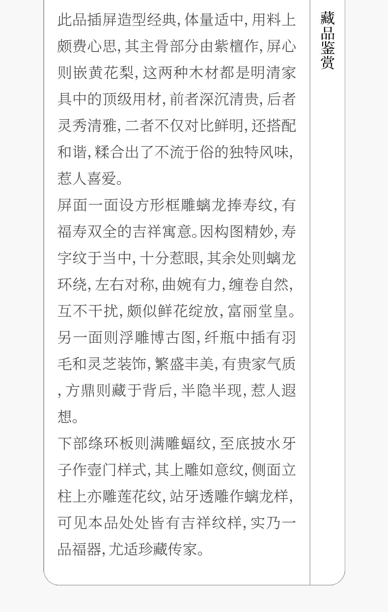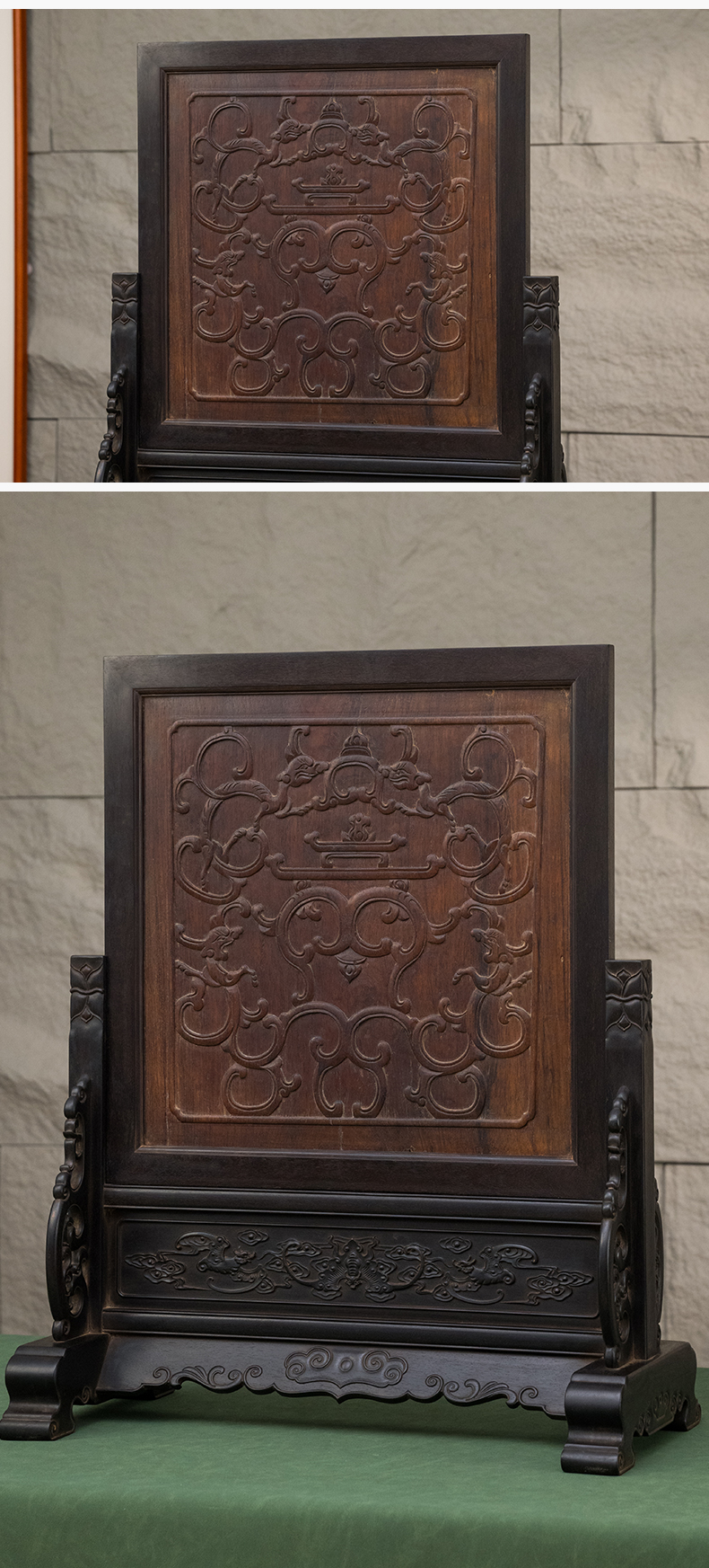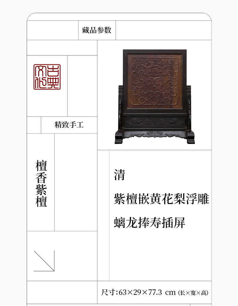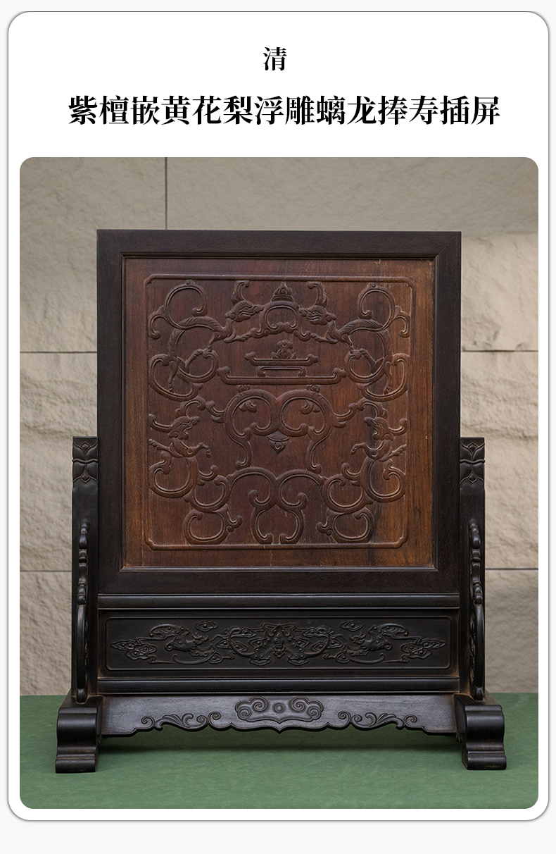 清 紫檀嵌黄花梨浮雕螭龙捧寿插屏