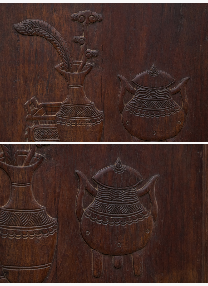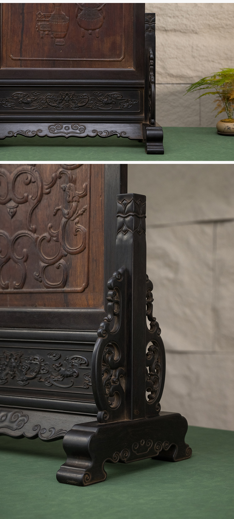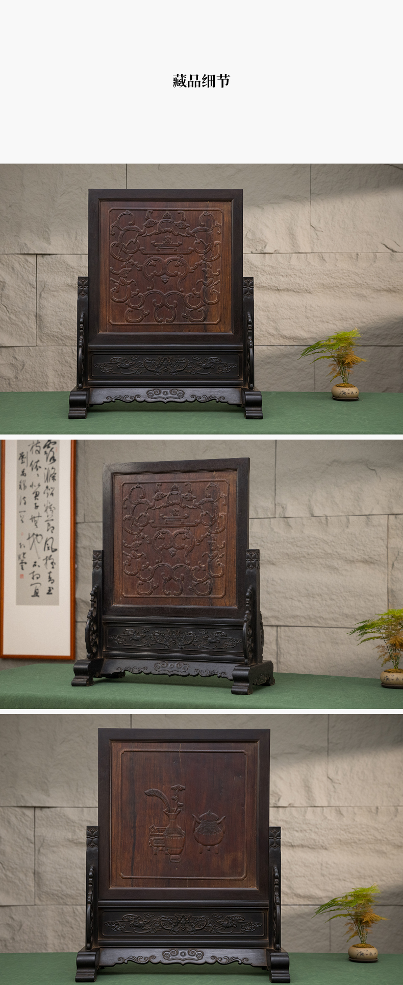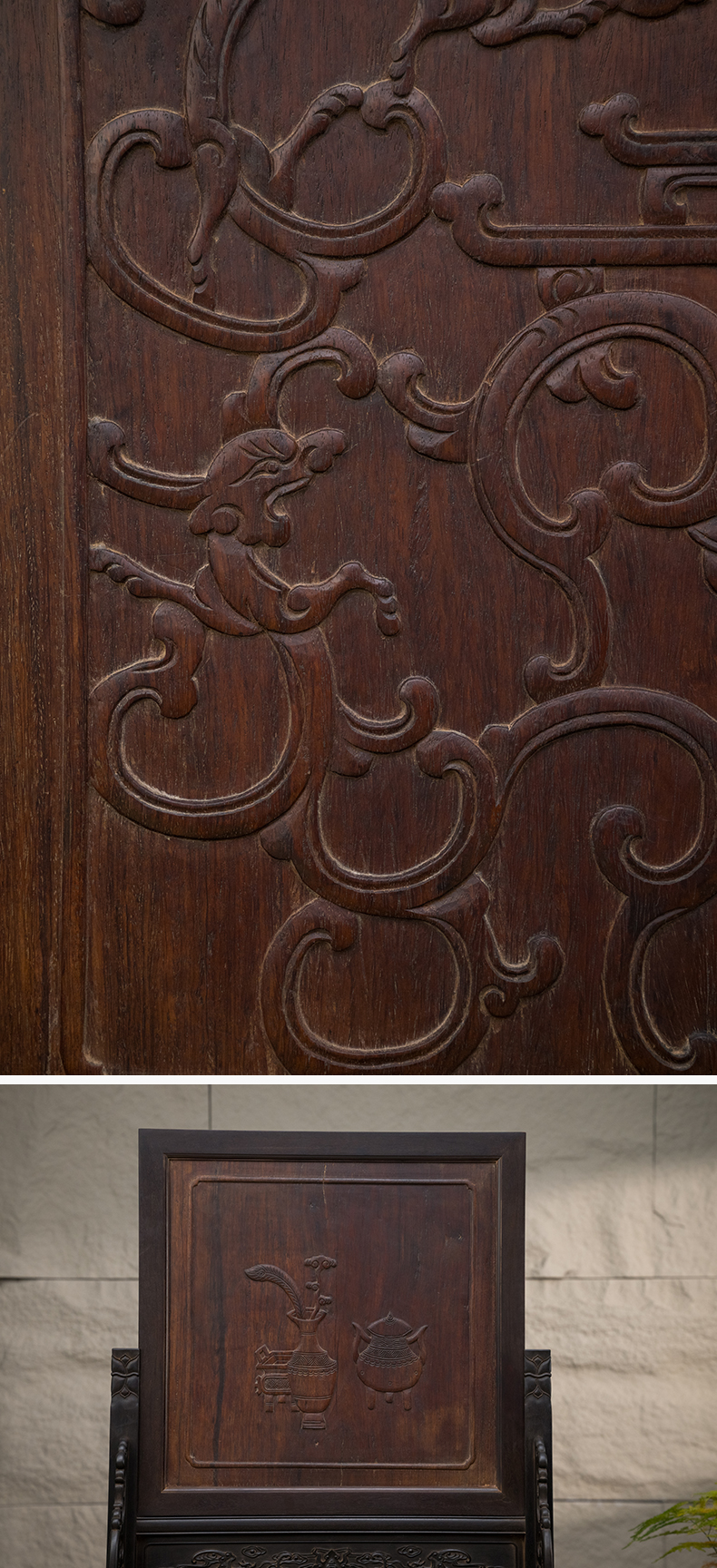 清 紫檀嵌黄花梨浮雕螭龙捧寿插屏