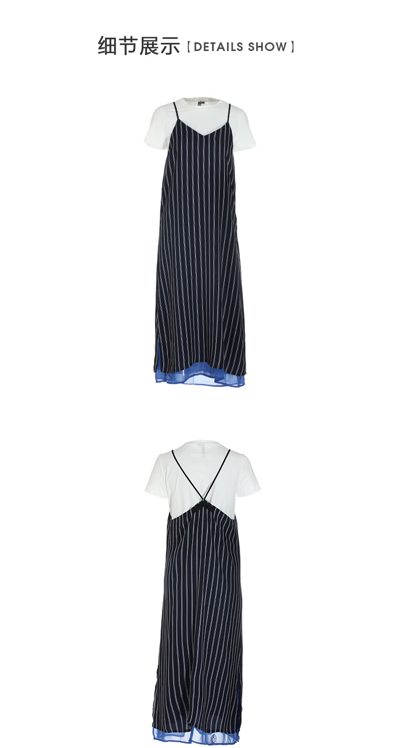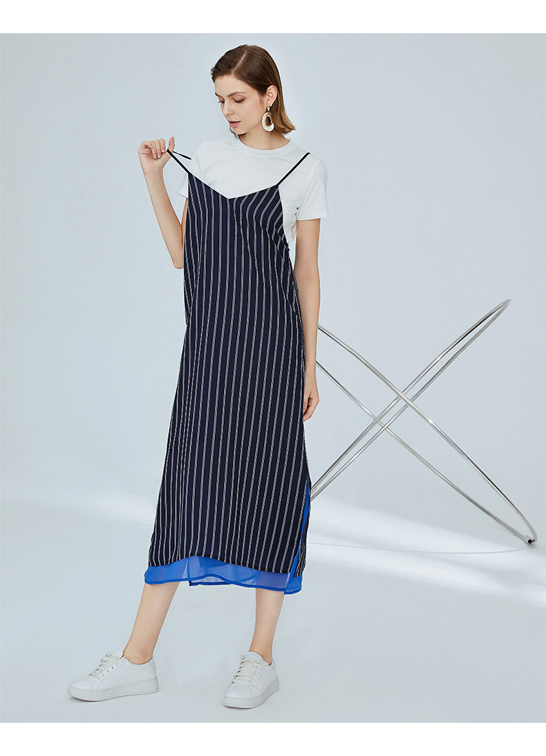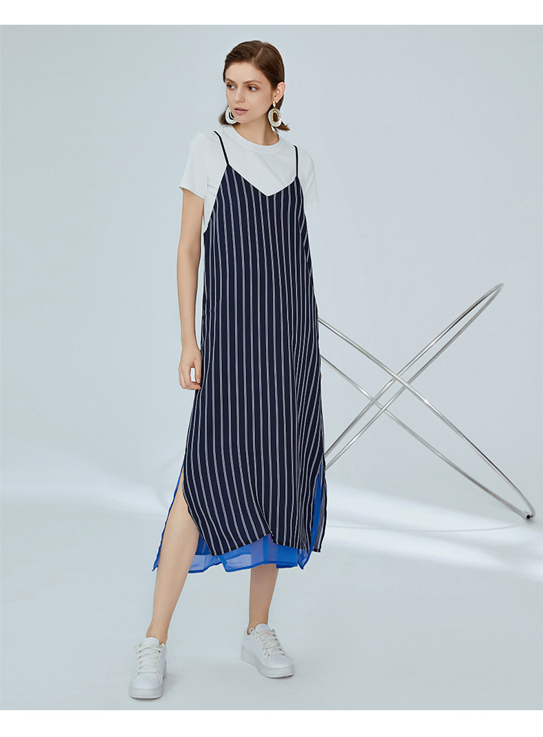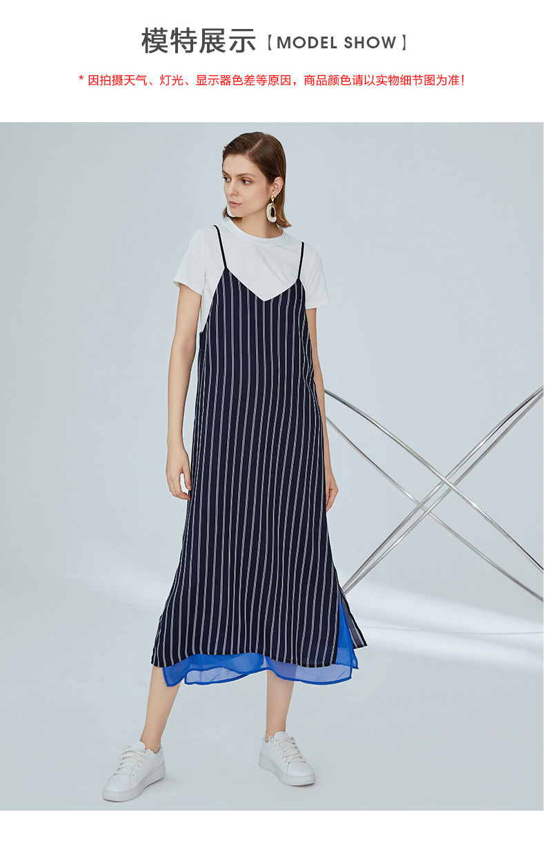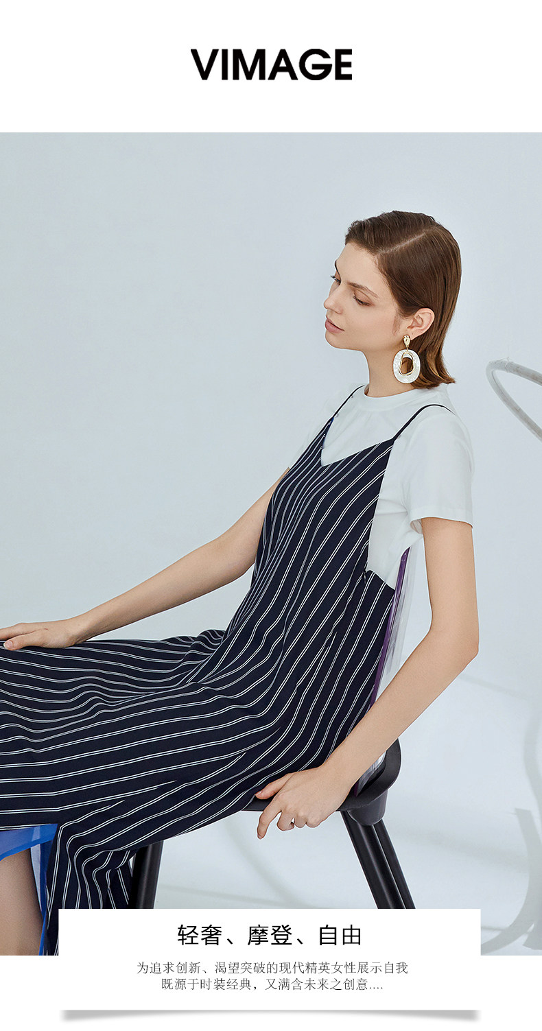 VIMAGE纬漫纪女装夏季宽松休闲条纹吊带假两件连衣裙长款V1107755