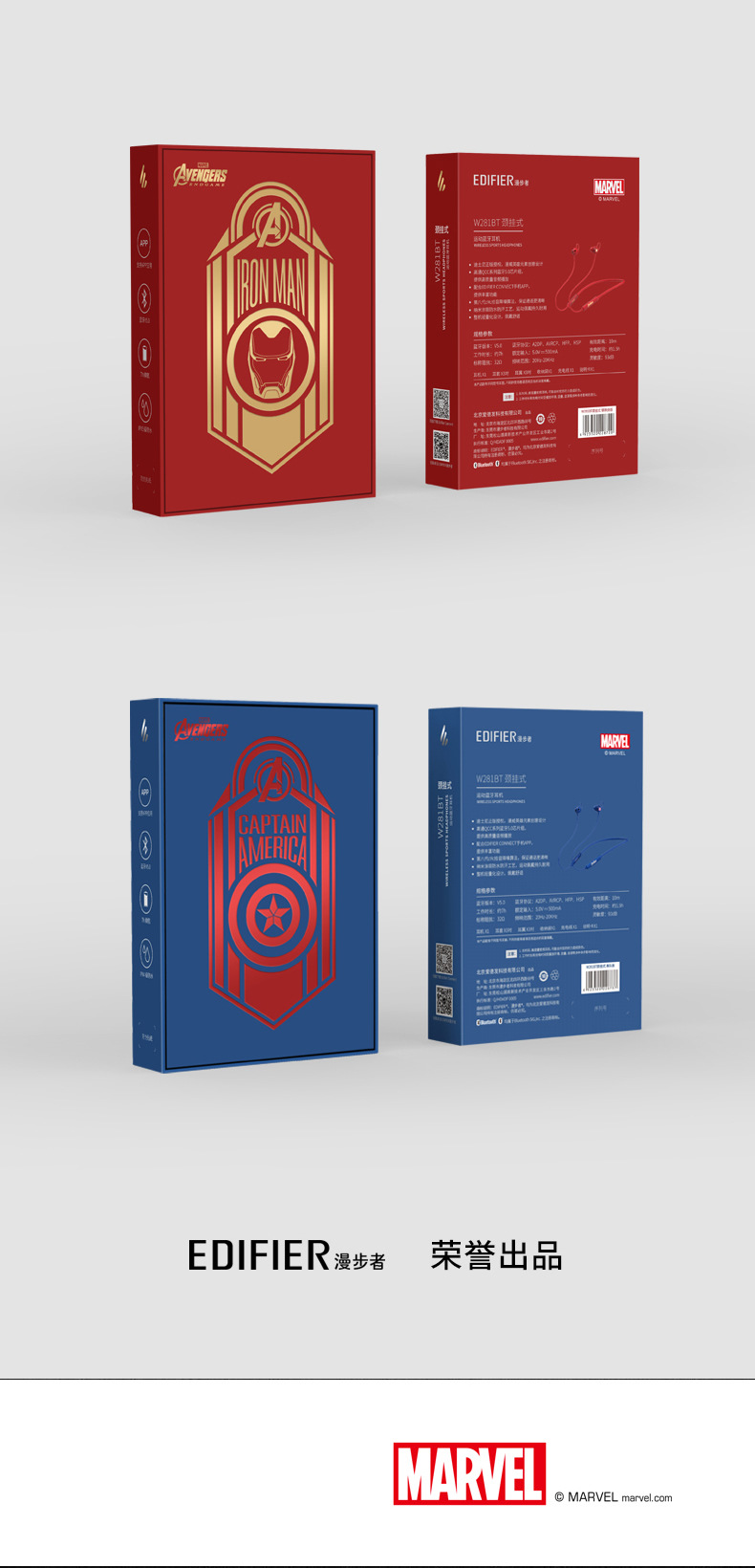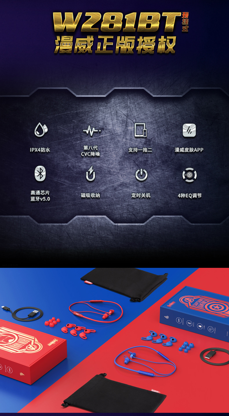 漫步者W281BT正版漫威钢铁侠蓝牙耳机无线颈挂运动美国队长复仇者联盟联名合作周边听歌立体声挂脖式蓝