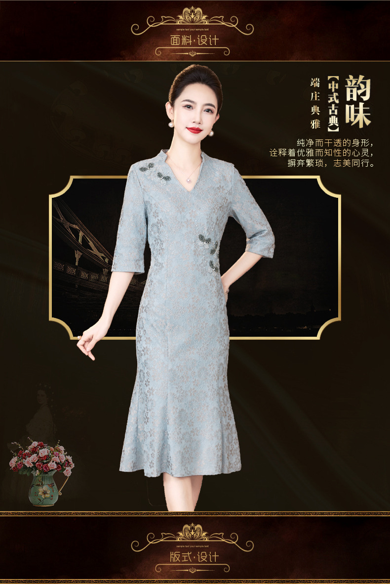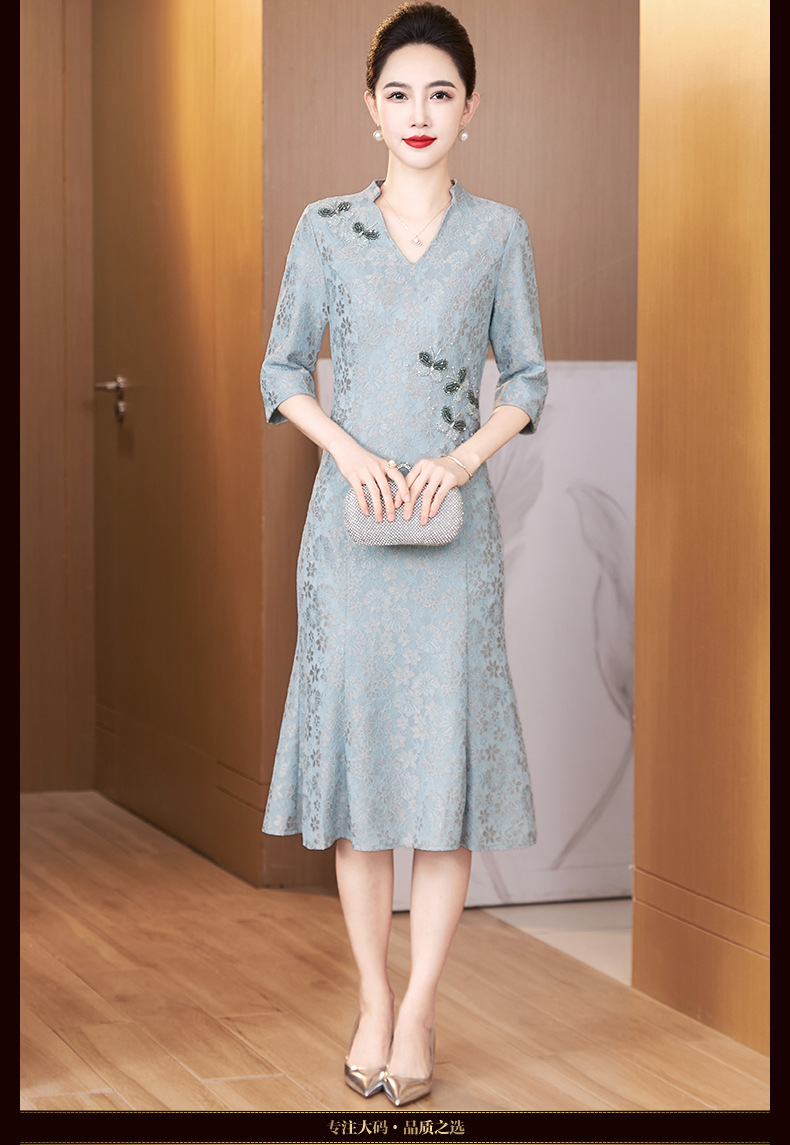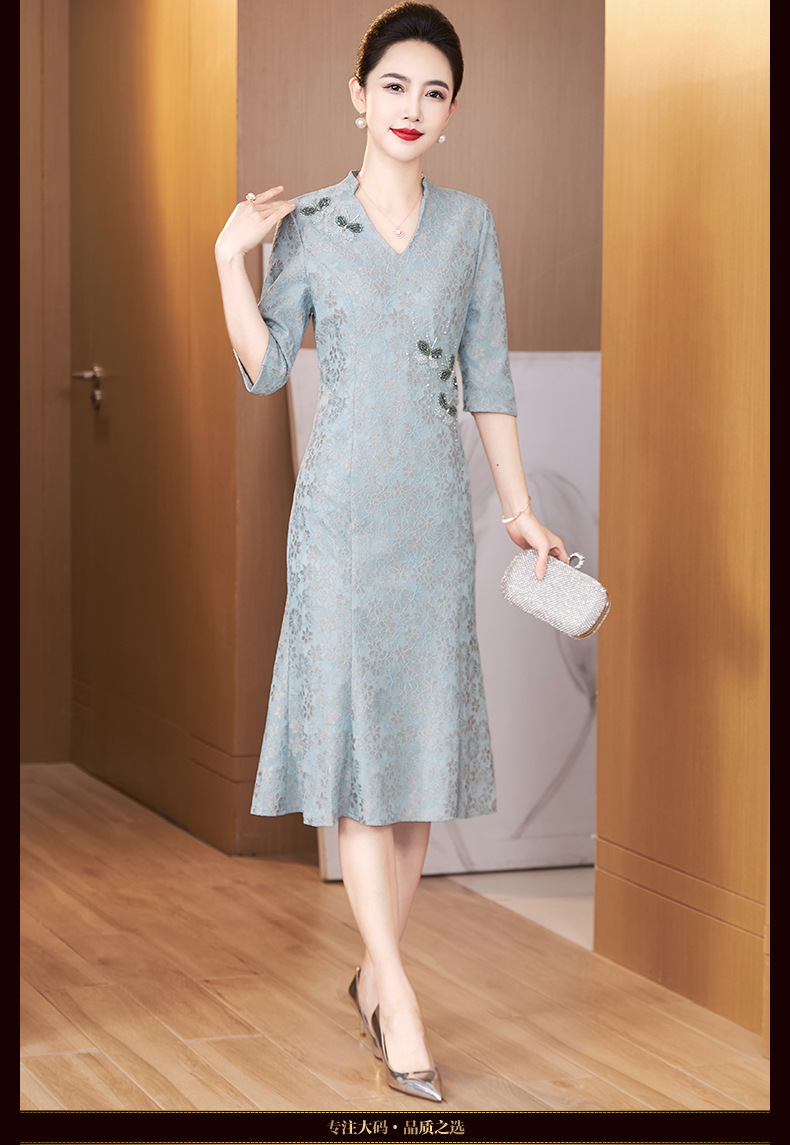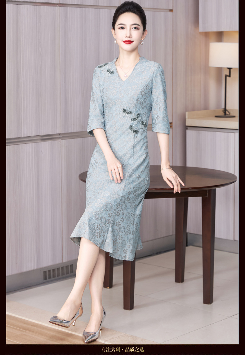 LC 2528中长款V领绣花修身时尚鱼尾裙