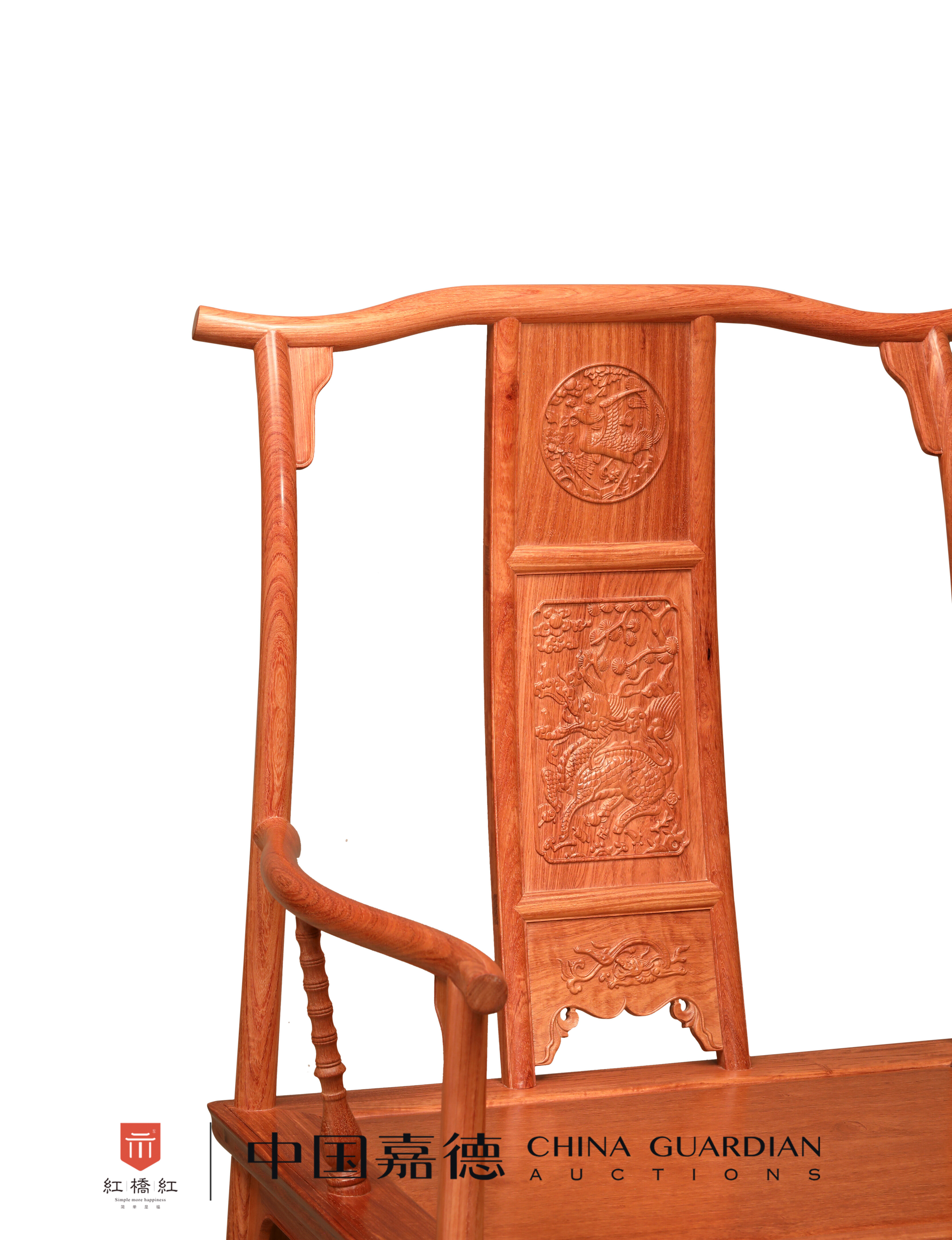 此四出头官帽椅,缅甸花梨木制作,三攒靠背板,麒麟引凤纹主题纹饰,瓶竹纹联帮棍,雕工精致,细节耐人寻味。