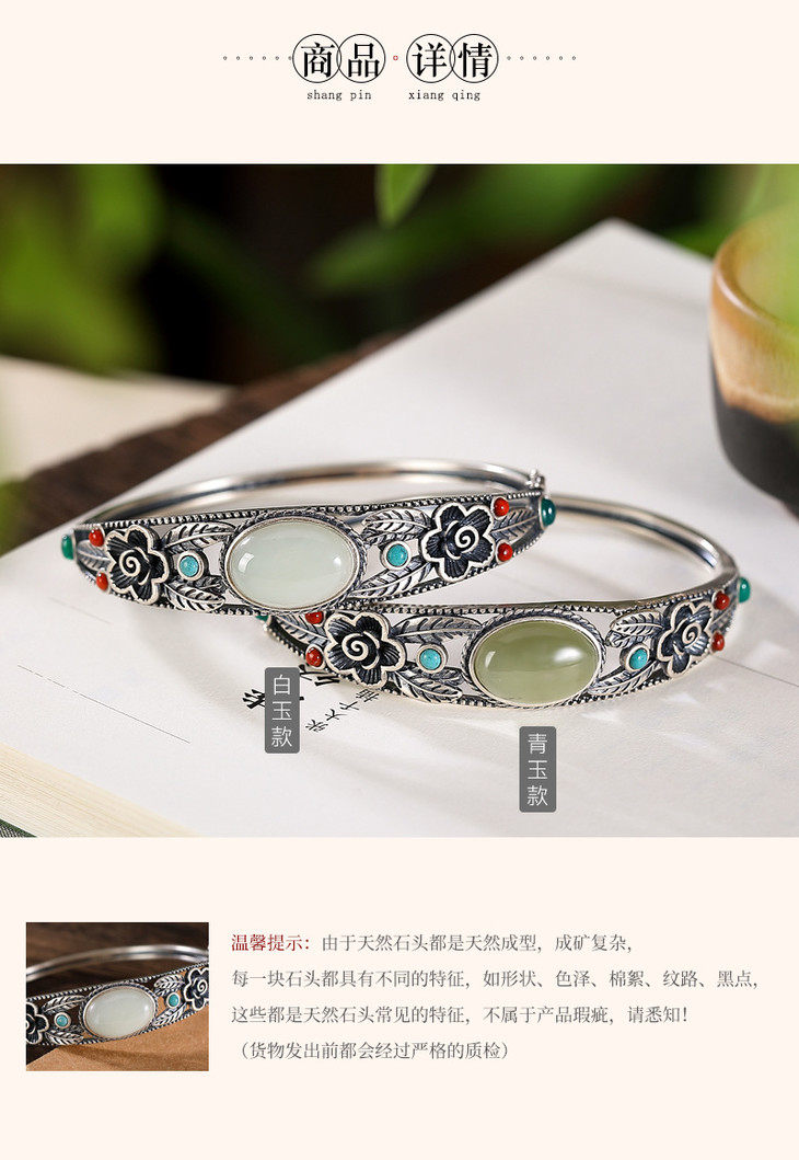 CW-S925纯银,和田玉青玉白玉复古做旧个性梅花开口手镯