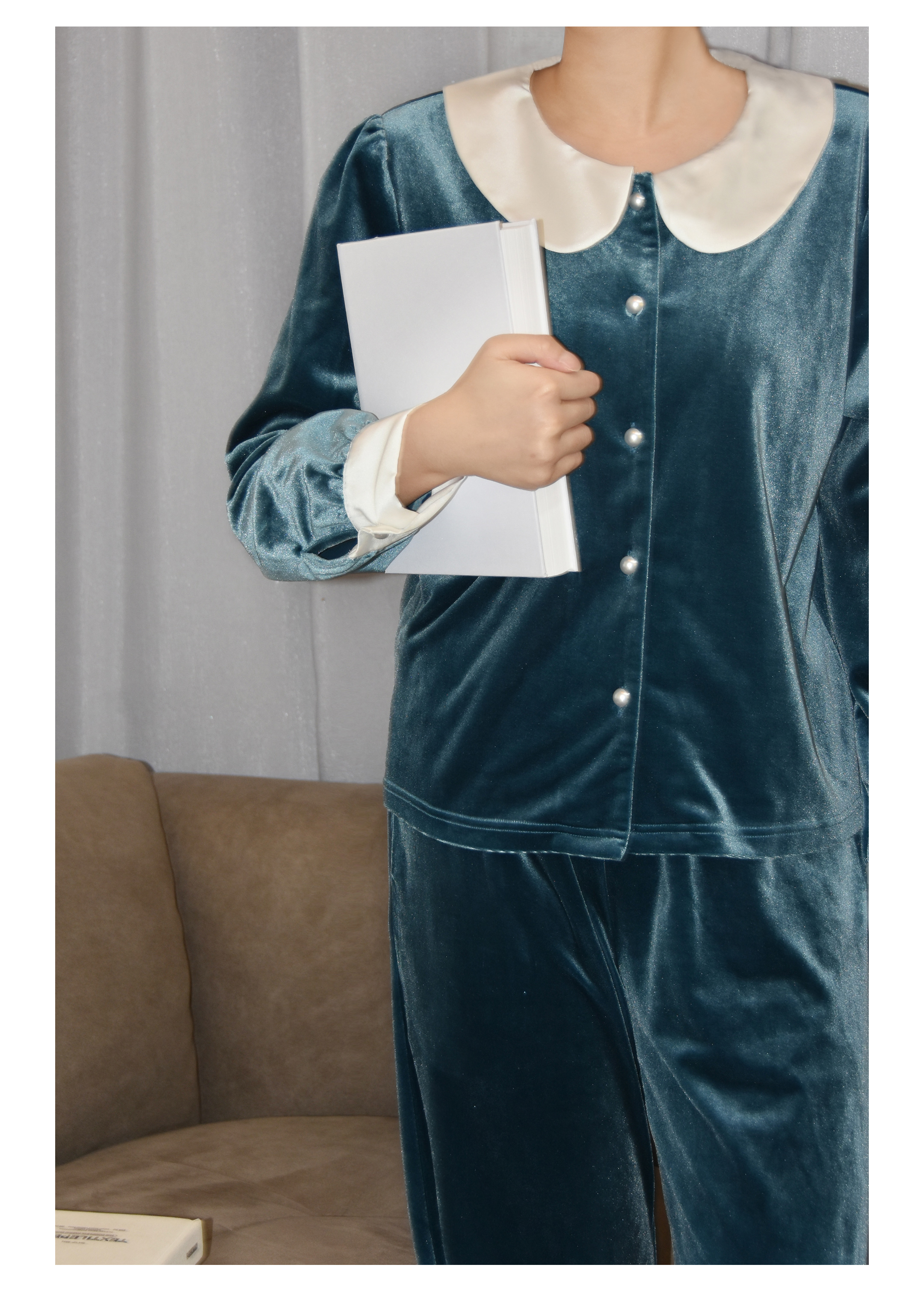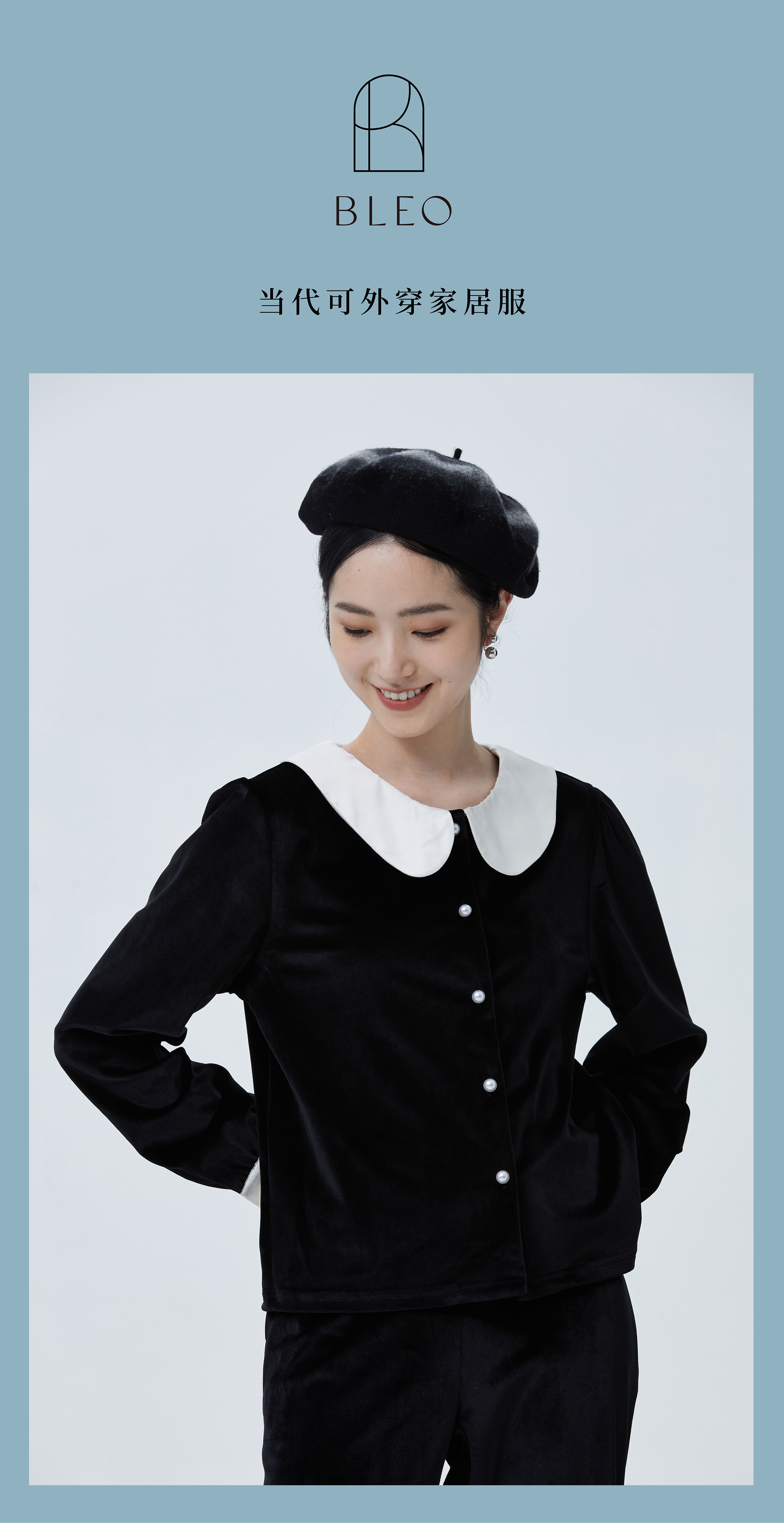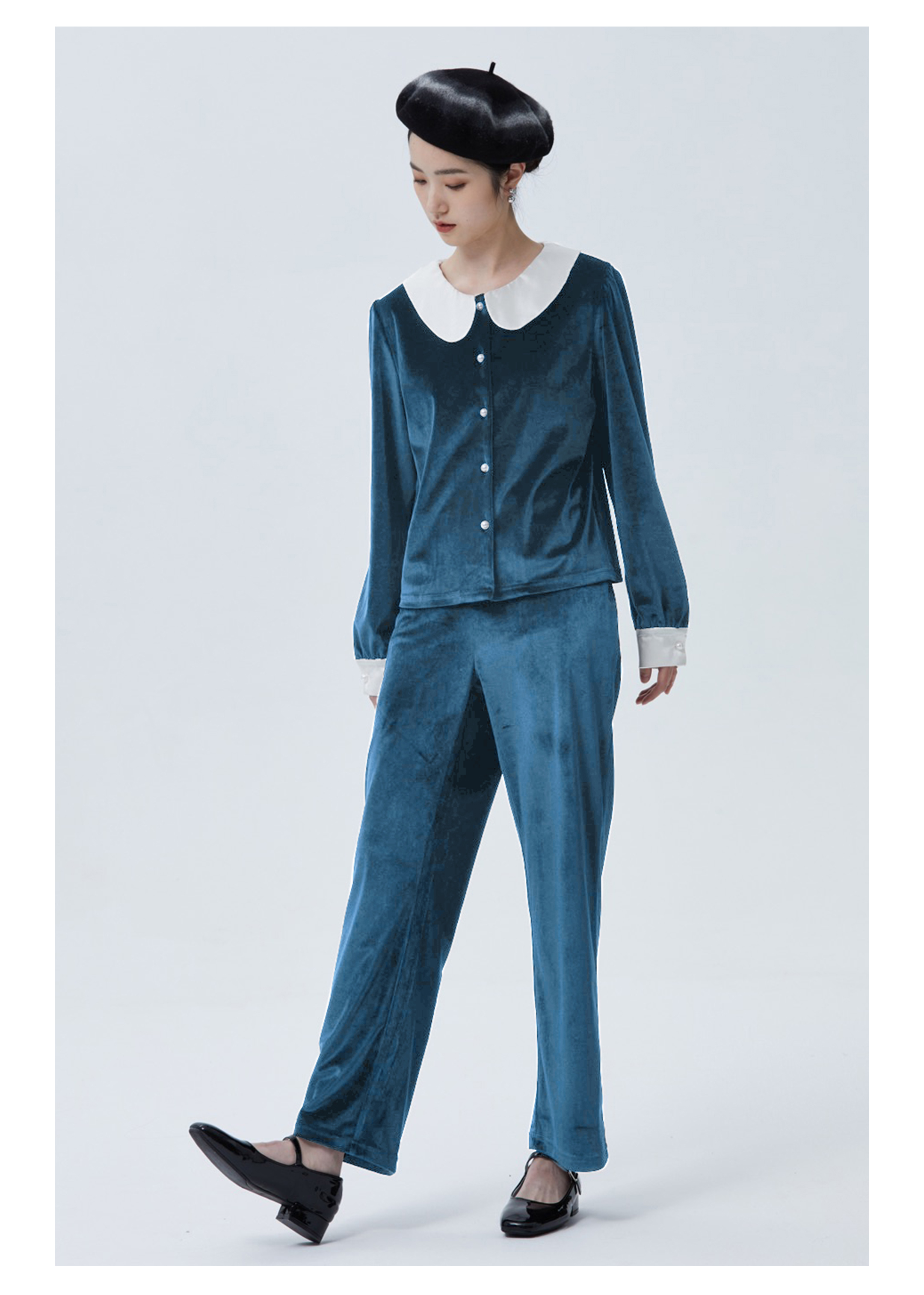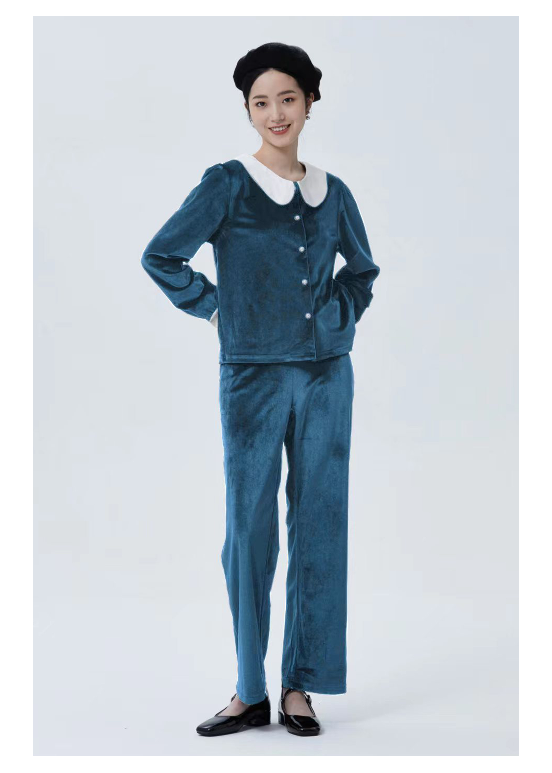 独特别致 BLEO 丝绒娃娃领珍珠纽扣家居服套装