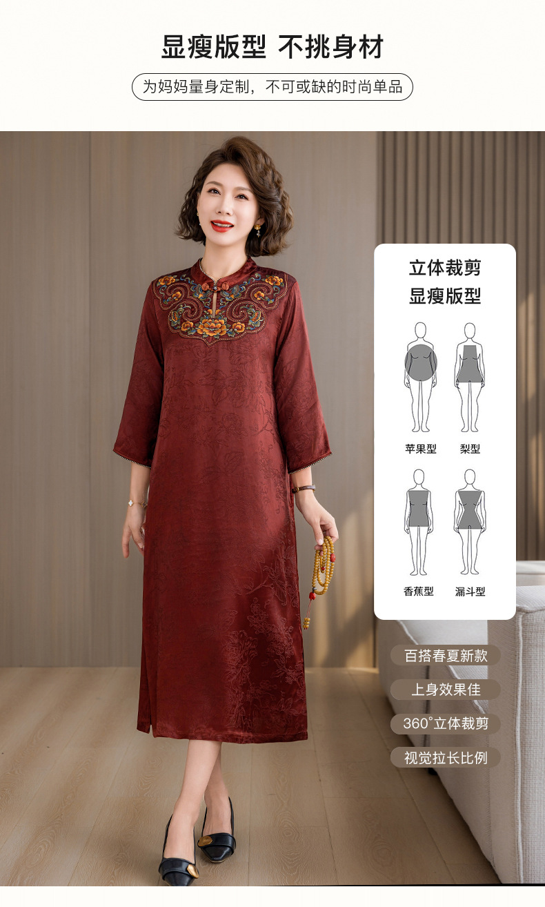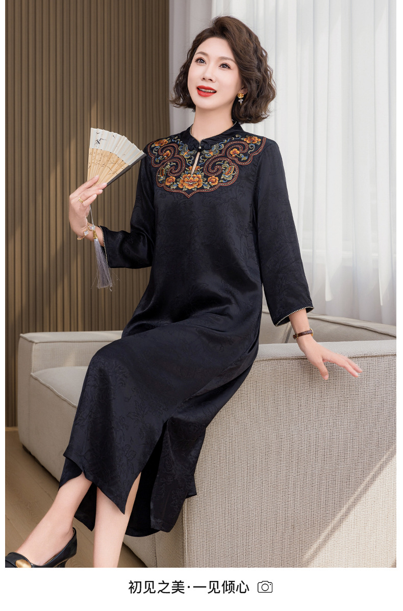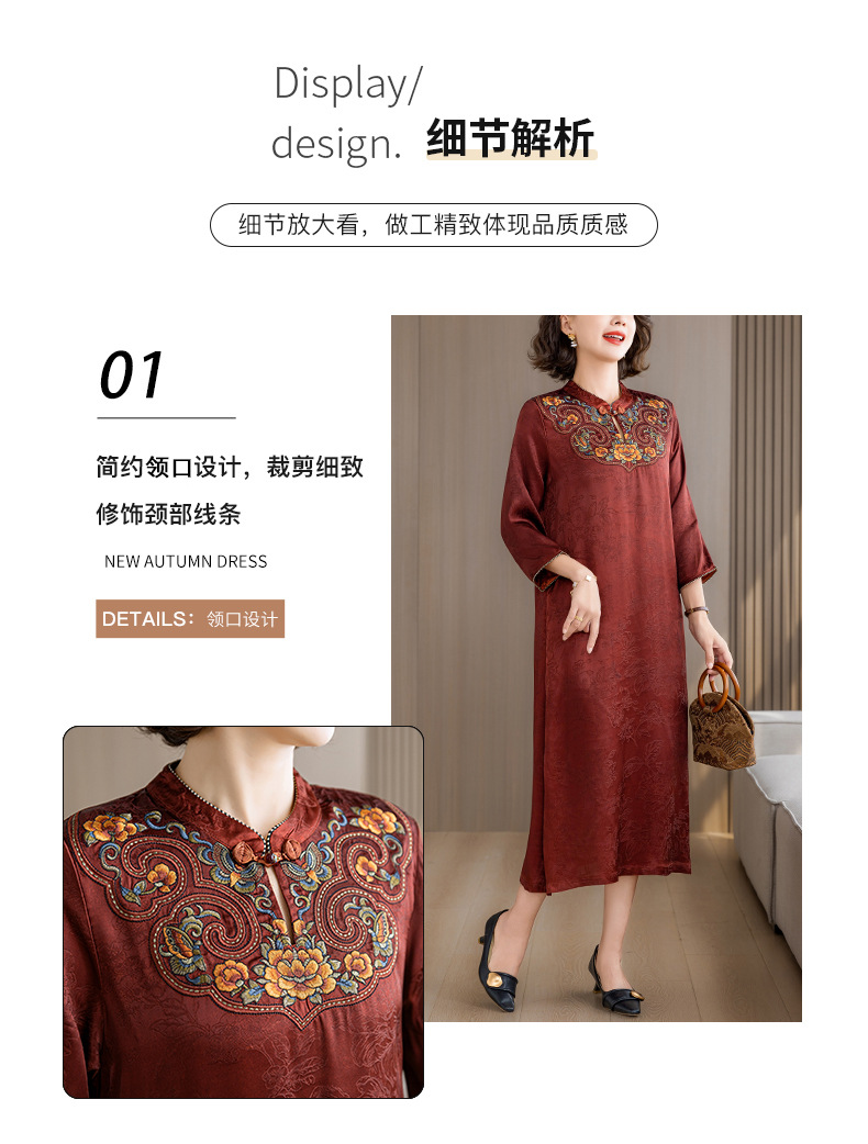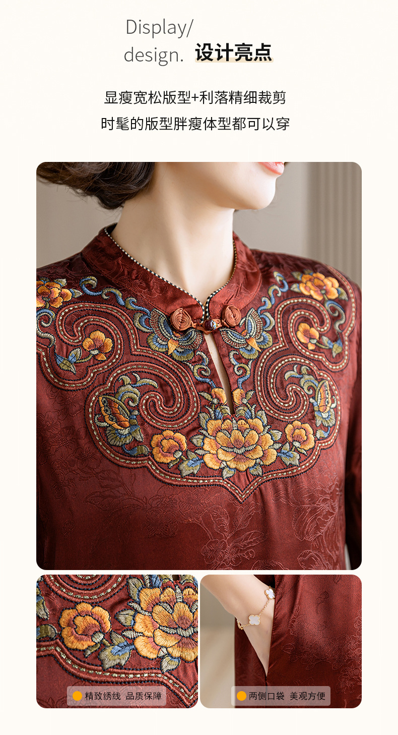 SJ9509 2025春夏新款民族风立领刺绣提花连衣裙中年女装复古大码宽松长裙