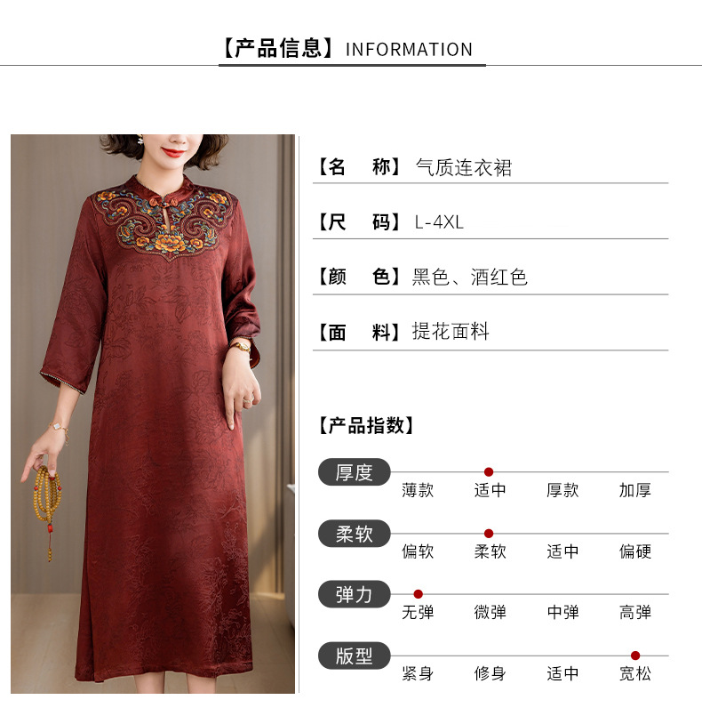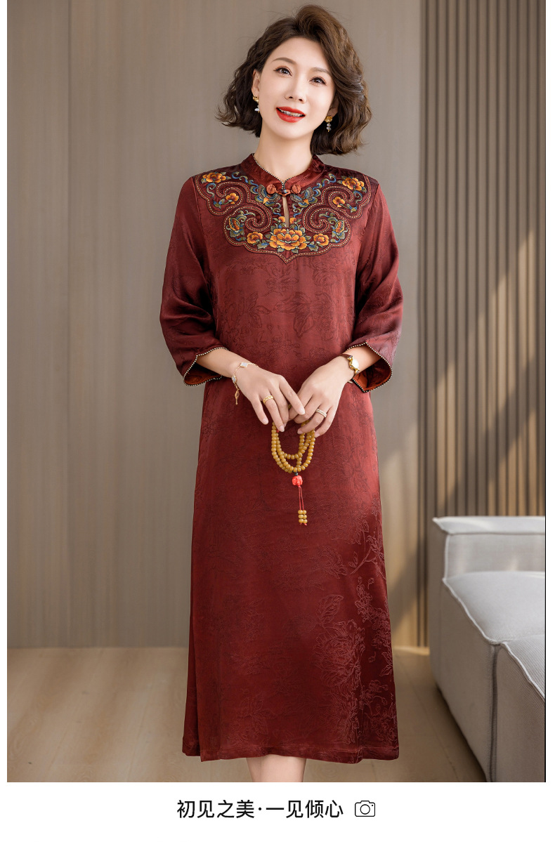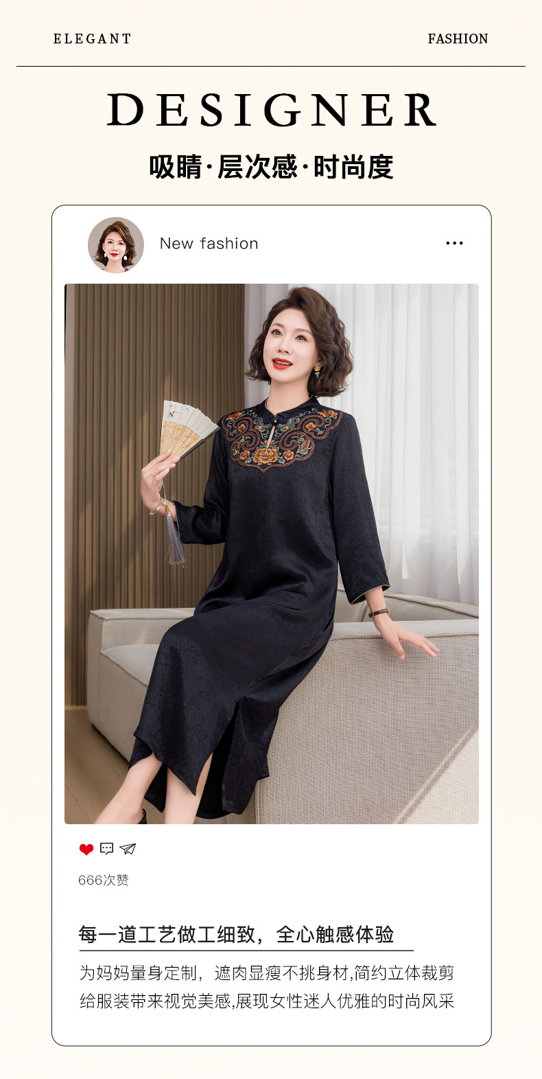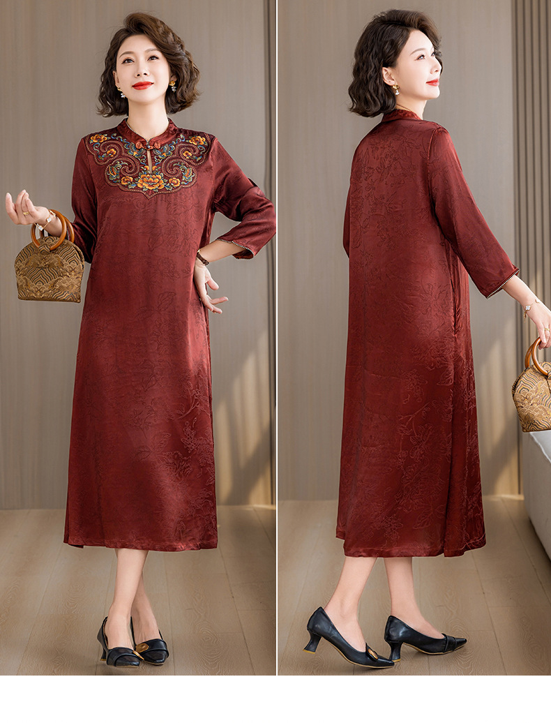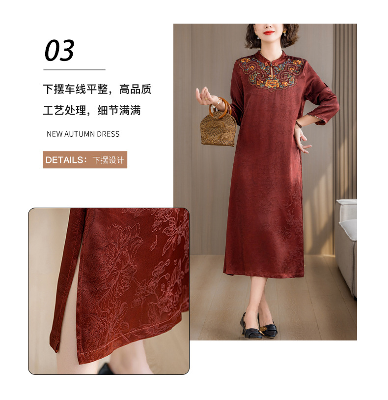 SJ9509 2025春夏新款民族风立领刺绣提花连衣裙中年女装复古大码宽松长裙