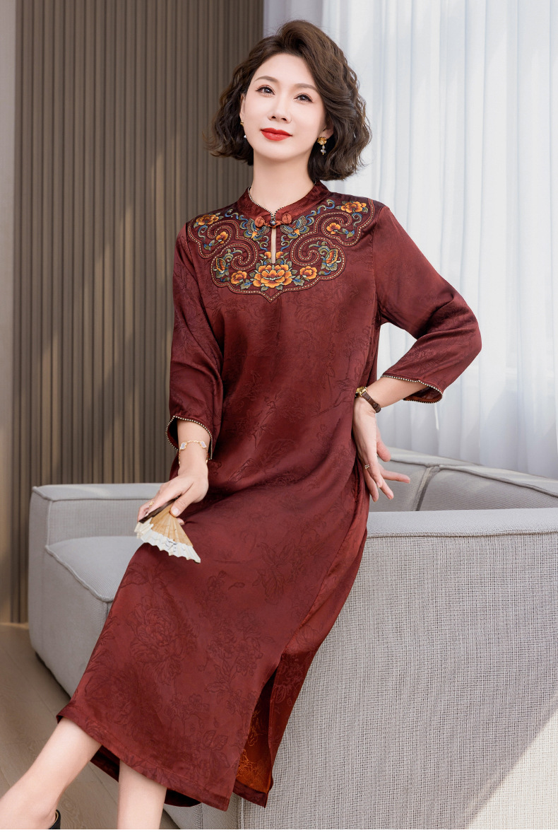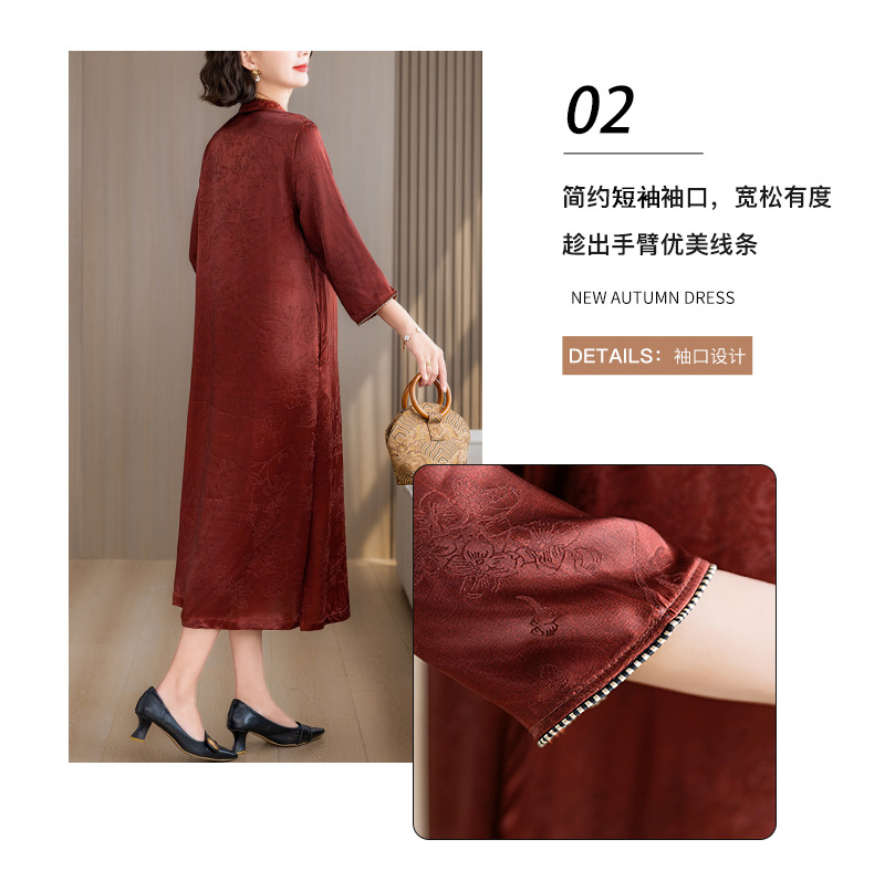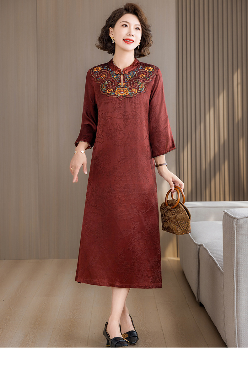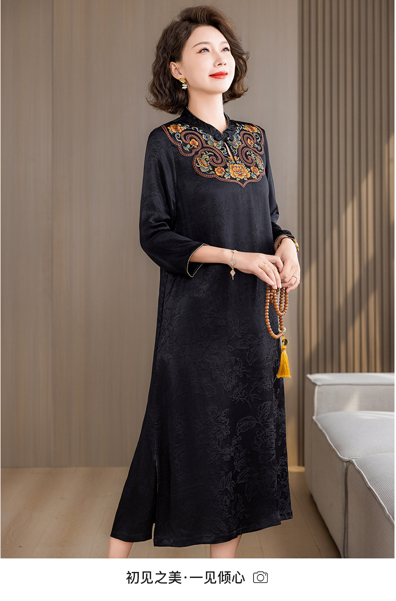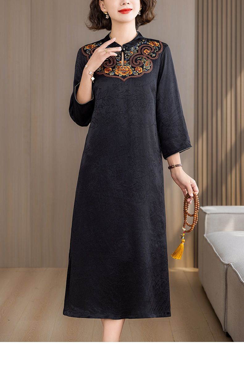 SJ9509 2025春夏新款民族风立领刺绣提花连衣裙中年女装复古大码宽松长裙