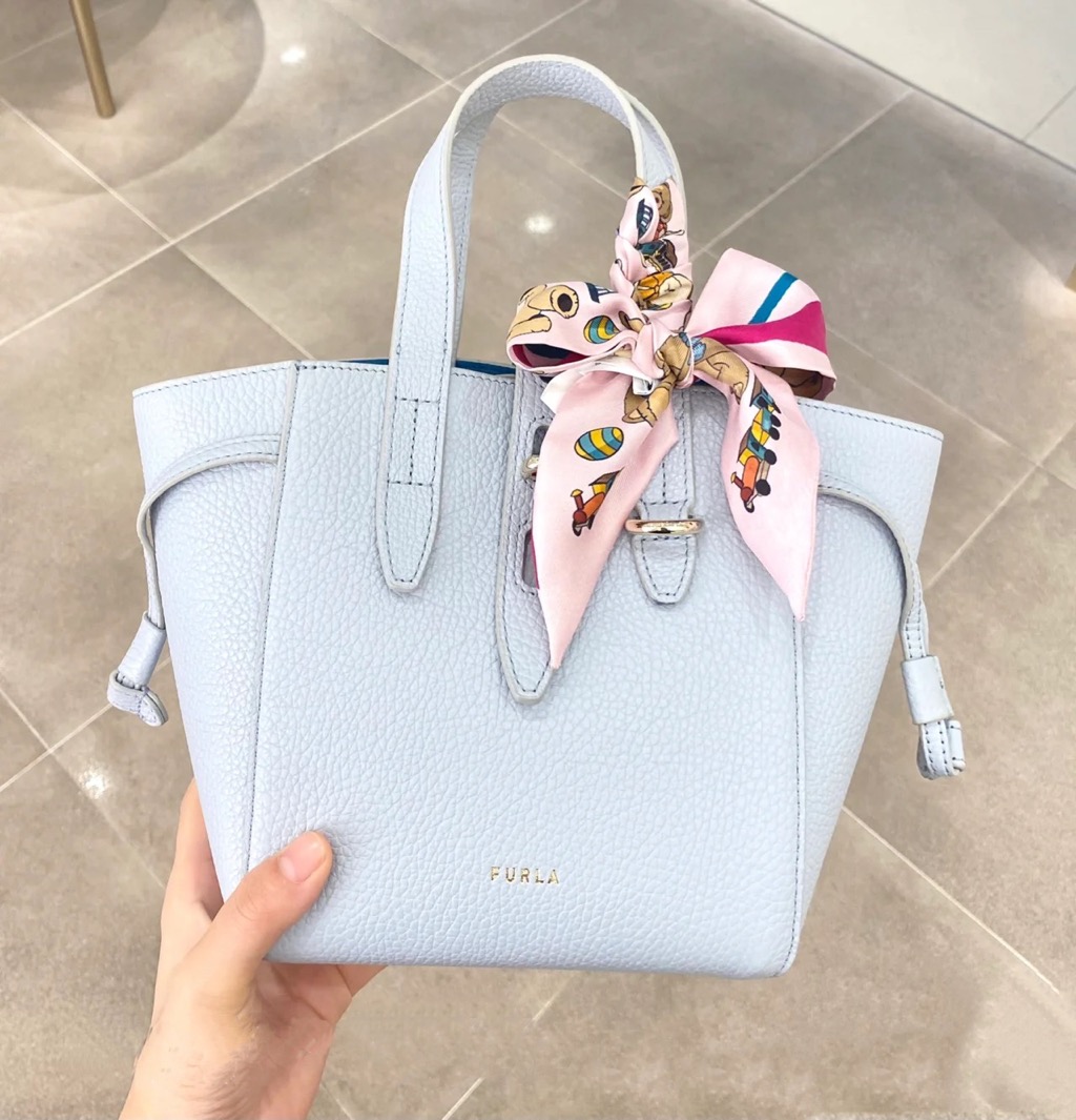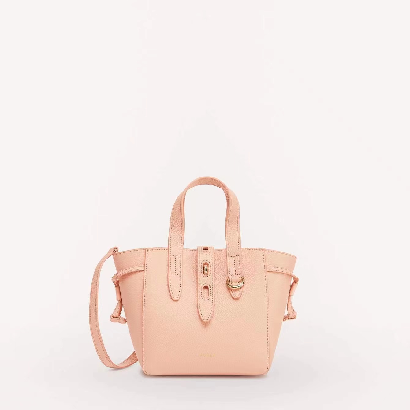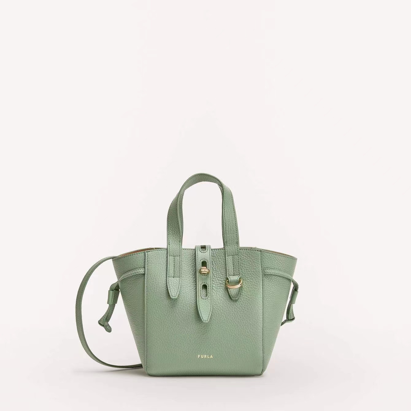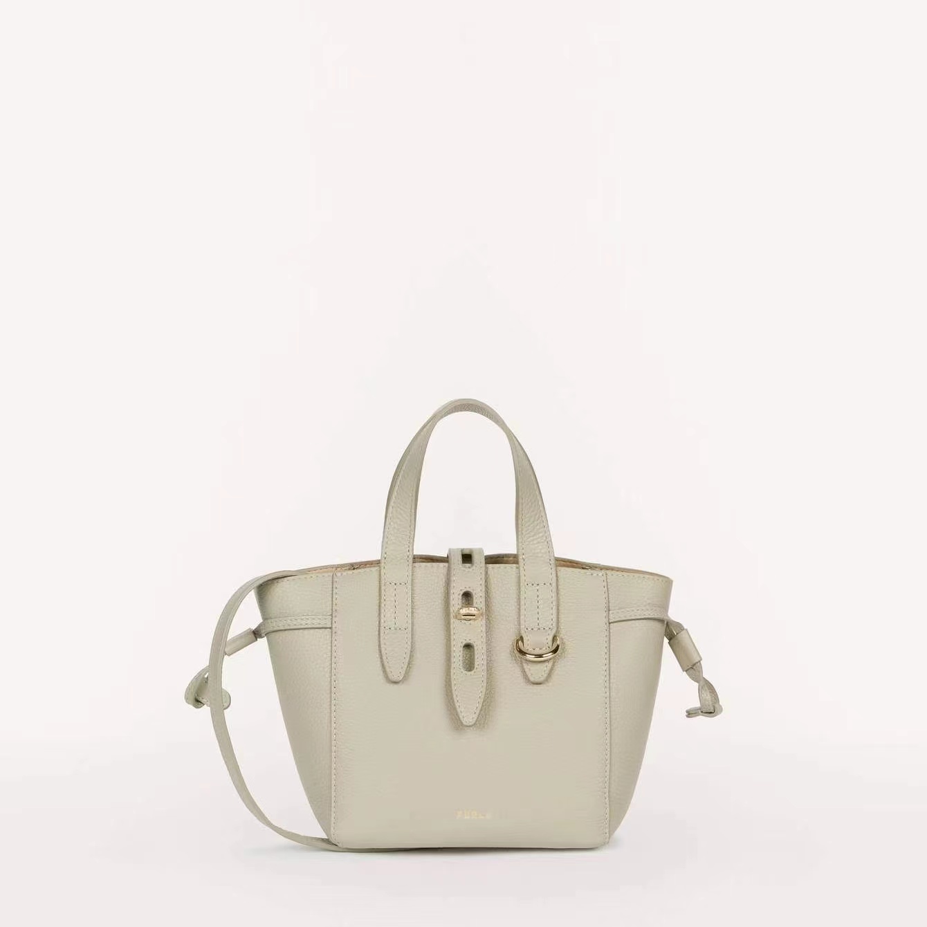 Furla Net托特包,粒纹小牛皮精制。包身可通过侧边皮革抽绳系带轻松调节大小。金属扭锁搭配饰有椭圆形孔眼细节的皮革袢扣,凸显手袋创意风尚。