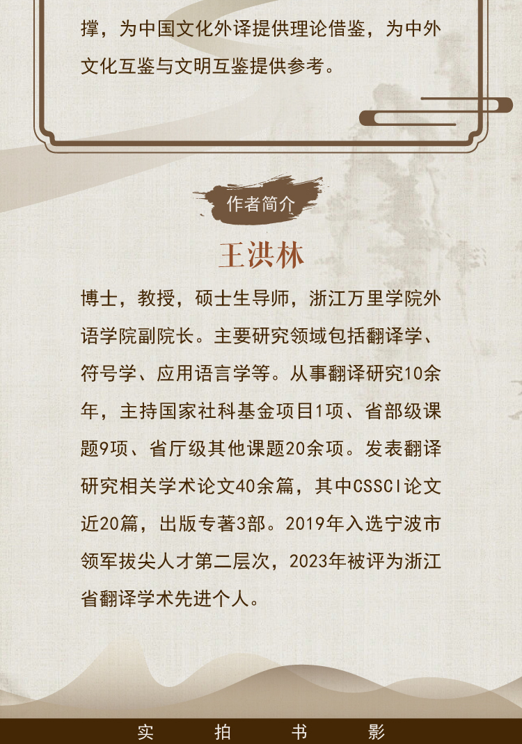 王洪林,博士,教授,硕士生导师,浙江万里学院外语学院副院长。主要研究领域包括翻译学、符号学、应用语言学等。从事翻译研究10余年,主持国家社科基金项目1项、省部级课题9项、省厅级其他课题20余项。发表翻译研究相关学术论文40余篇,其中CSSCI论文近20篇,出版专著3部。2019年入选宁波市领军bajian人才第二层次,2023年被评为浙江省翻译学术先进个人。