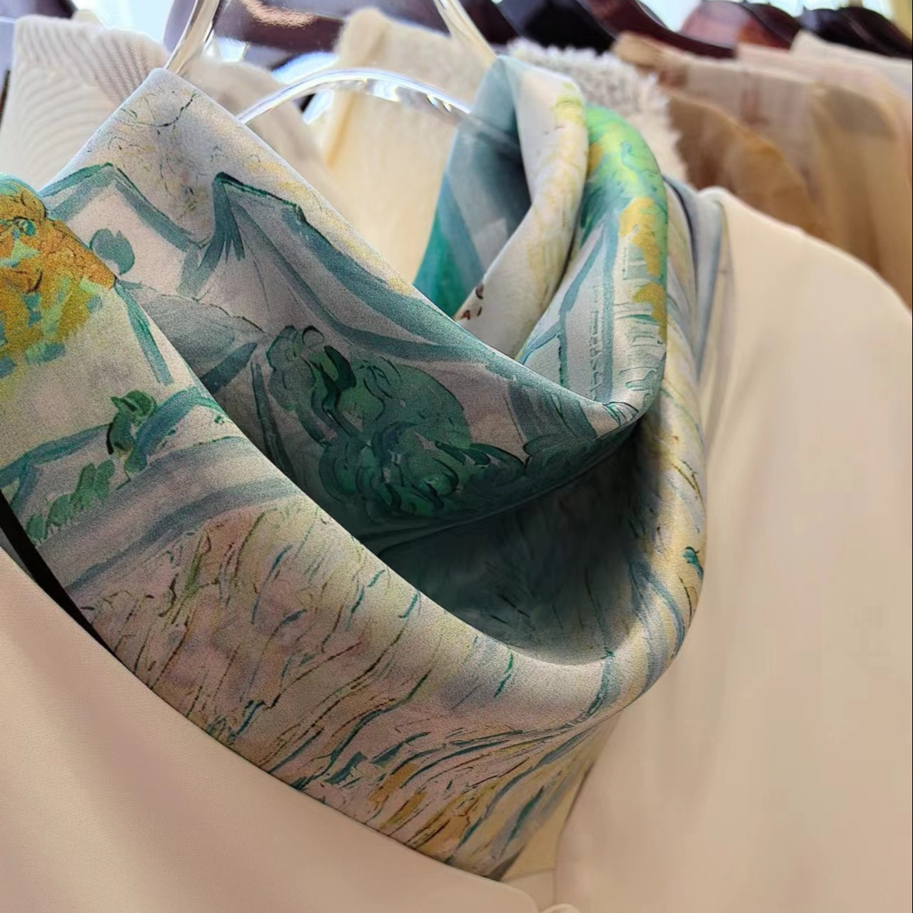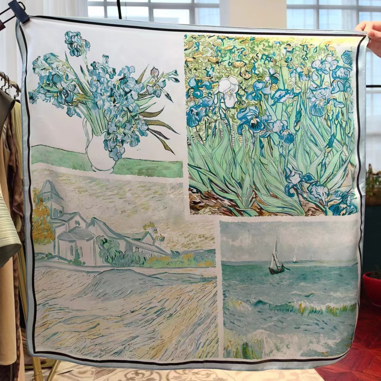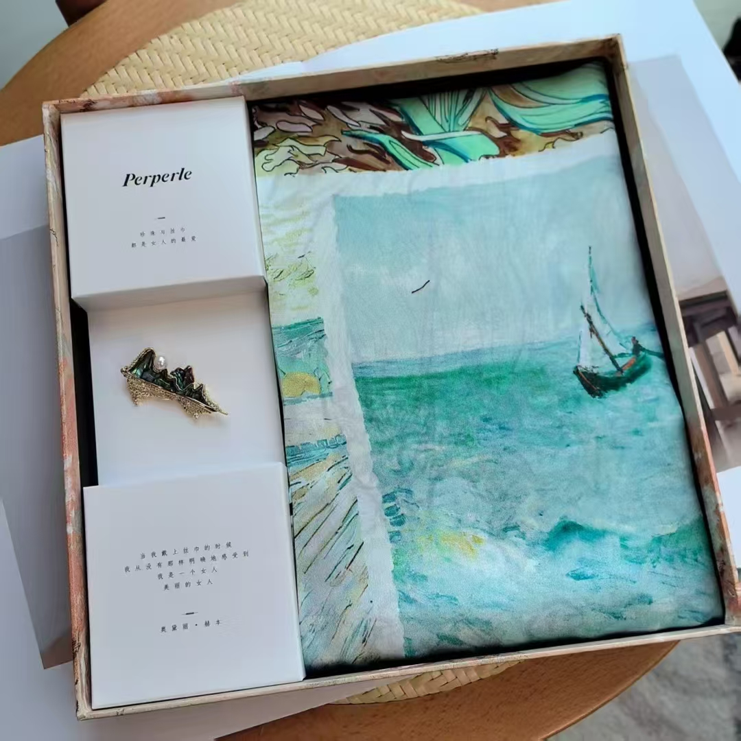 自带清凉降温感的四宫格油画丝巾。