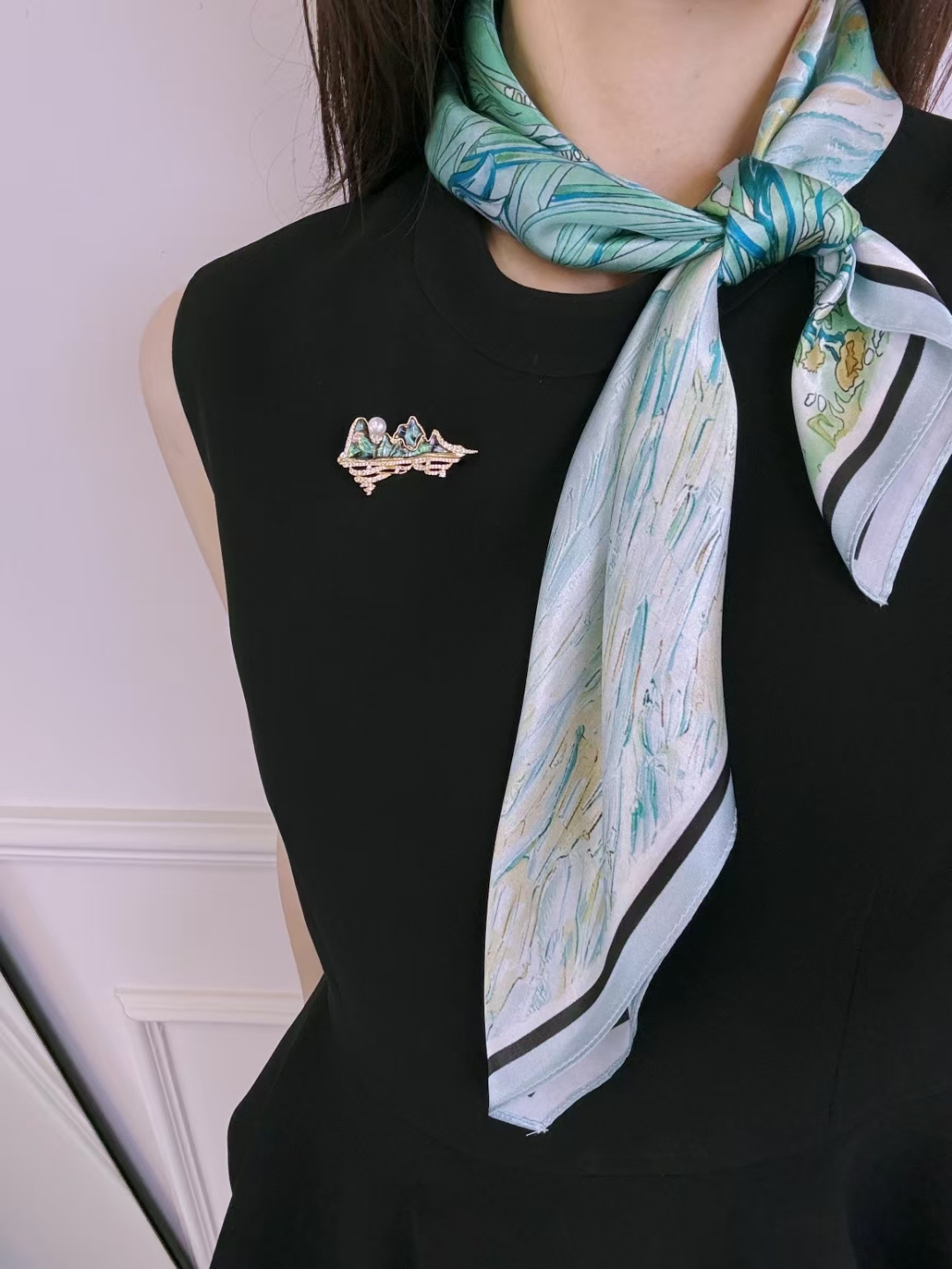【甄珠贝·油画系列】只此青绿 新中式 70cm方巾 纯真丝真丝丝巾+天然珍珠胸针