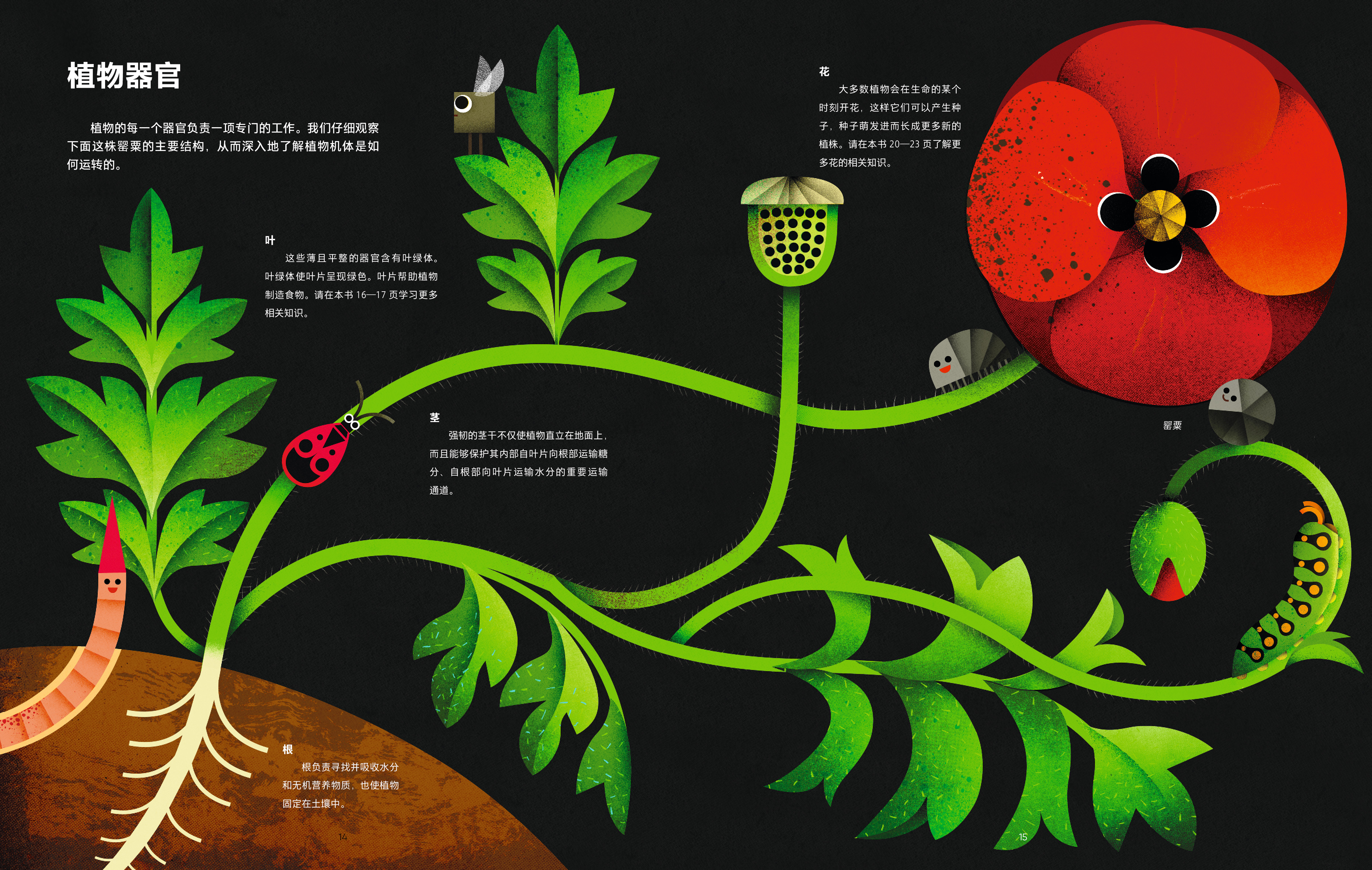 ◎ 创意插画简洁而富有童趣,小读者可以跟随插画里的虫子家族在植物世界开始冒险