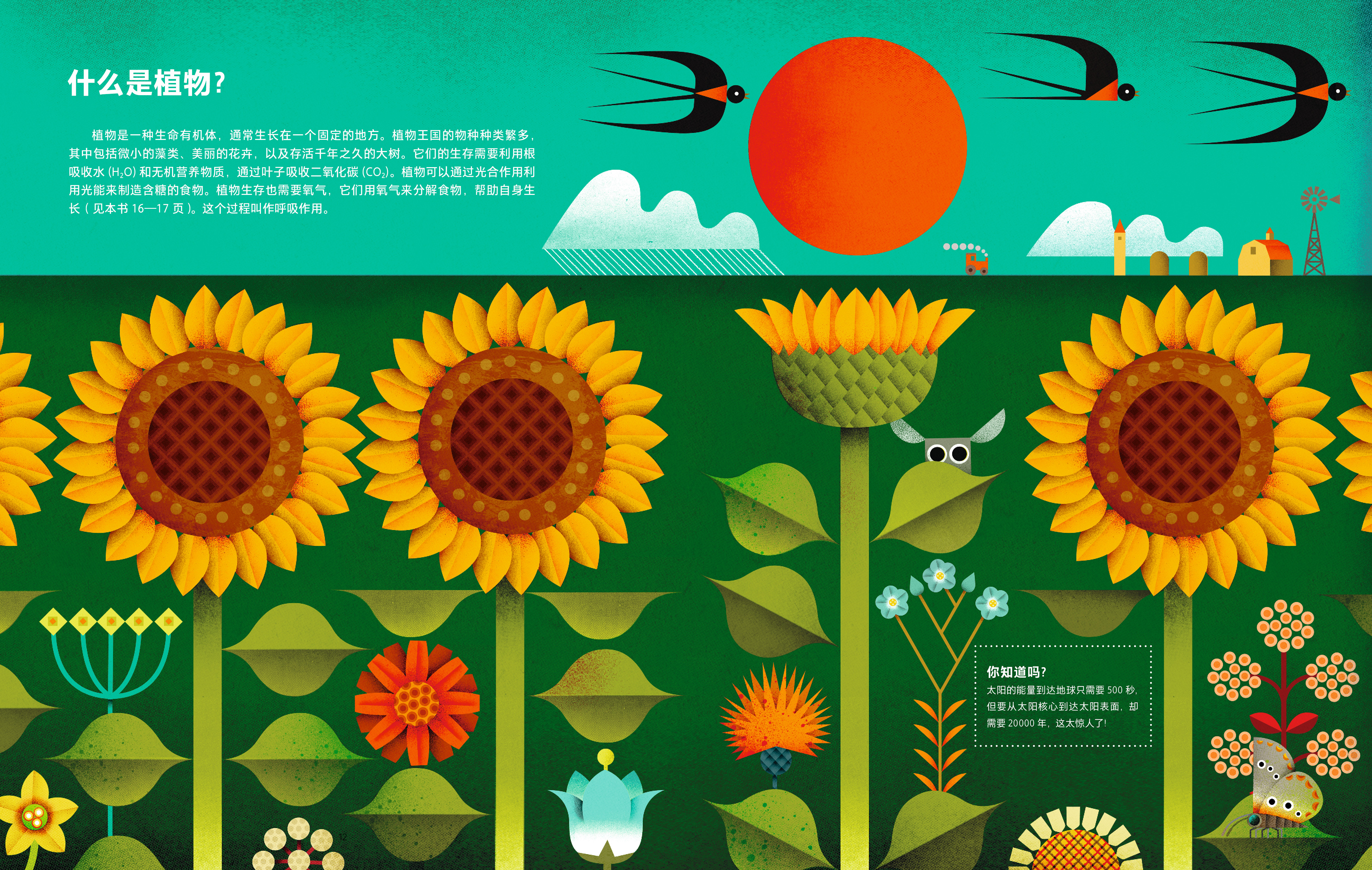 博洛尼亚插画奖得主菲利普·乔达诺的插画极具个人风格,充满几何图形和丰富色彩,在本书中,他为小读者专门设计了一只方形小飞虫,让小读者可以变身昆虫,从封面、内文直到封底,穿梭在各种植物中间,学习相关知识。也能与书中其他与植物亲密共居的小动物相遇——会变色的毛毛虫、蜗牛、带三角帽的蚯蚓、可以变换形状的潮虫等。