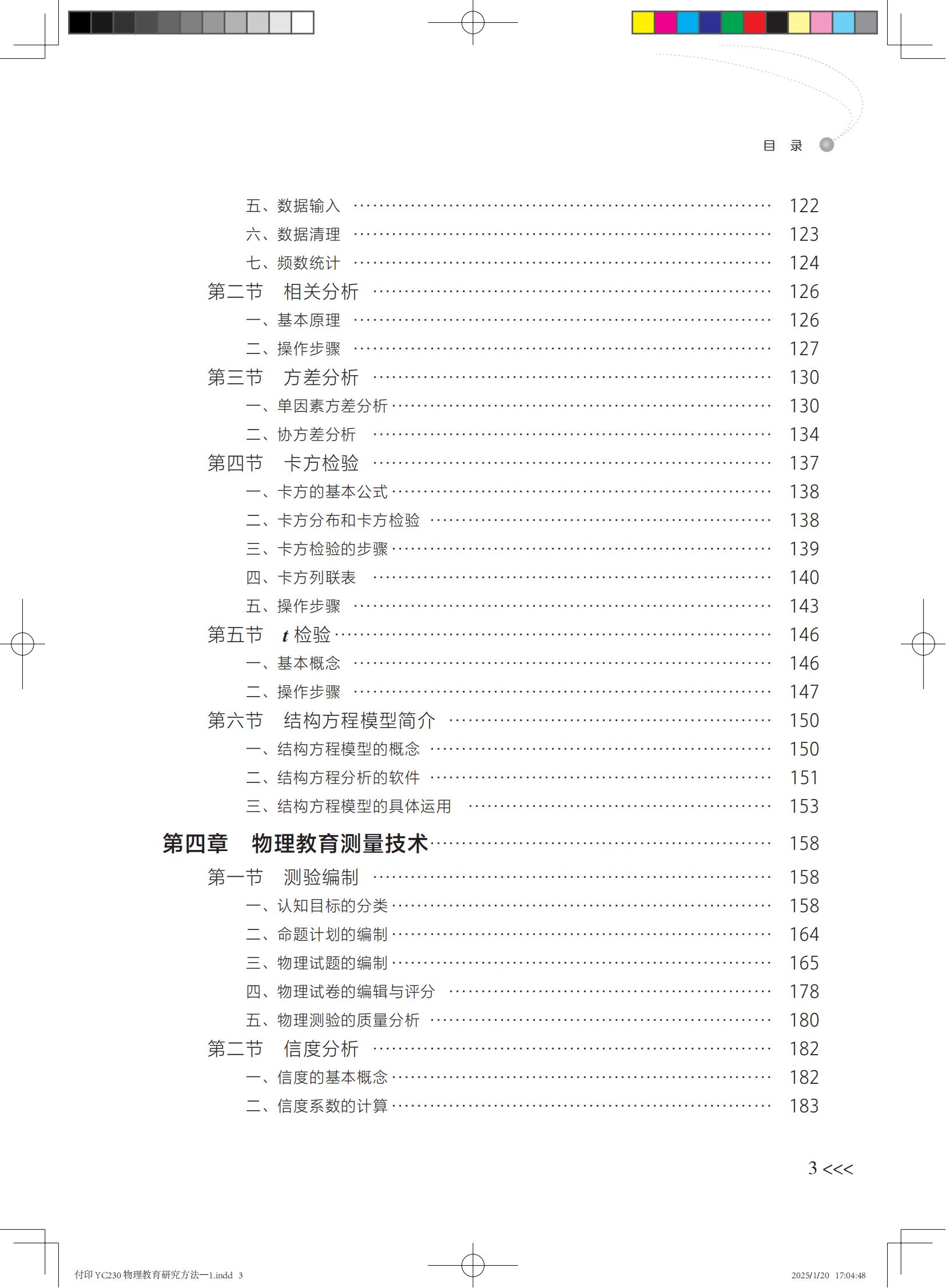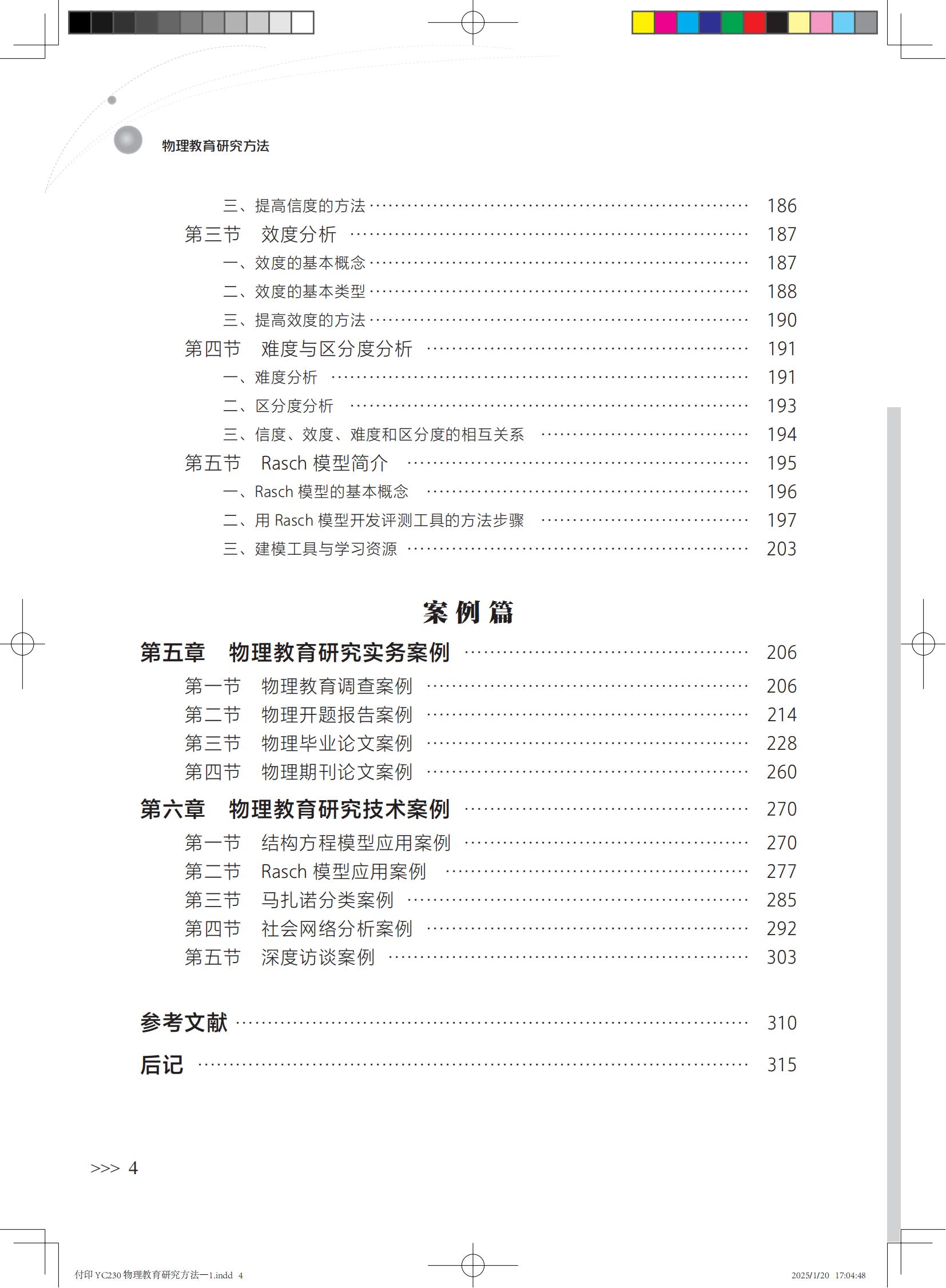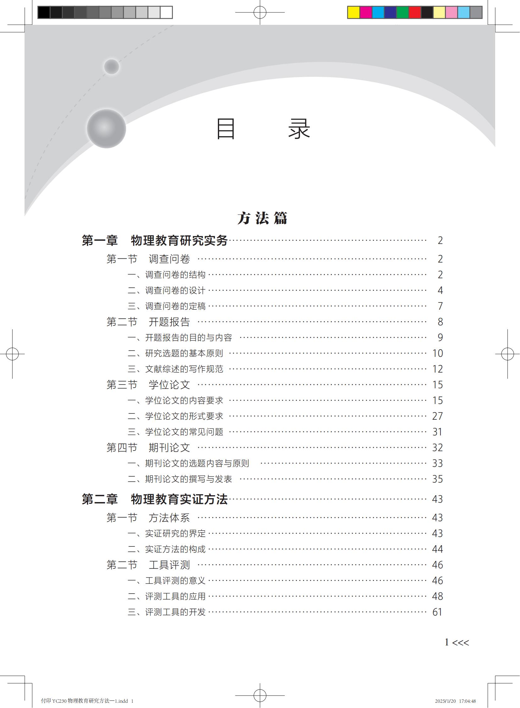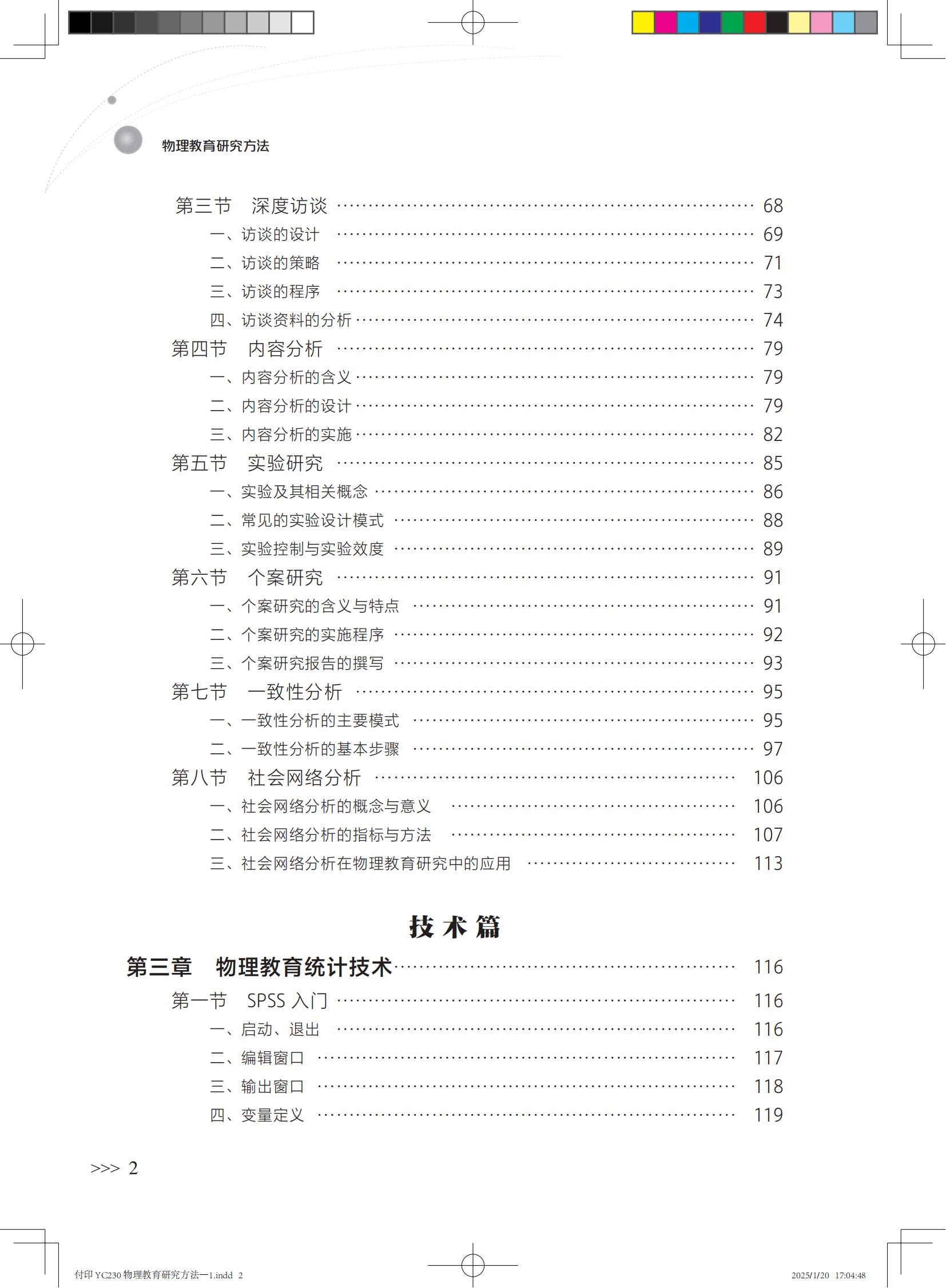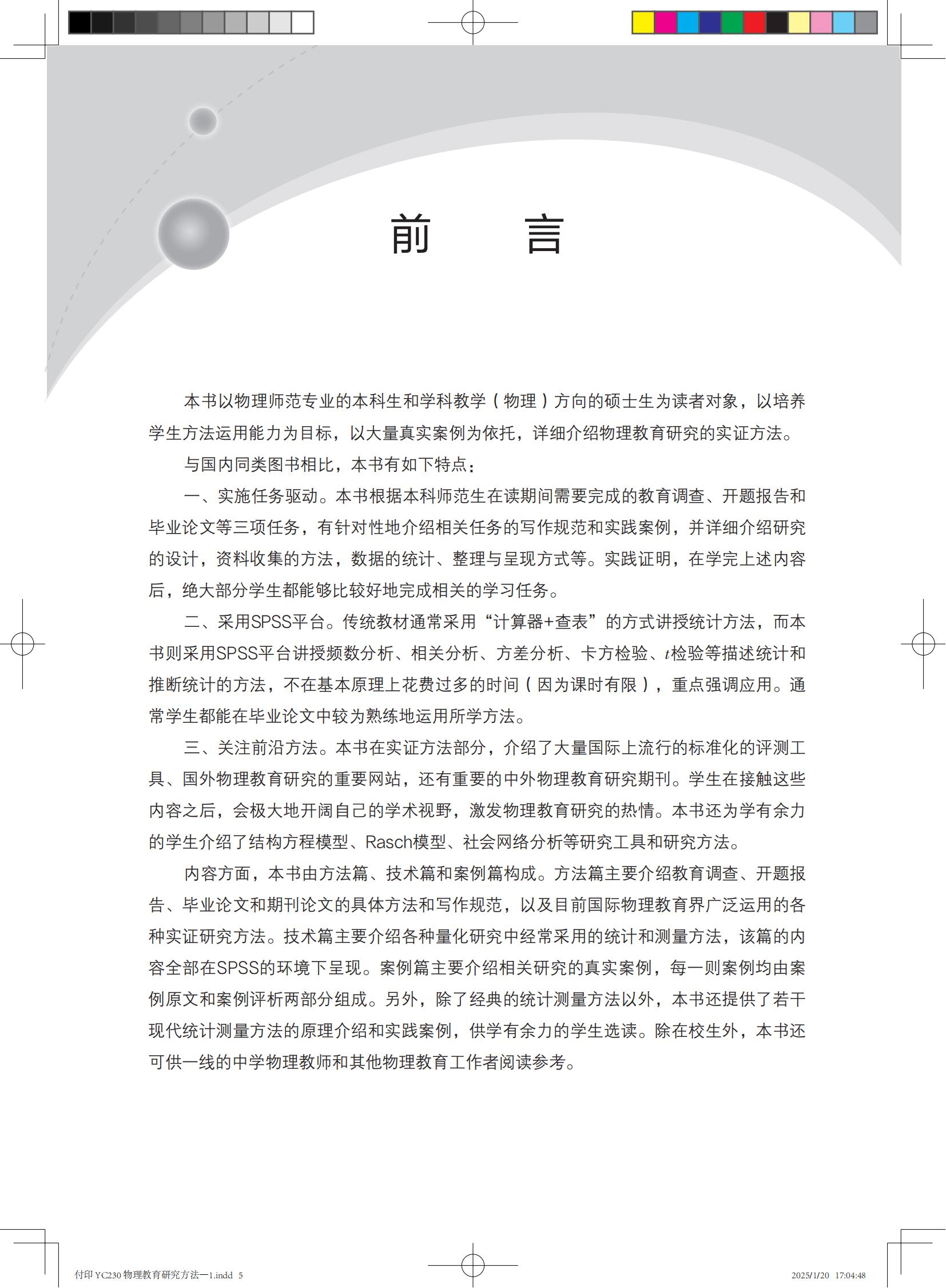 本书由方法篇、技术篇和案例篇等三篇构成。“方法篇”主要介绍本科生和硕士生在读期间所必须完成的教育调查、开题报告和毕业论文的具体方法和写作规范,以及目前国际物理教育界广泛运用的各种实证研究方法;“技术篇”则主要介绍各种量化研究中经常采用的统计和测量方法,该篇的内容全部在SPSS统计分析软件环境下进行;“案例篇”主要介绍由教师和学生所做相关研究的真实案例,每一则案例均由案例原文和案例评析两个部分组成。另外,除了经典的统计测量方法以外,本书还提供了若干现代统计测量方法的原理介绍和实践案例,供学有余力的师生选读。